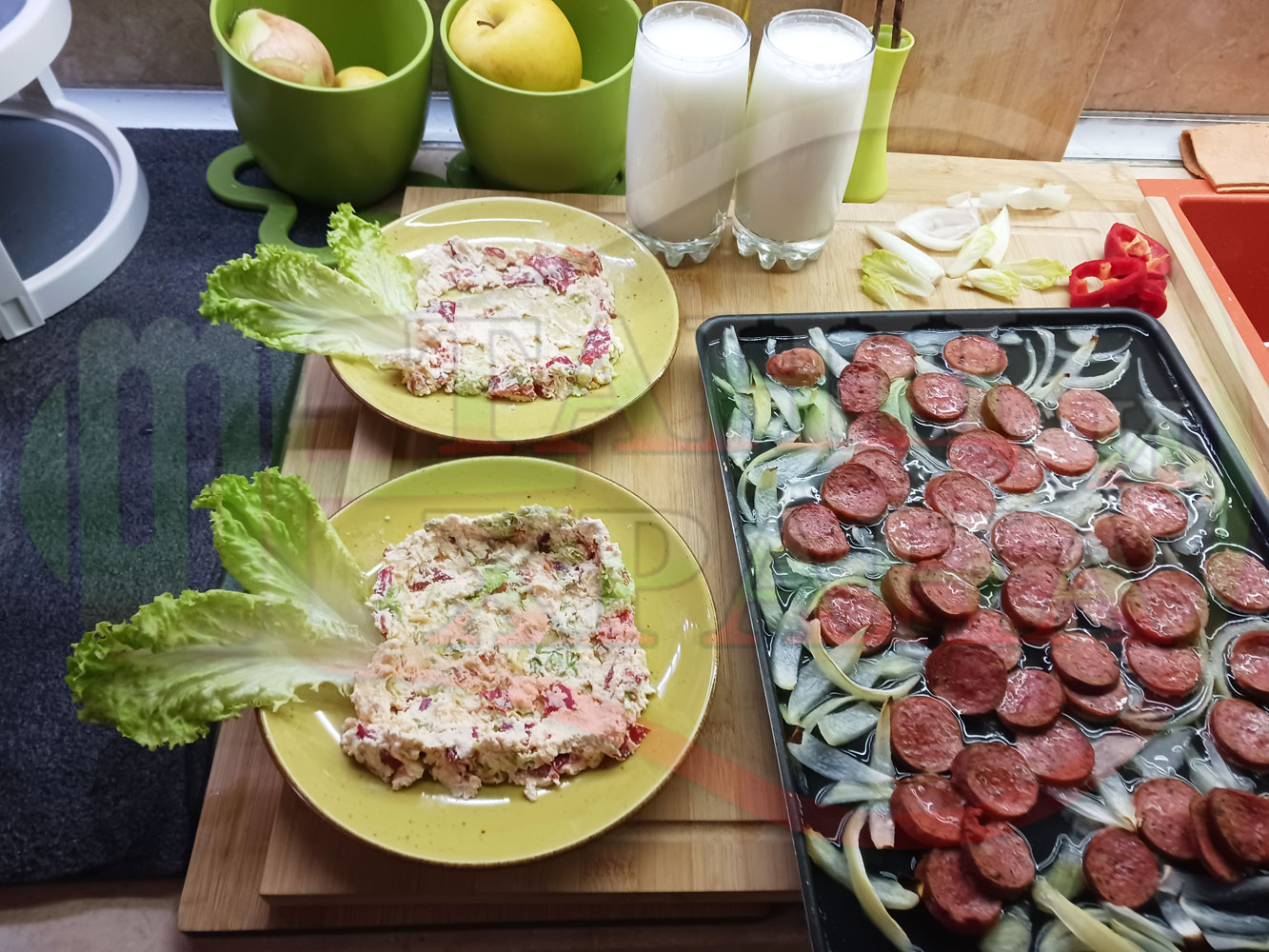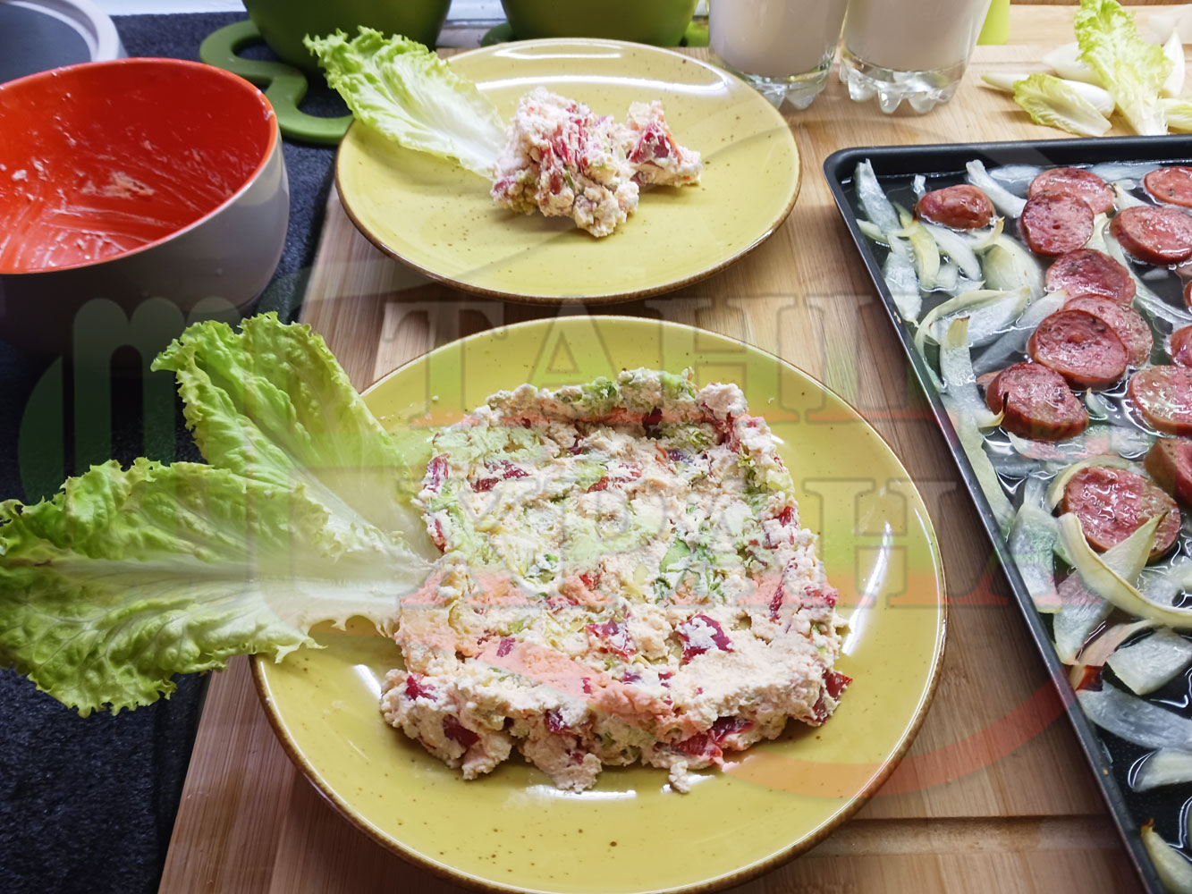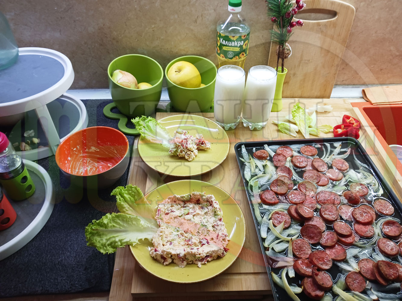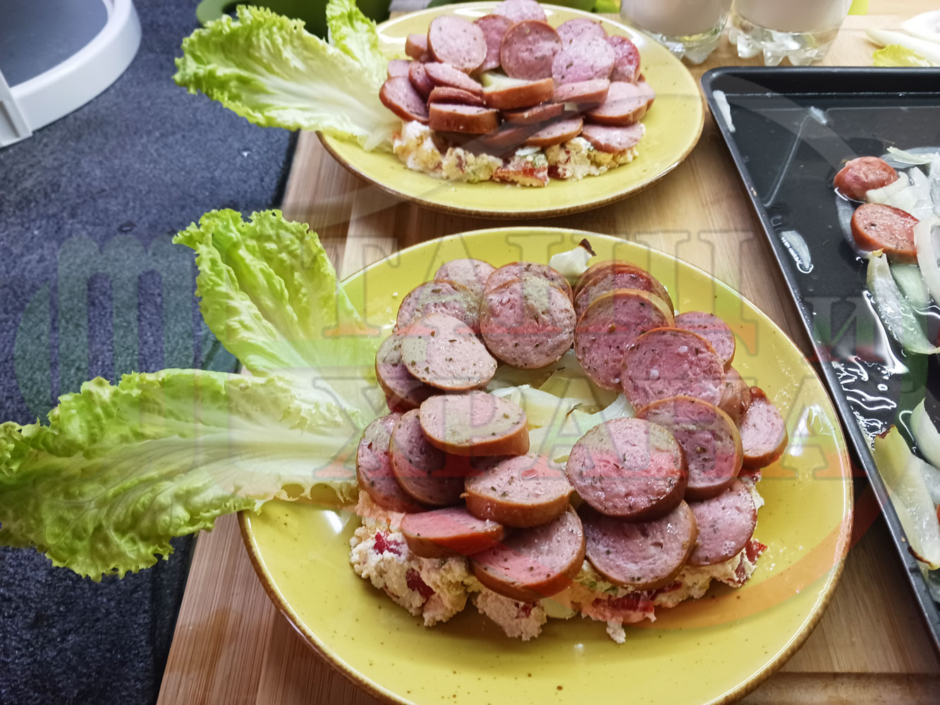Българска лучена яхния "Родопсконаденицова пиперковомарулена с БГсирене" запечена на фурна с наденица и кромид лук гарнирана в кладенчета от сиренов крем с червени пресни чушки, маруля и краве бяло сирене (българско, саламурено) - двукомпонентна