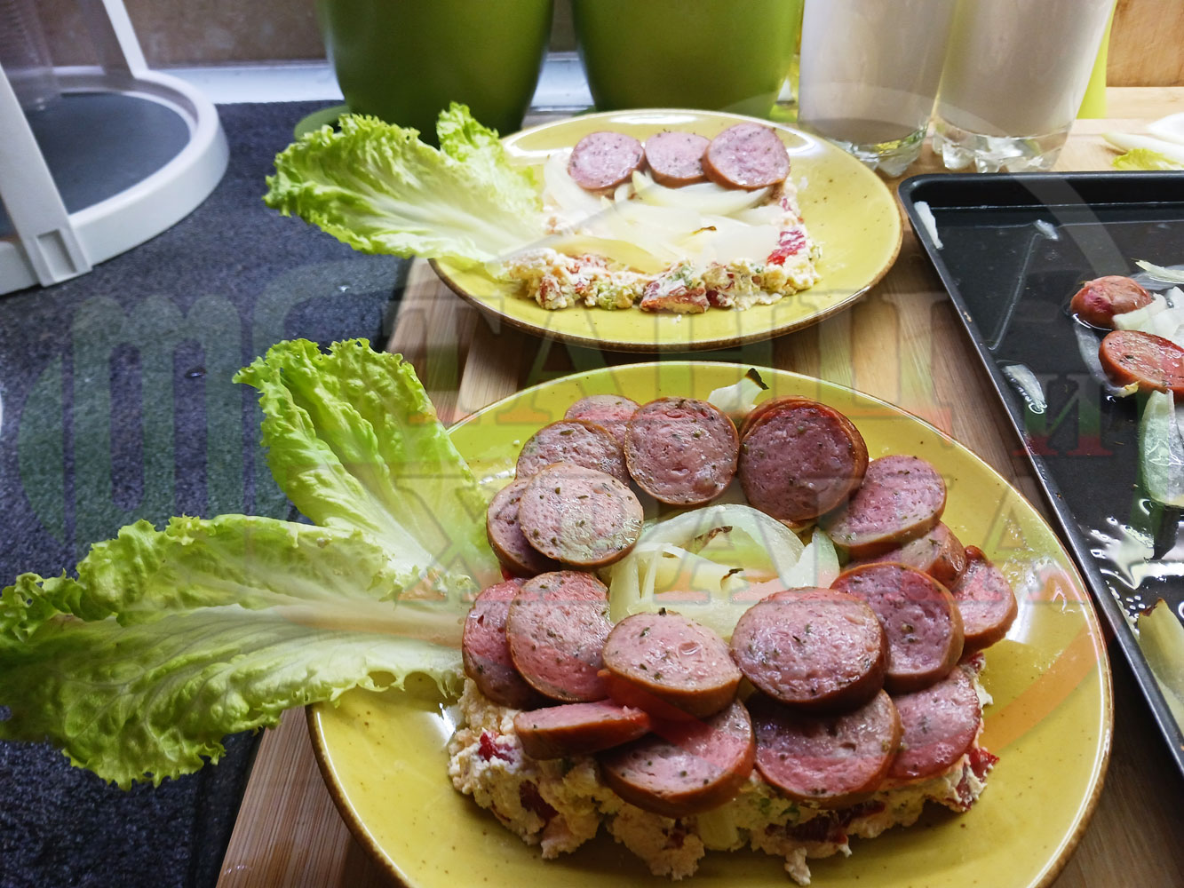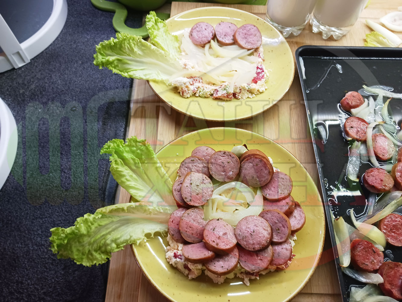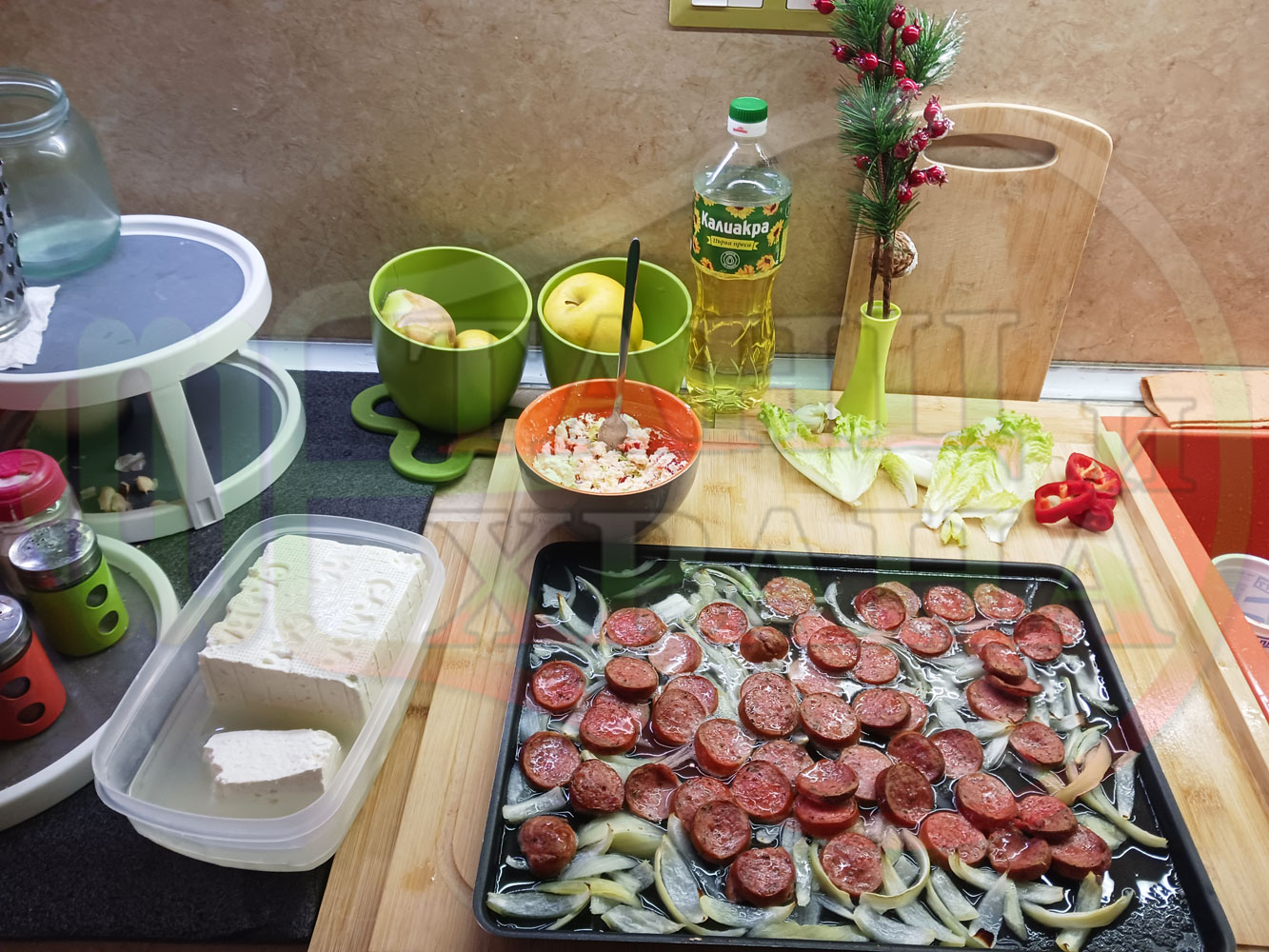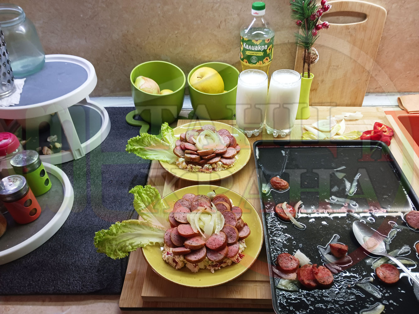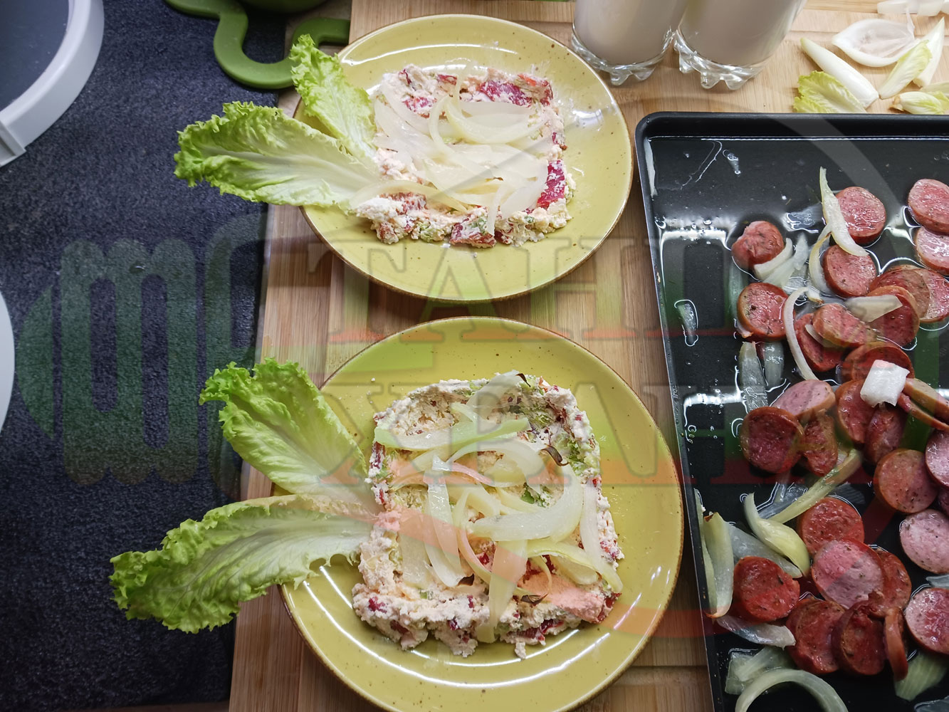 Българска лучена яхния "Родопсконаденицова пиперковомарулена с БГсирене" запечена на фурна с наденица и кромид лук гарнирана в кладенчета от сиренов крем с червени пресни чушки, маруля и краве бяло сирене (българско, саламурено) - двукомпонентна