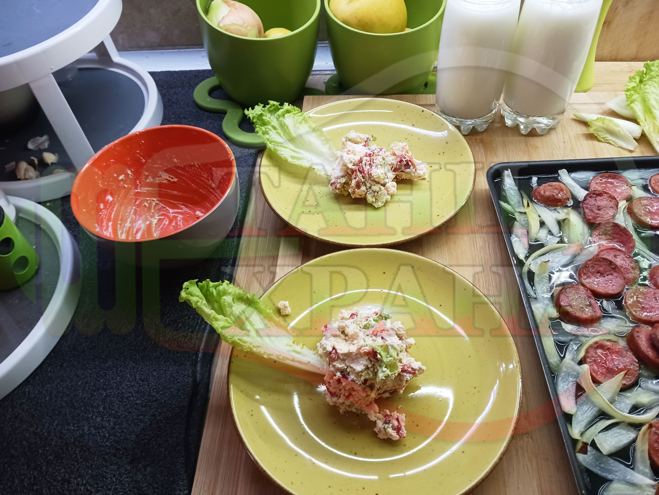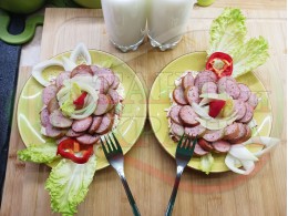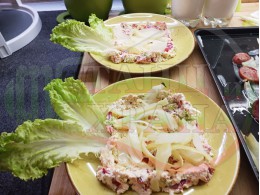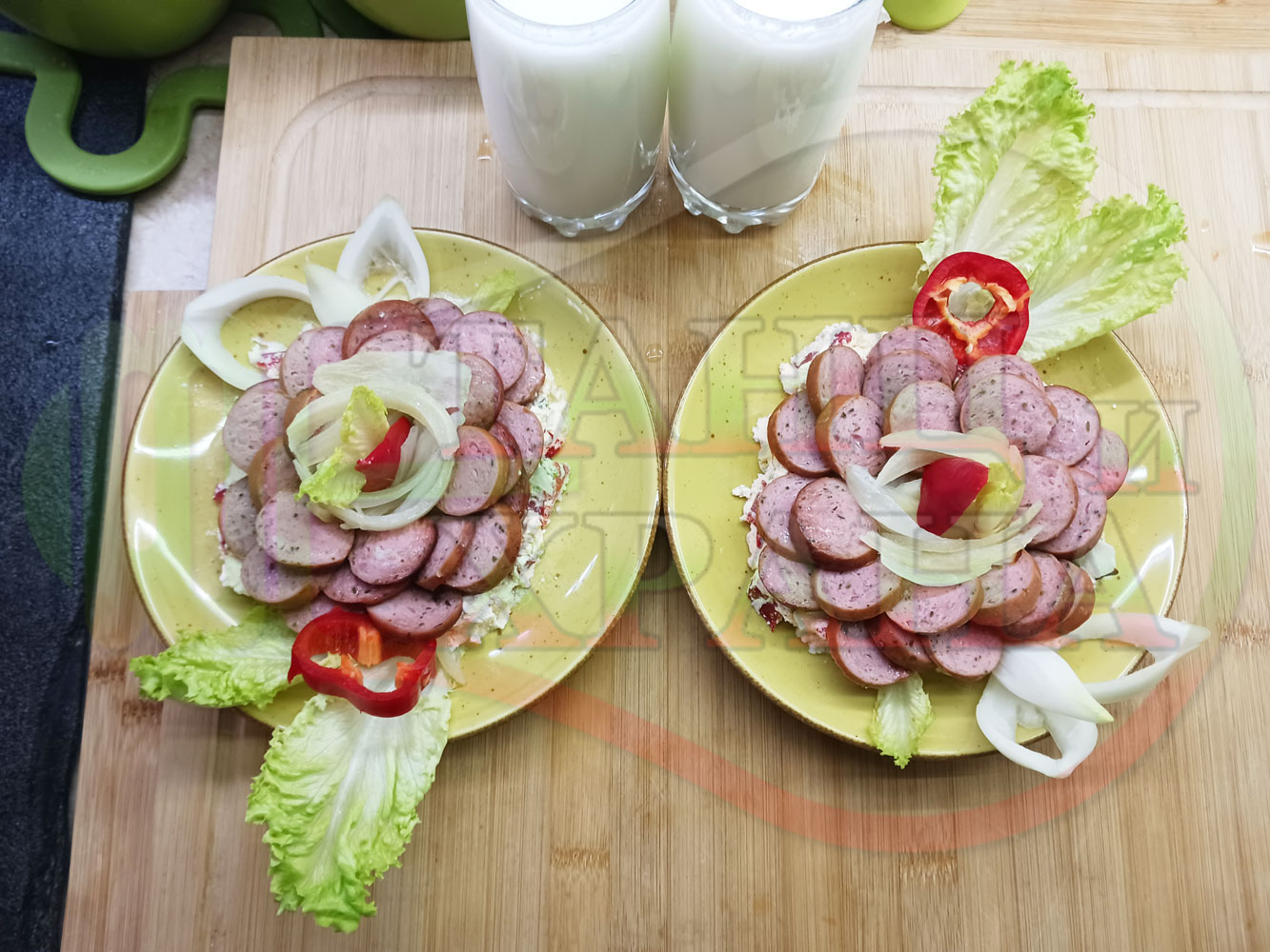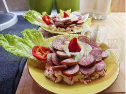 Поставете по 2 по-големи листа от марулята (от заделените) във всяка чиния и разпределете сиреновия крем в средата на чиниите. Оформете от крема средно широки и средно високи "кладенчета", така че да задържат наденицата. Сипете равномерно количество от лучената яхния в кладенчетата и подредете еднакъв брой кръгчета от наденицата по вътрешността на кладенчетата, така че в центъра да се вижда малка част от лучената яхния. Украсете порциите с малките, вътрешни и крехки листа от марулята, с чушковите обръчи и връхчета и с вътрешната част на кромид лука (украсете порциите по ваше желание и усмотрение).