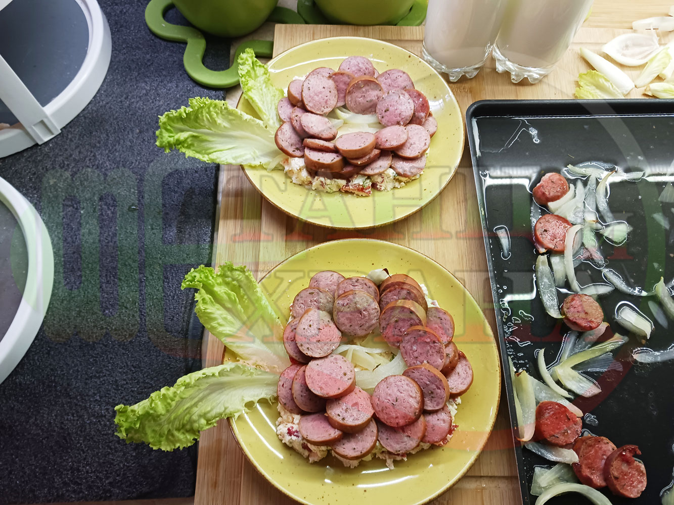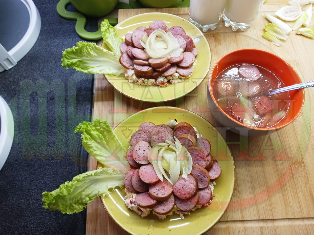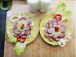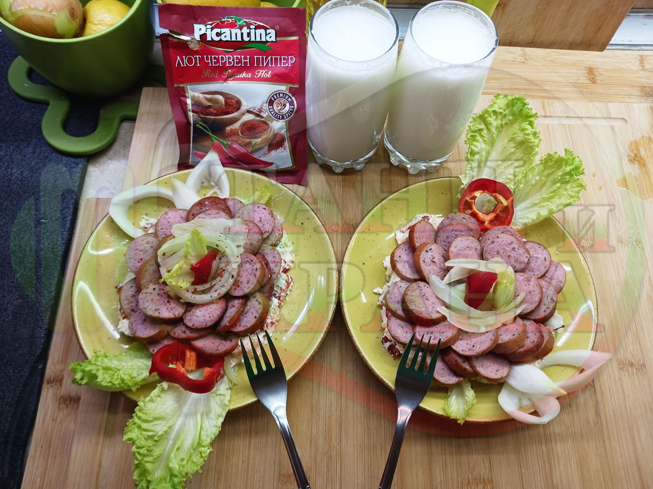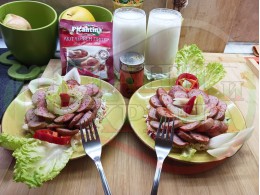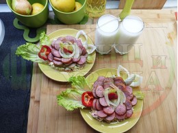 Спретнах невероятно вкусна лучена яхния с любимата ни родопска наденица и кромид лук. Родопската наденица съдържа подправки и мерудии и яхнията се овкусява от тях при сваряването и запичането на фурна. Гарнирах яхнията със свеж елемент в оформенте кладенчета от сиренов червеночушков марулен крем приготвен от червени пресни чушки, свежа маруля и краве бяло сирене (българско, саламурено). От сваряването и запичането на наденица и лука остава около 500 мл. бульон, с който може да се приготвят и овкусяват различни видове ястия и дори да се спретнат производни гозби. С двукомпонентния метод, който сътворих, постигам идеален баланс и хармония от взаимно допълващите се продукти, които съчетават по невероятен начин запечения и суров елемент. ![]()