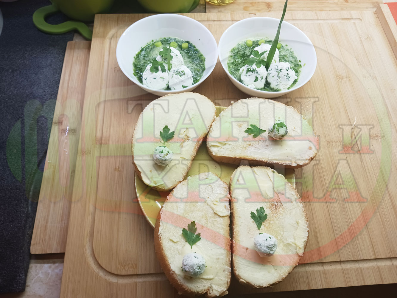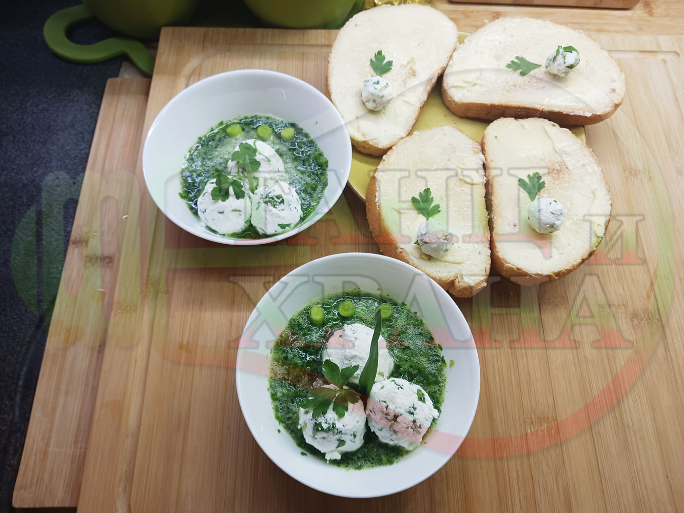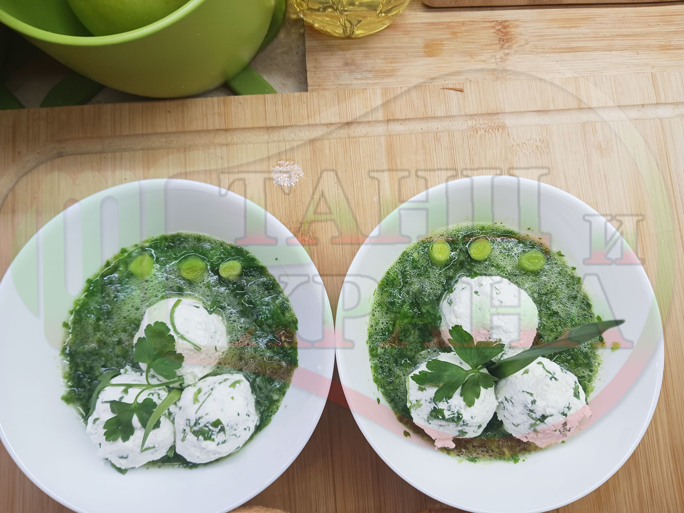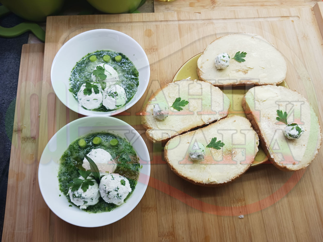 Българска магданозена сурова супа "Прясночеснова с БГсирене" приготвена със свеж магданоз и пресен чесън гарнирана с топчета от сиреново магданозен крем с краве бяло сирене (българско, саламурено) - двукомпонентна