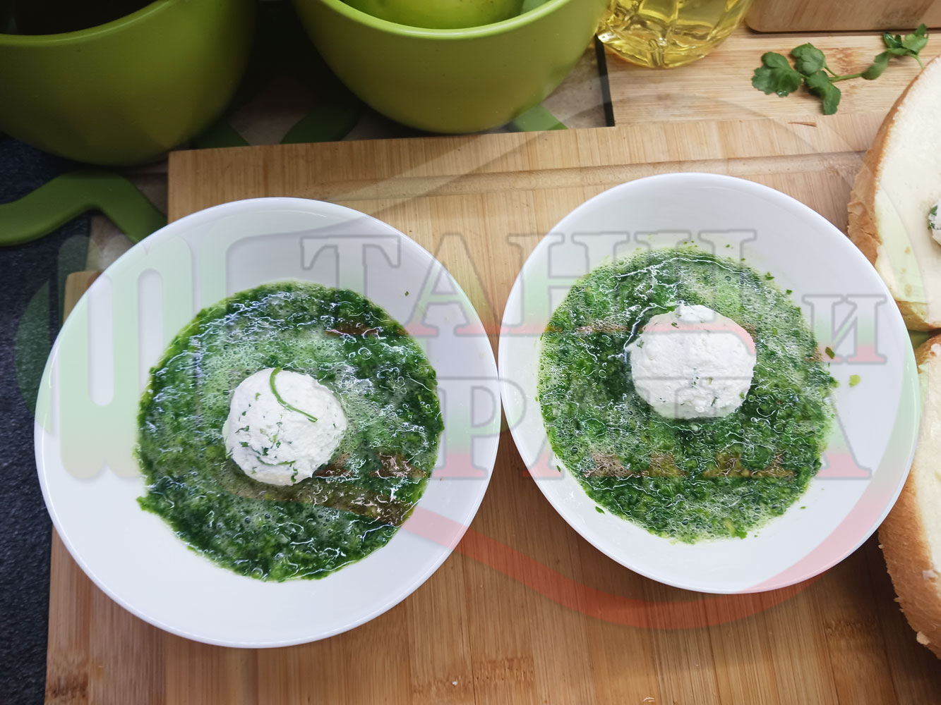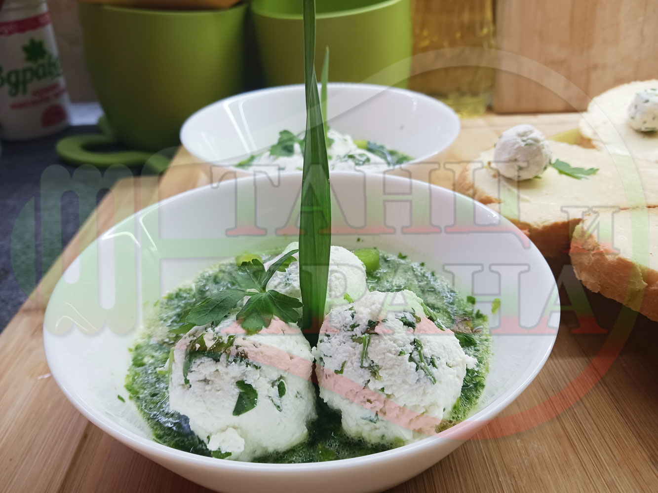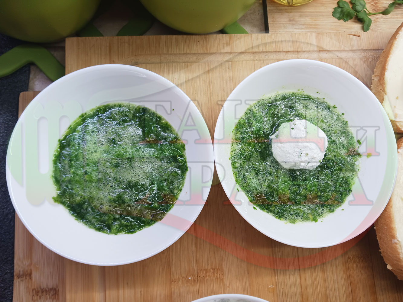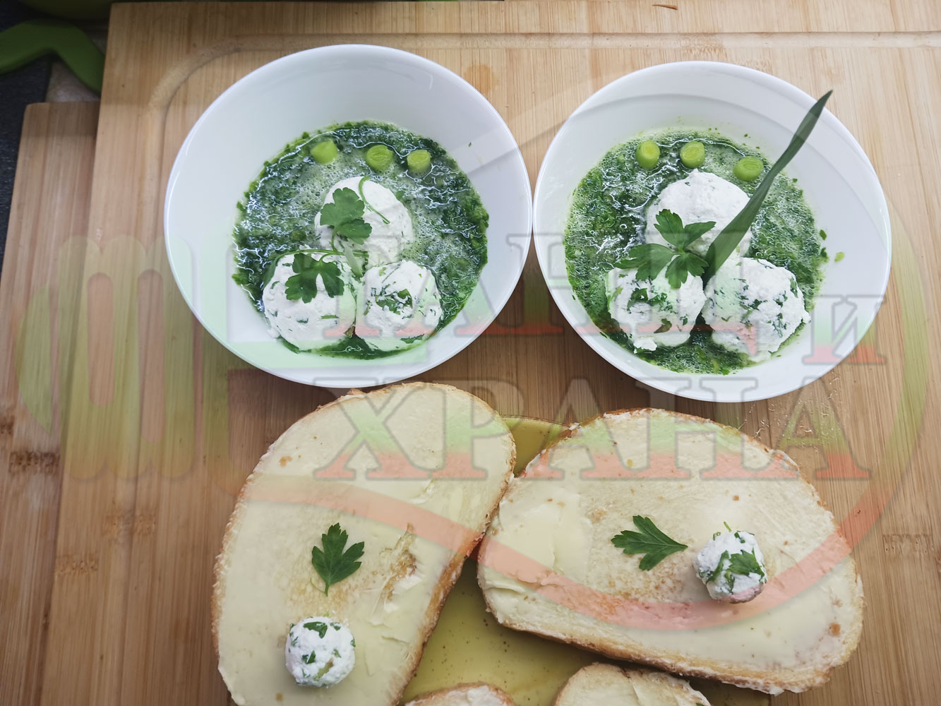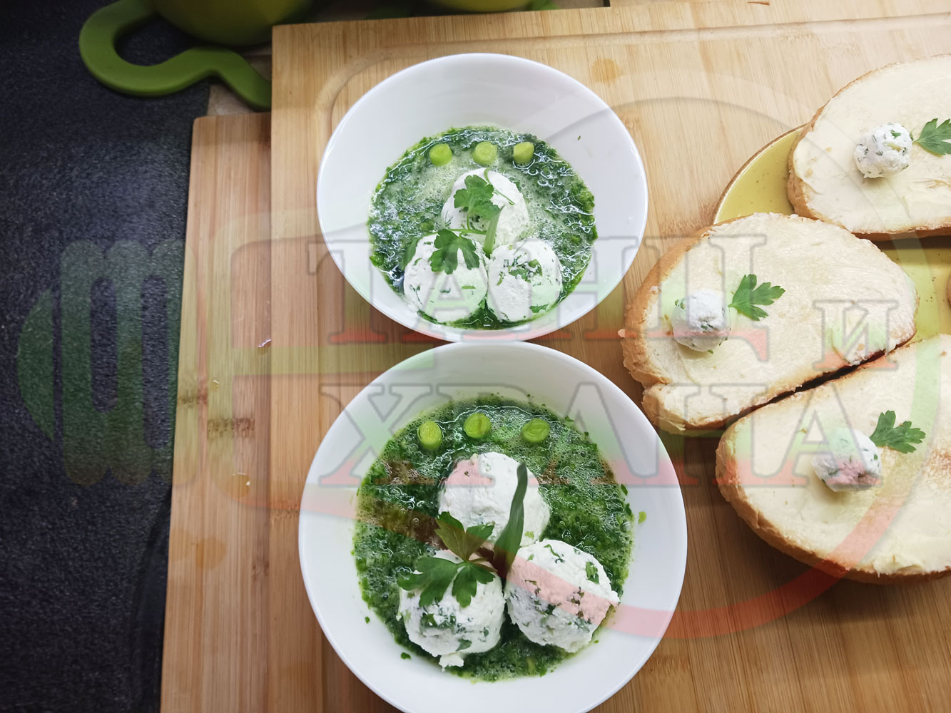 Българска магданозена сурова супа "Прясночеснова с БГсирене" приготвена със свеж магданоз и пресен чесън гарнирана с топчета от сиреново магданозен крем с краве бяло сирене (българско, саламурено) - двукомпонентна