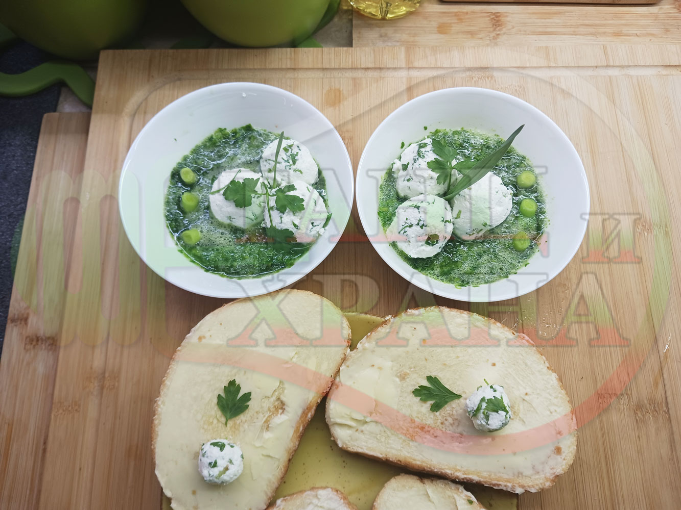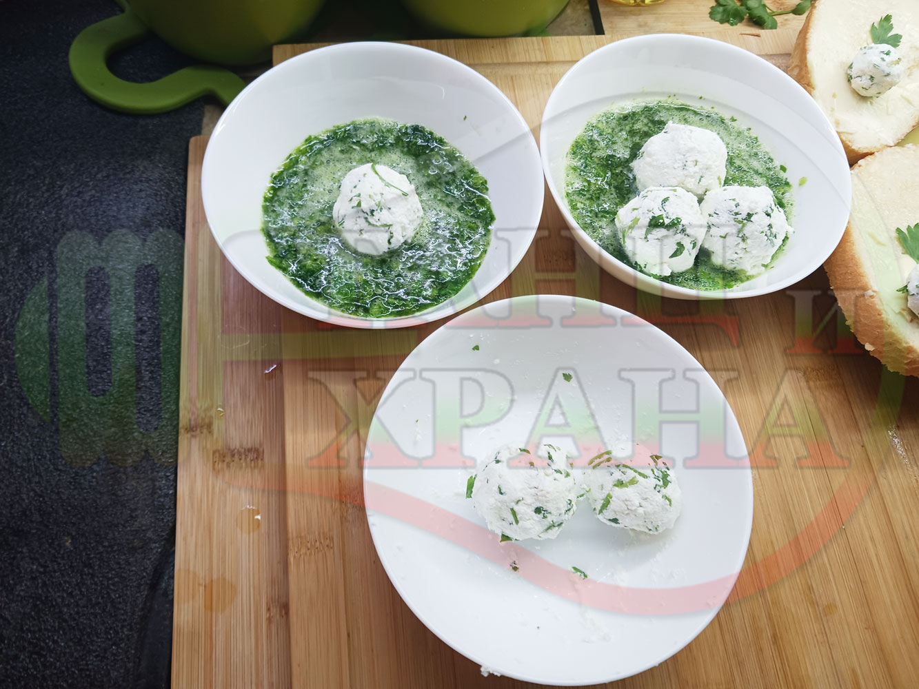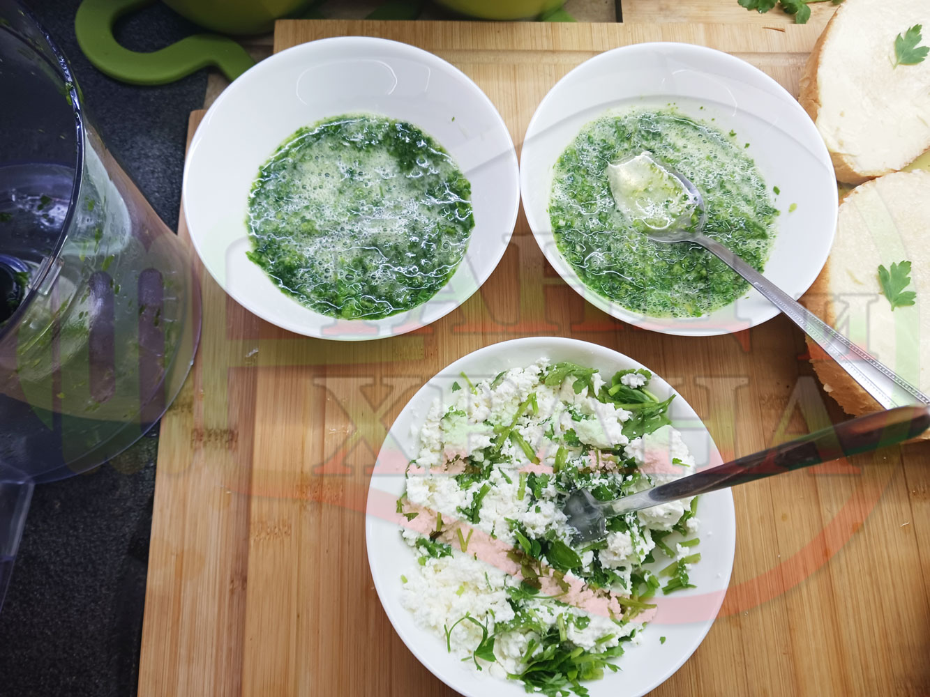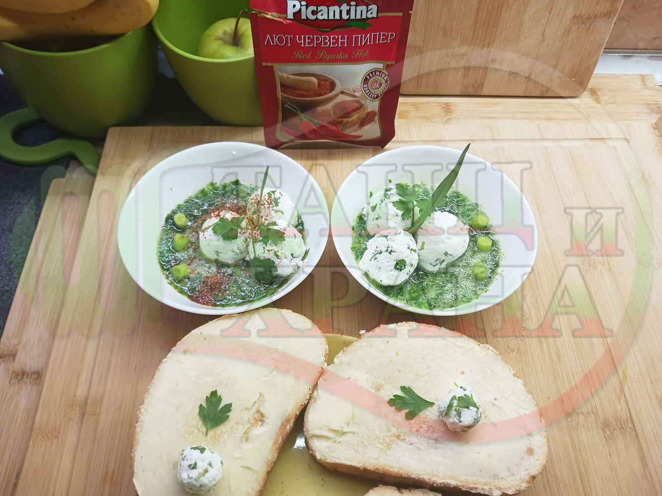 Българска магданозена сурова супа "Прясночеснова с БГсирене" приготвена със свеж магданоз и пресен чесън гарнирана с топчета от сиреново магданозен крем с краве бяло сирене (българско, саламурено) - двукомпонентна