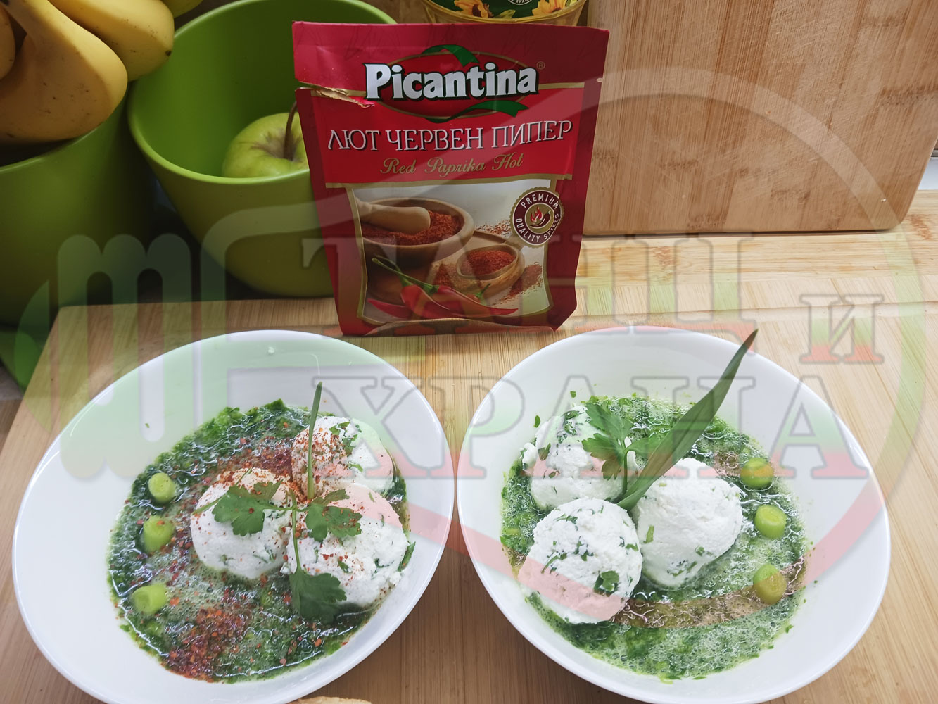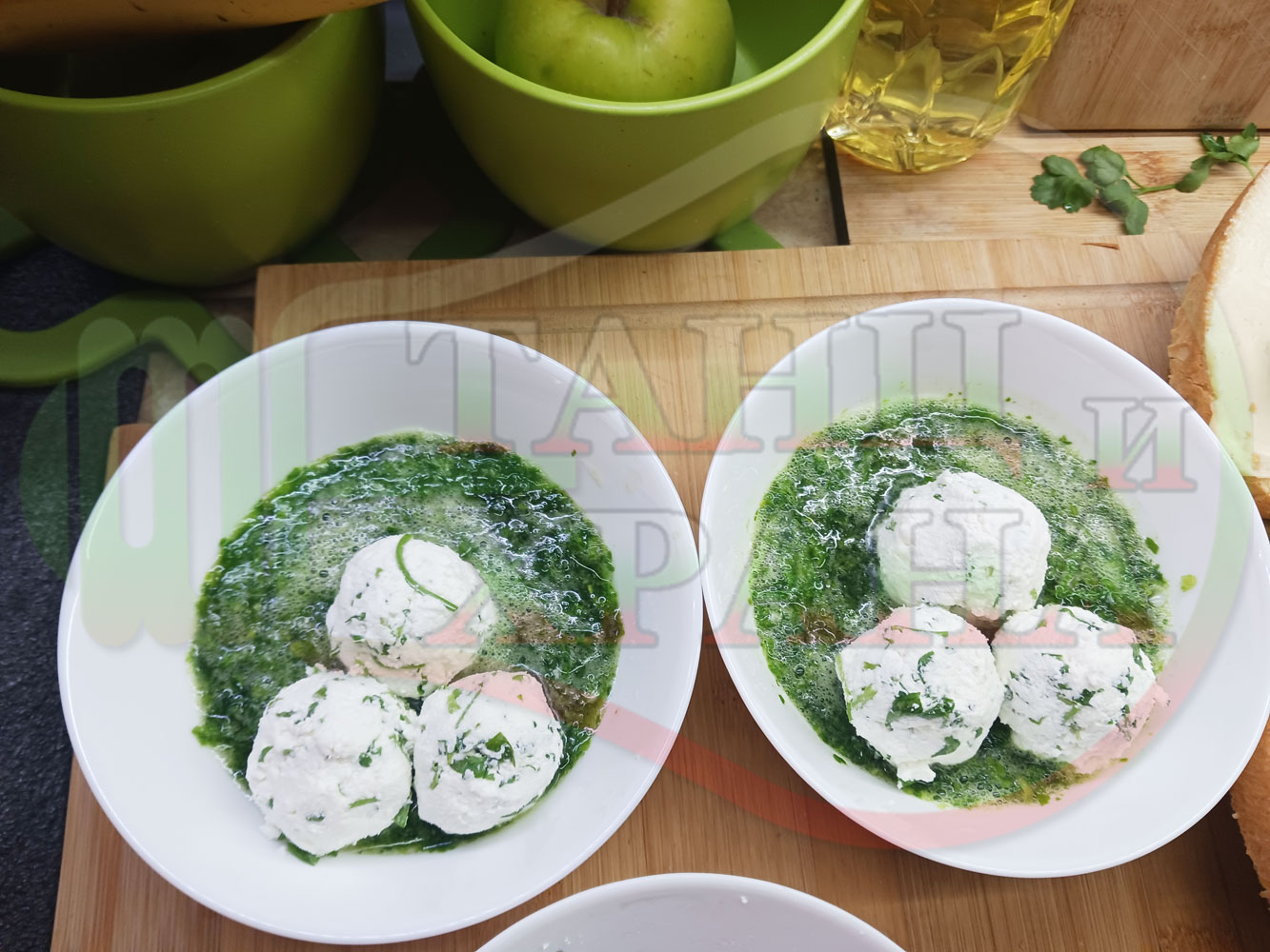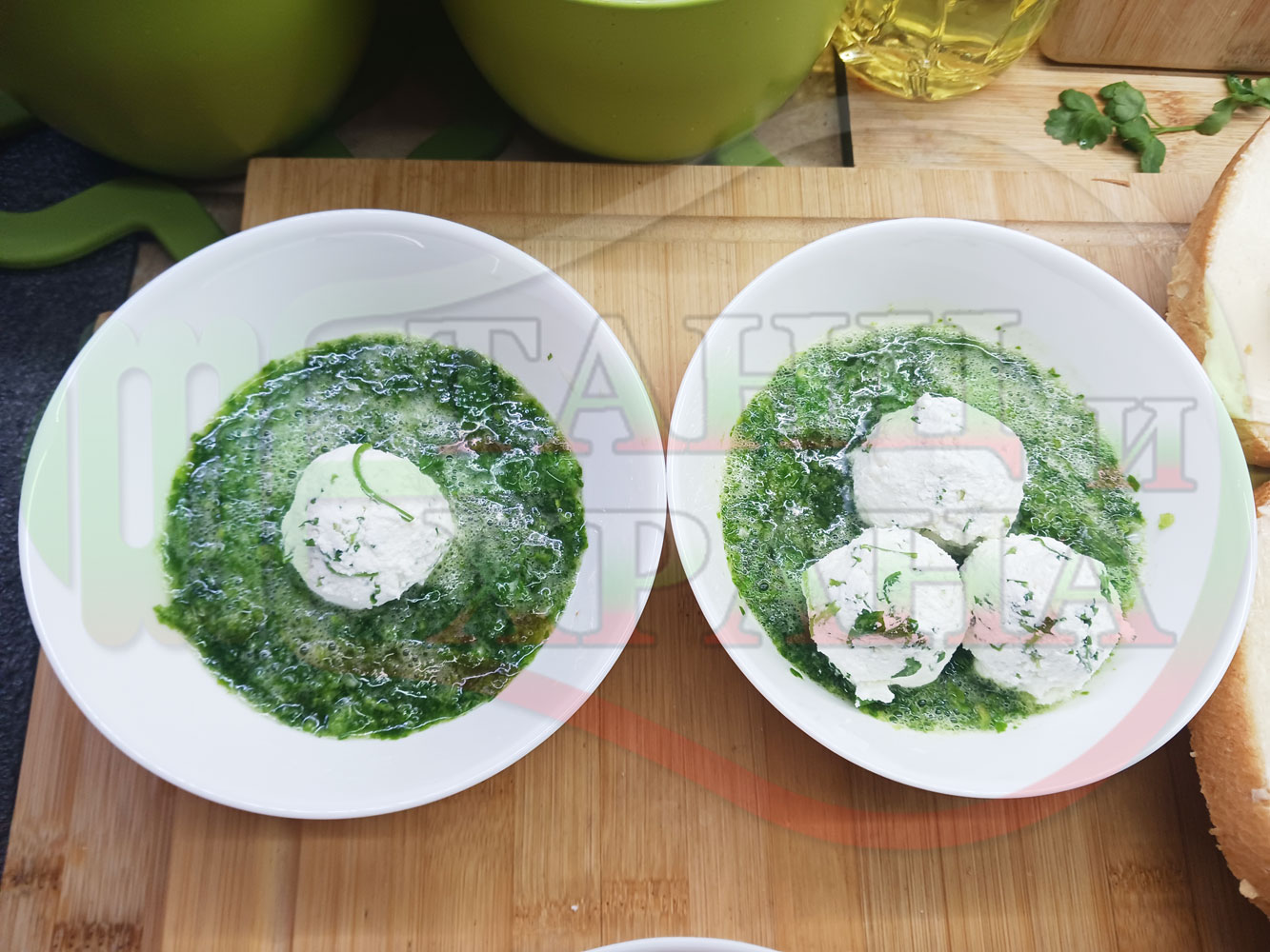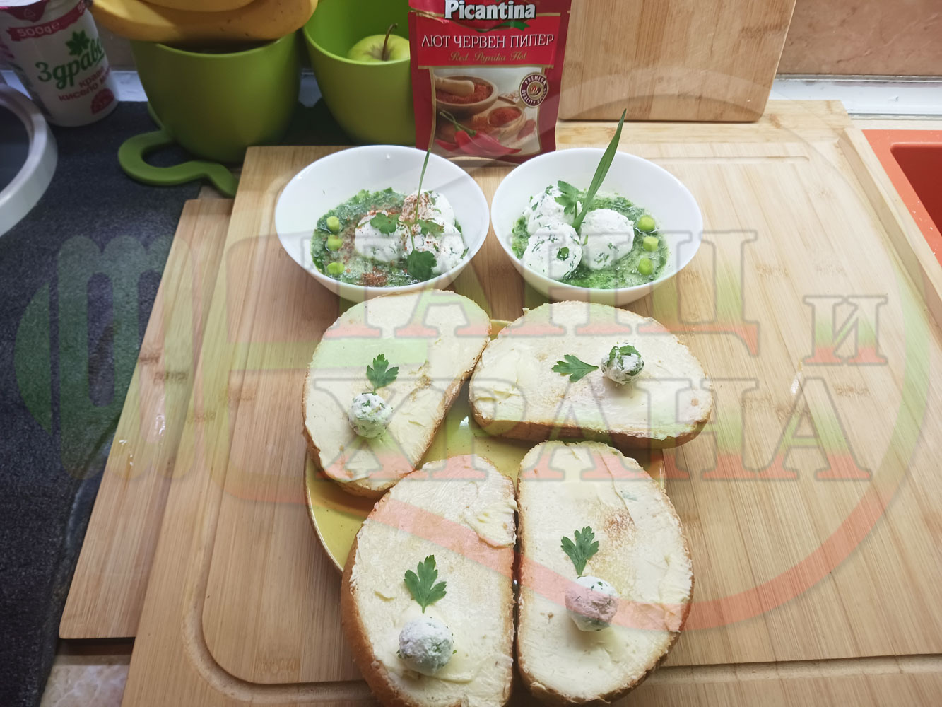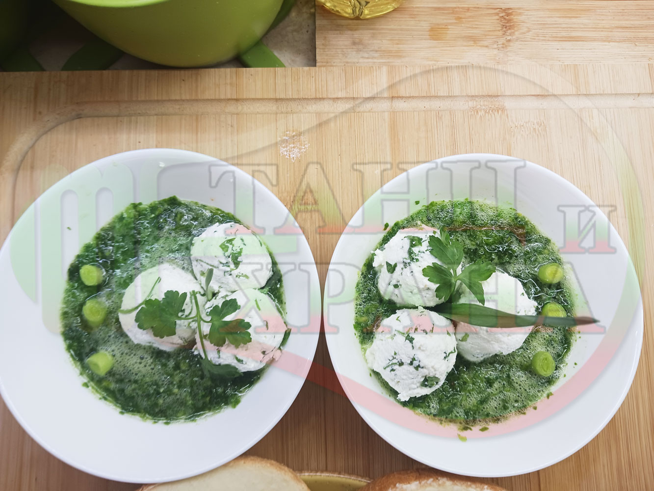 Българска магданозена сурова супа "Прясночеснова с БГсирене" приготвена със свеж магданоз и пресен чесън гарнирана с топчета от сиреново магданозен крем с краве бяло сирене (българско, саламурено) - двукомпонентна