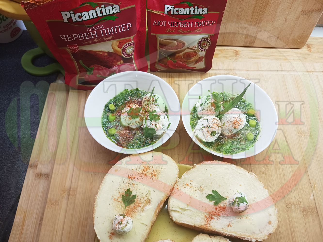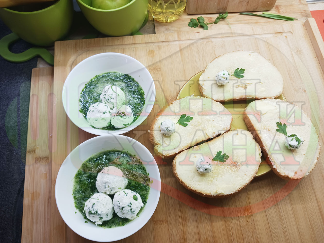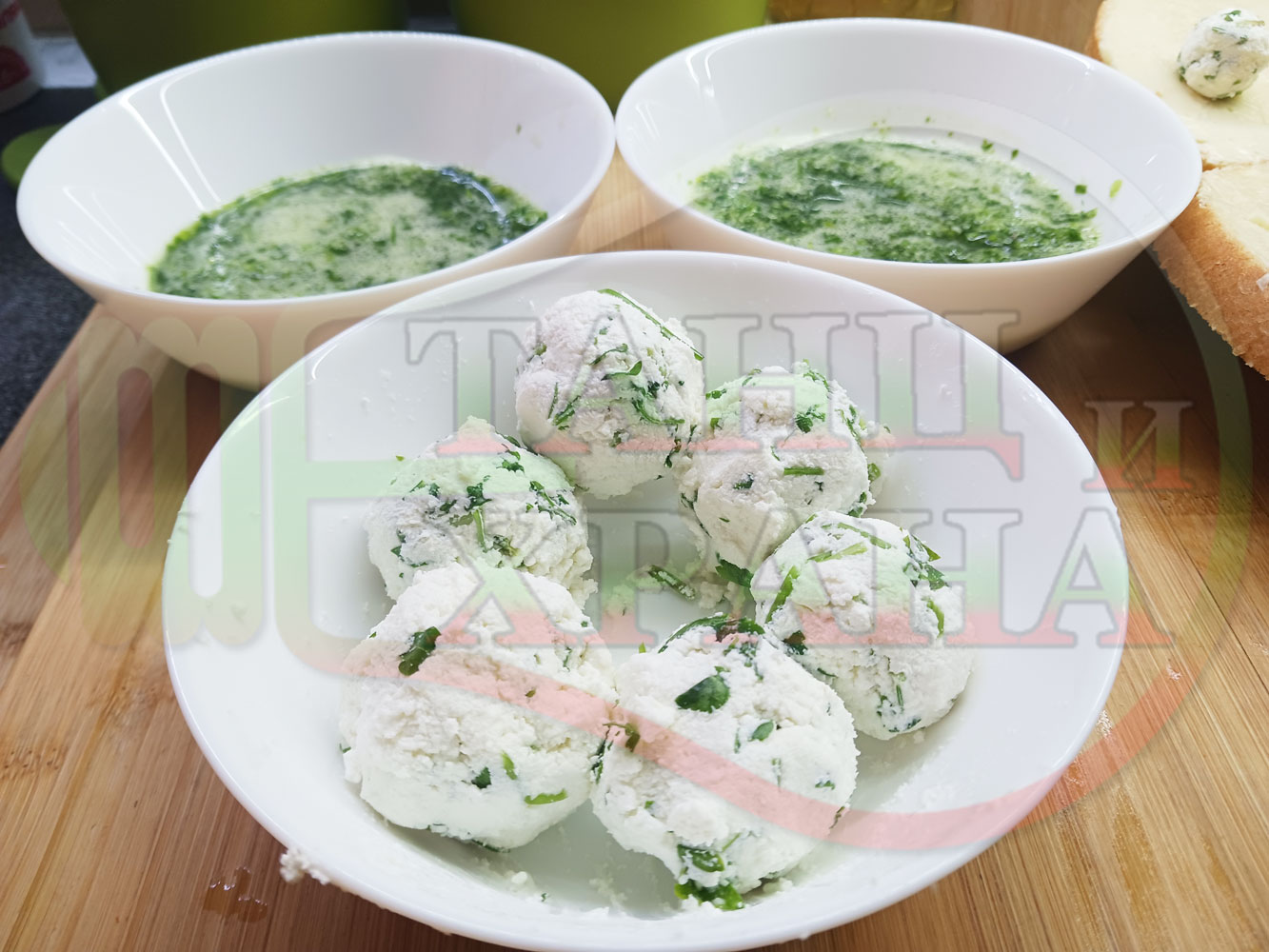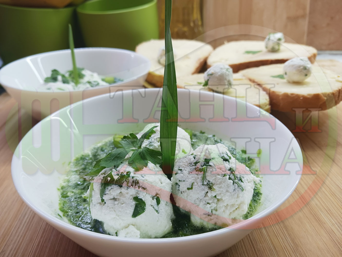 Българска магданозена сурова супа "Прясночеснова с БГсирене" приготвена със свеж магданоз и пресен чесън гарнирана с топчета от сиреново магданозен крем с краве бяло сирене (българско, саламурено) - двукомпонентна