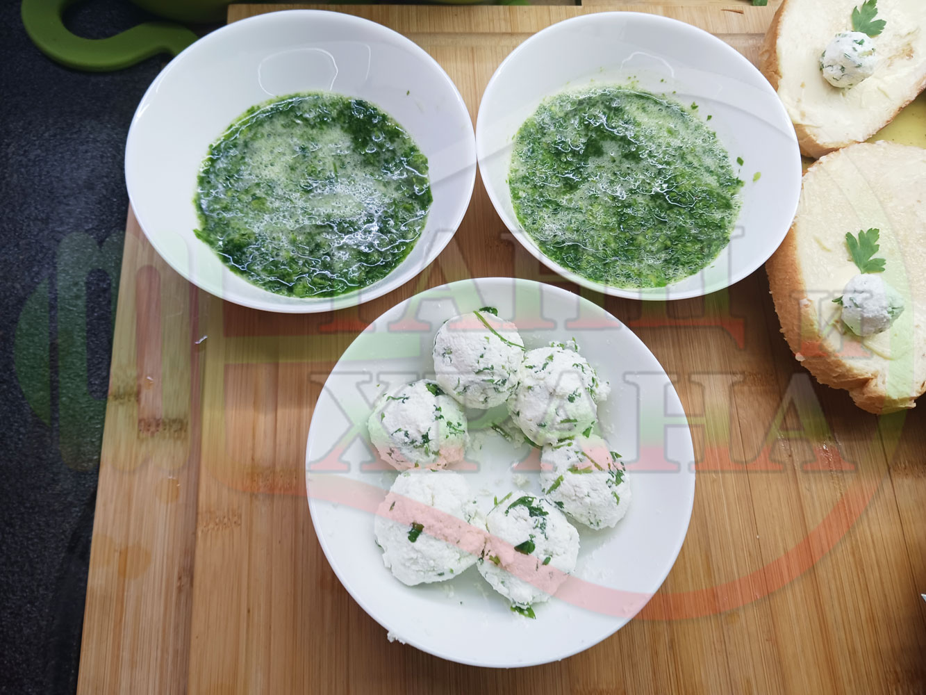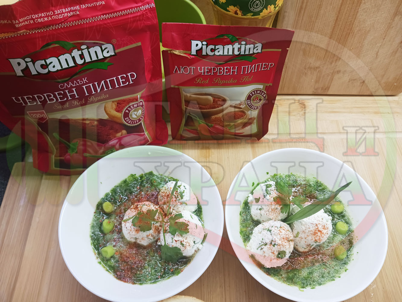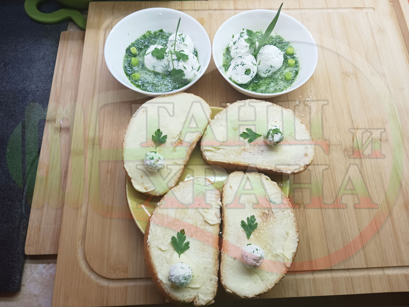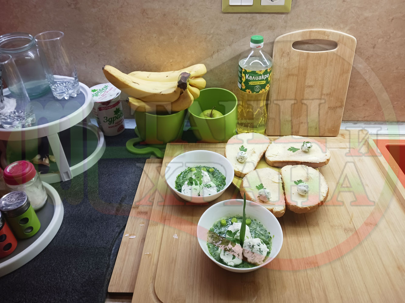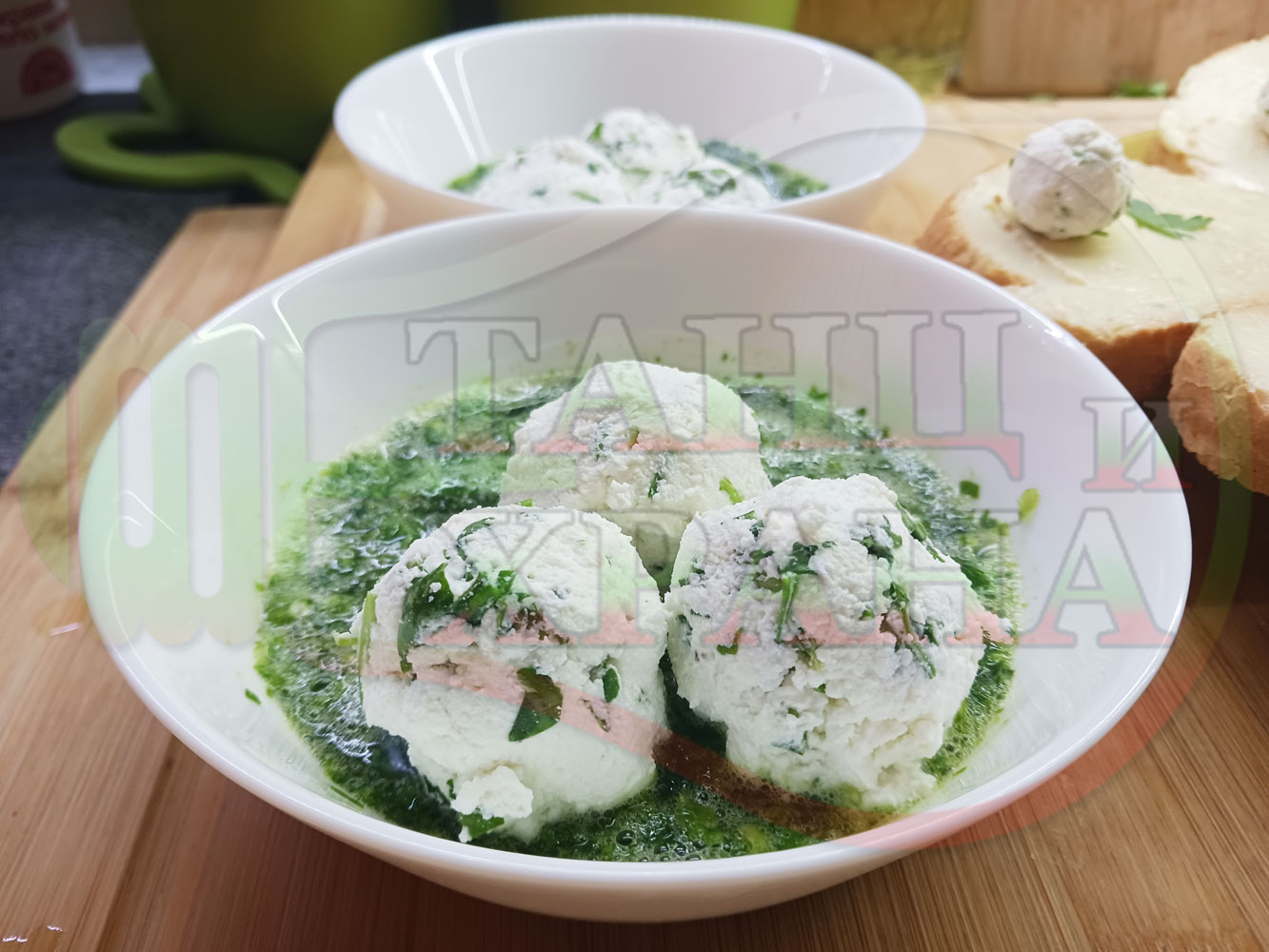 Българска магданозена сурова супа "Прясночеснова с БГсирене" приготвена със свеж магданоз и пресен чесън гарнирана с топчета от сиреново магданозен крем с краве бяло сирене (българско, саламурено) - двукомпонентна