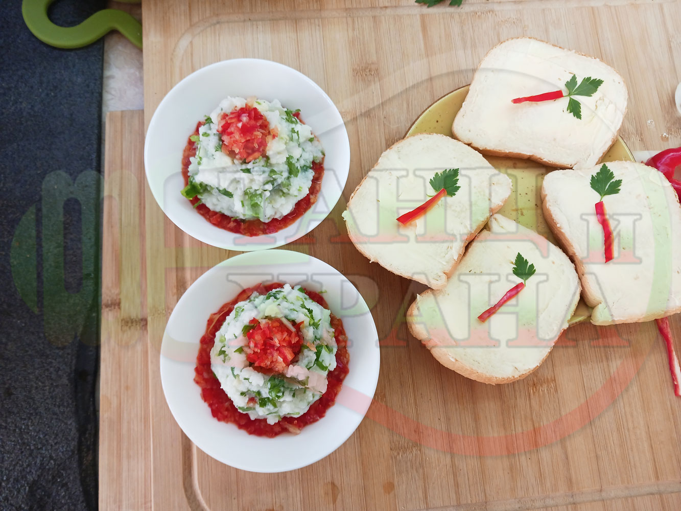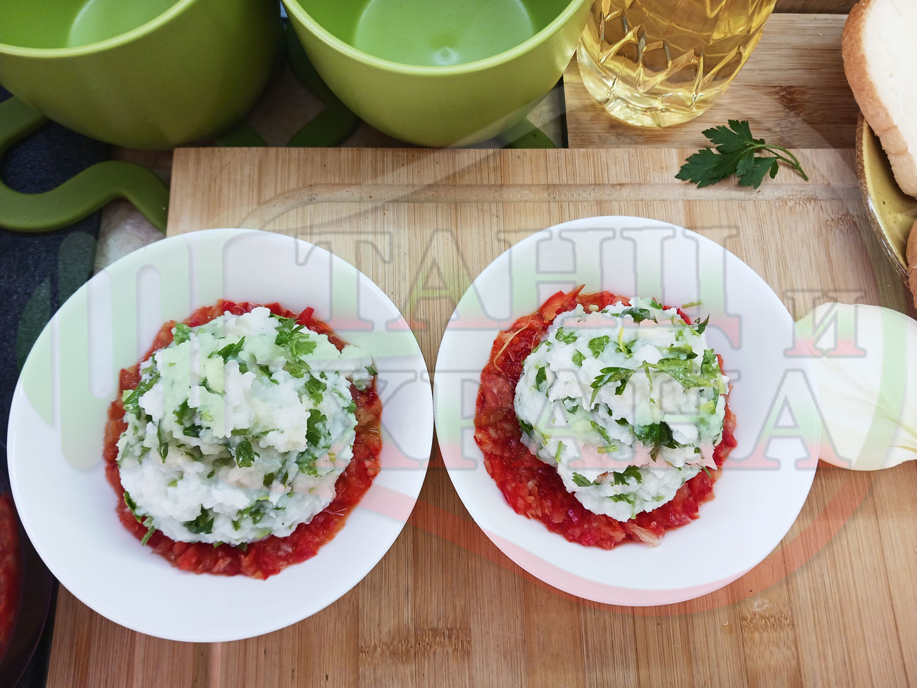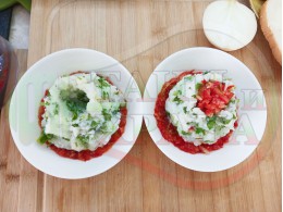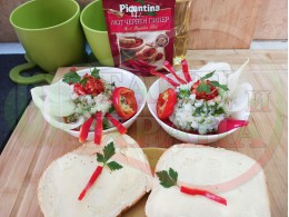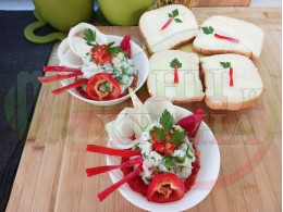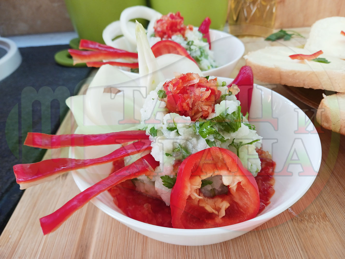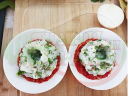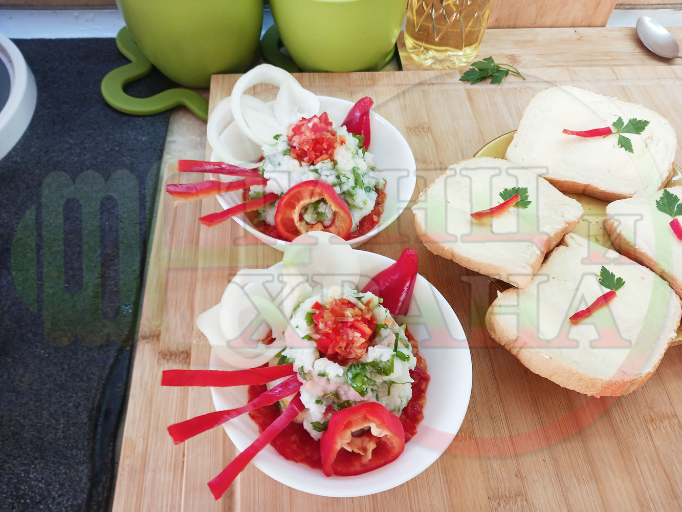 Спретнах производна оризова червенопиперкова двукомпонентна яхния от основно сварения и запечен ориз с пилешки гърди, напълнени в зелени пресни чушки "Белопилегърдов зеленочушковонапълнен кромидлучен". Овкусих сварения и леко запечен ориз със свеж магданоз и чесън, оформих го на големи топки с малки "кладенчета" и напълних кладенчетата с чушковата яхния и отново се получи невероятна вкусно, вкусна, вкусотия (вкуснотия). ![]()