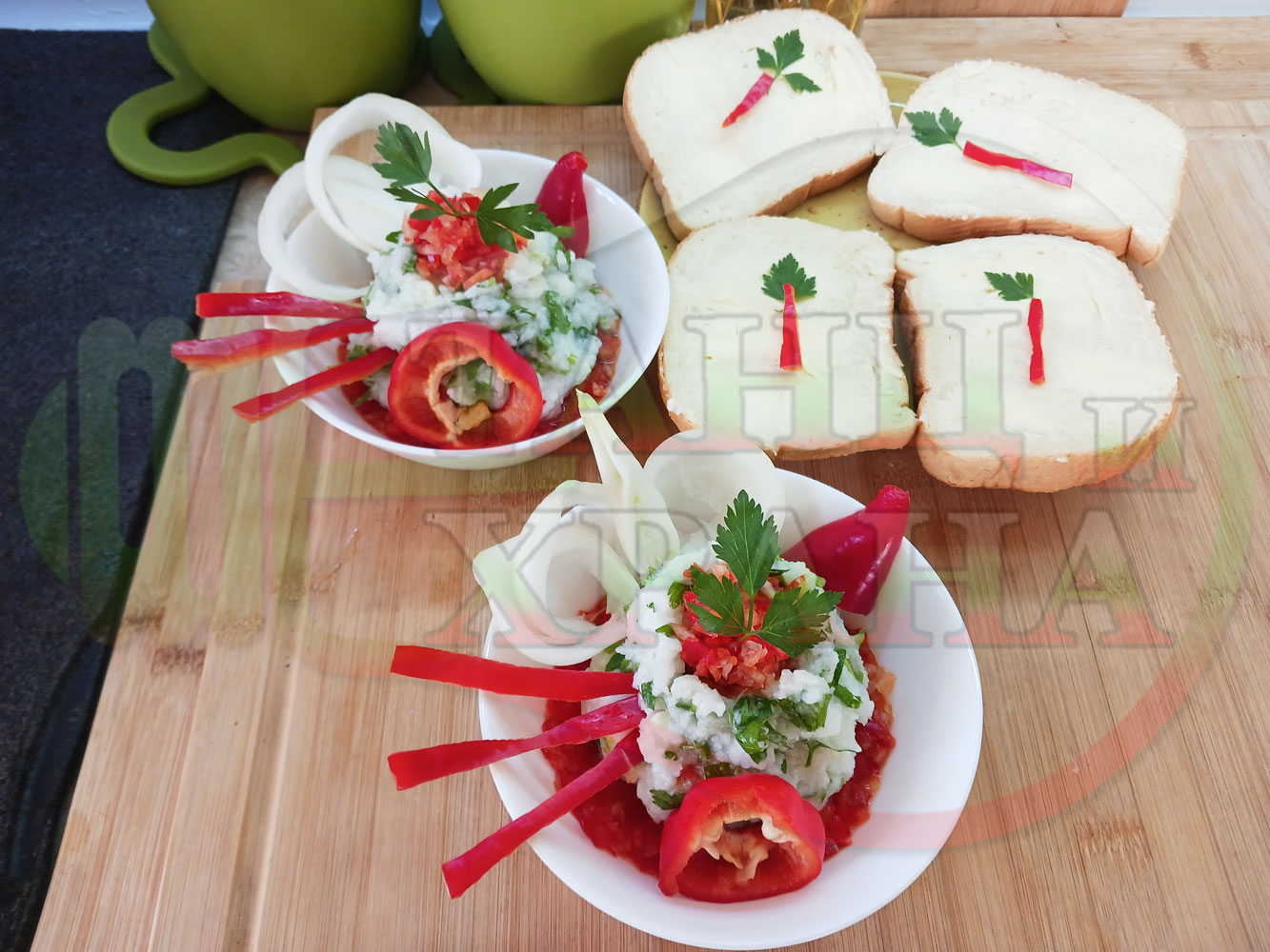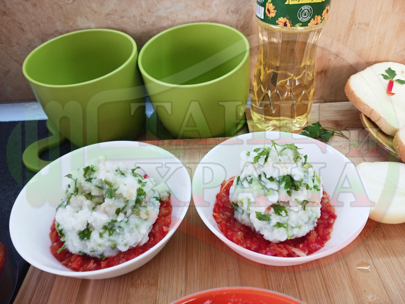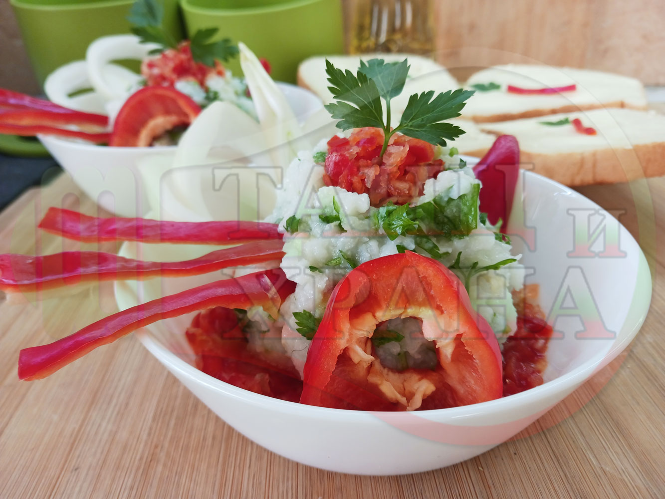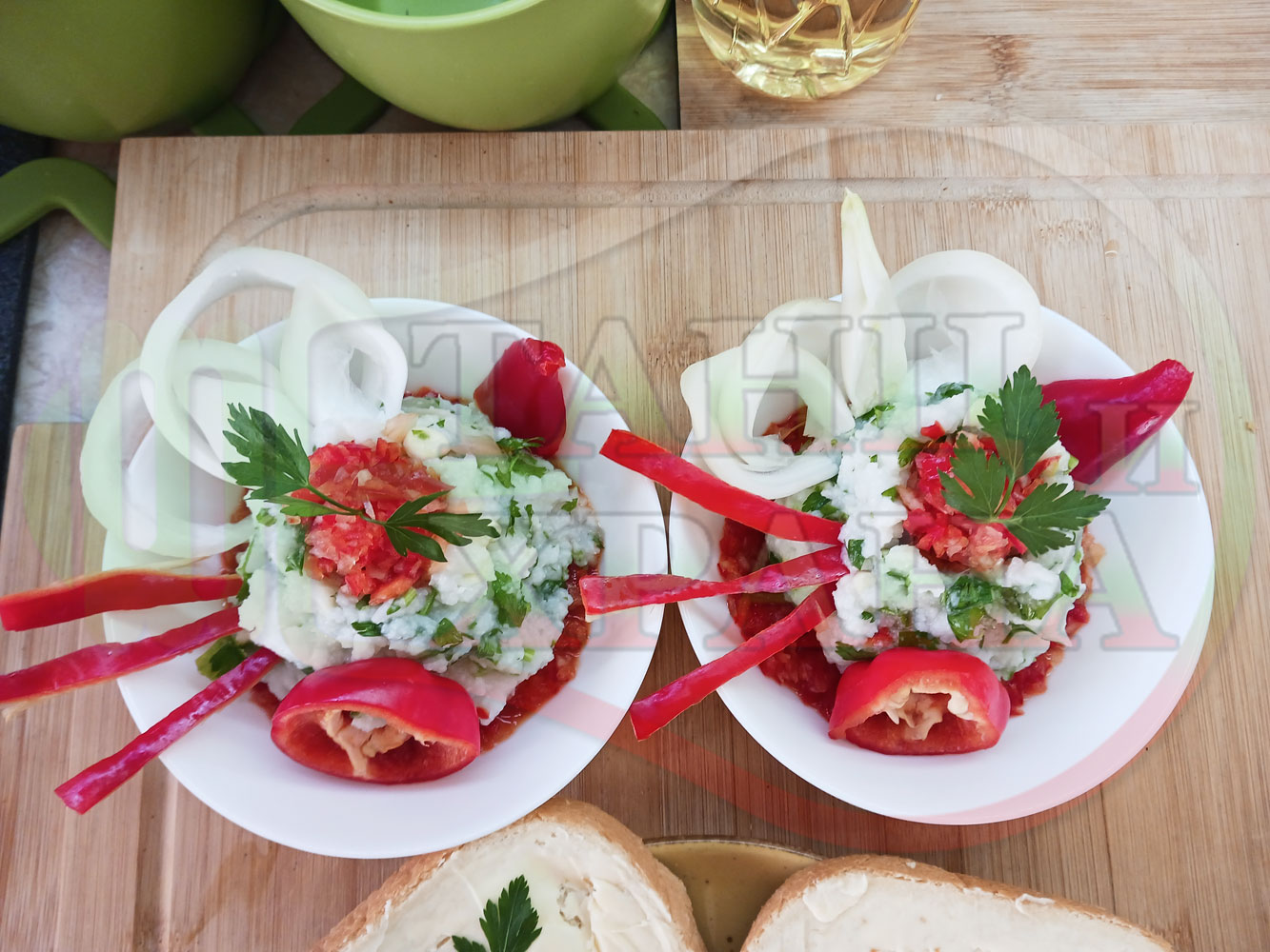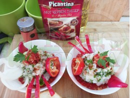 Българска оризова чушкова яхния "Червенопиперкова кромидлучена" приготвена от червени пресни чушки и кромид лук гарнирана с кладенчета от овкусен ориз със свеж магданоз и стар чесън предварително сварен с пилешки гърди - производна (1)