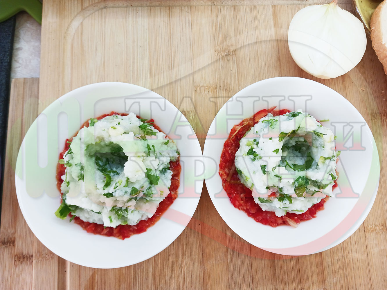 Подгрейте ориза на микровълнова печка и добавете измития и нарязан на едро магданоз и обеления и нарязан на едро чесън (заделете стръкчета магданоз за украса). Разбъркайте и намачкайте продуктите с вилица до образуване на средно гъста оризова, хомогенизирана смес с магданоз и чесън (овкусен ориз). Оформете 2 големи оризови топки от овкусения ориз за гарниране на яхнията.