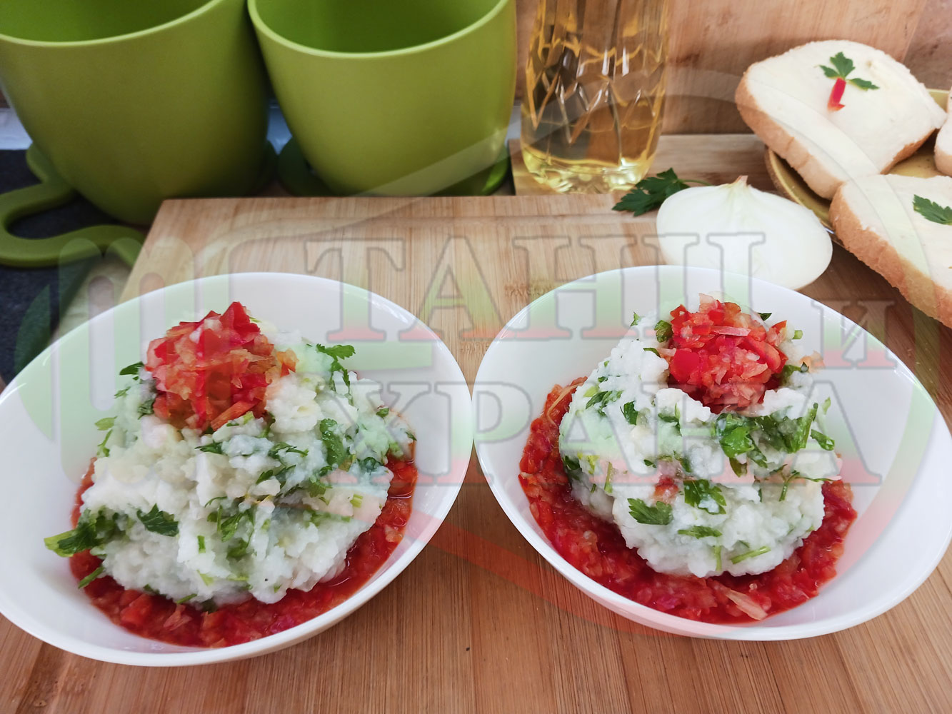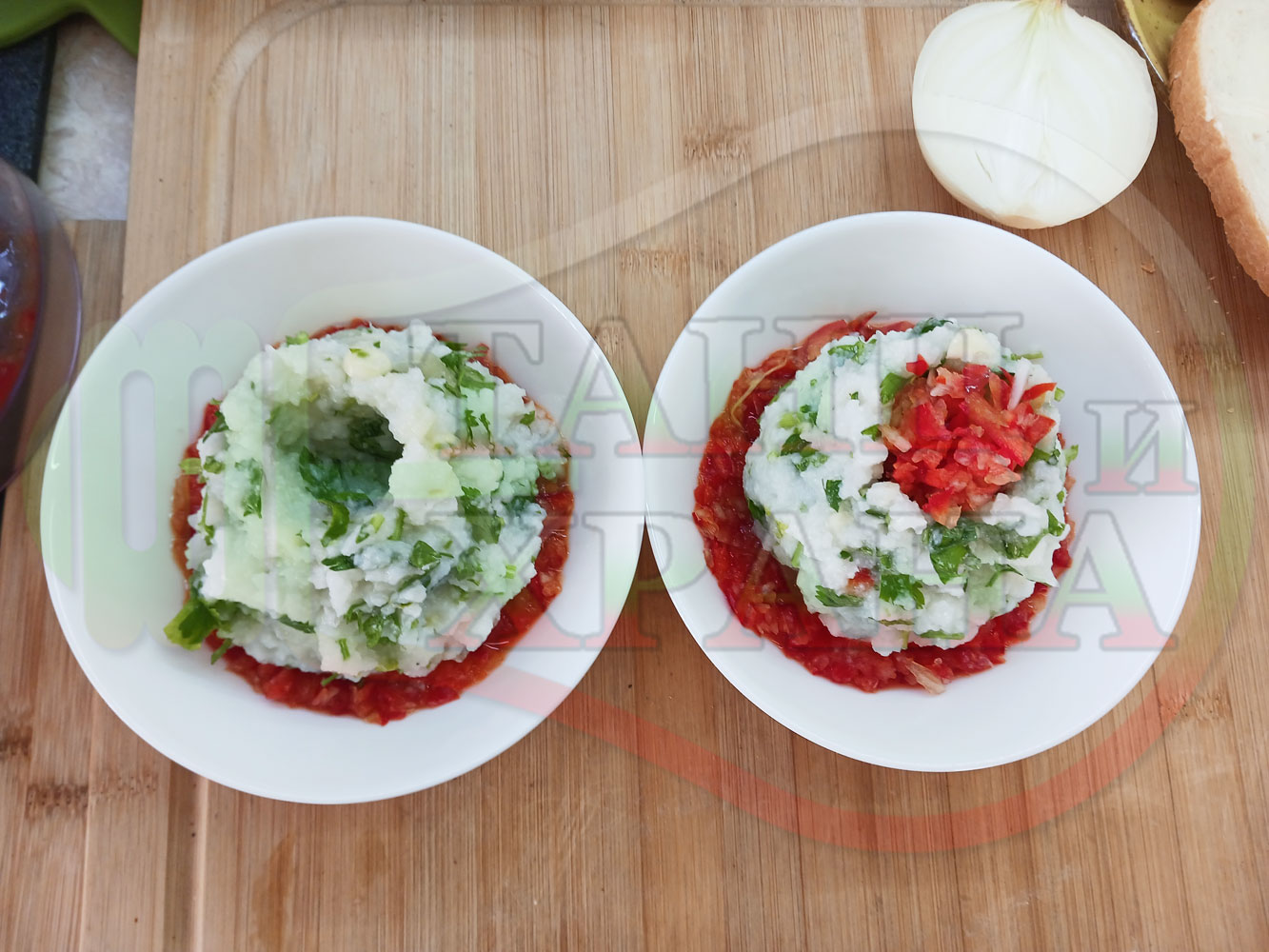 Измийте чушките, почисетети ги от семките чрез т.нар. "изтърбушване" и ги сипете в чопъра заедно с обеления, измит и нарязан на едро кромид лук (заделете няколко чушкови обръча и чушковите връхчета и вътрешната част на кромид лука за украса). Сипете хладка вода и разбийте с чопъра продуктите до образуване на средно гъста чушкова червенопиперкова, хомогенизирана супа с кромид лук (чушкова яхния).