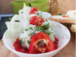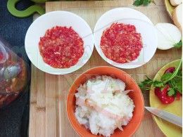 ПРОДУКТИ: Приблизителни количества за българска оризова чушкова яхния "Червенопиперкова кромидлучена" приготвена от червени пресни чушки и кромид лук гарнирана с кладенчета от овкусен ориз със свеж магданоз и стар чесън предварително сварен с пилешки гърди - производна (1)