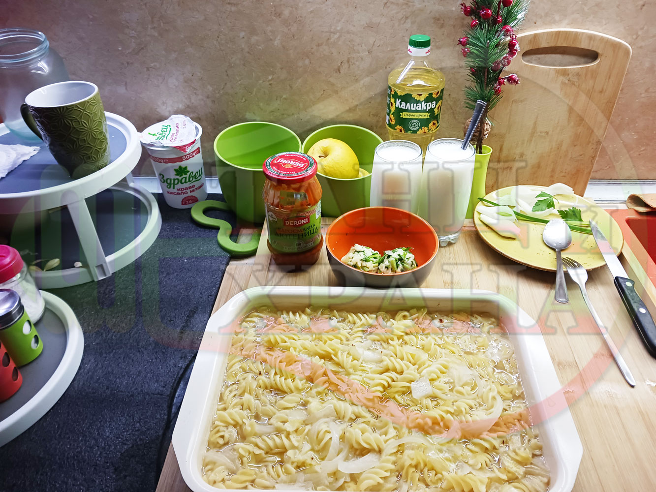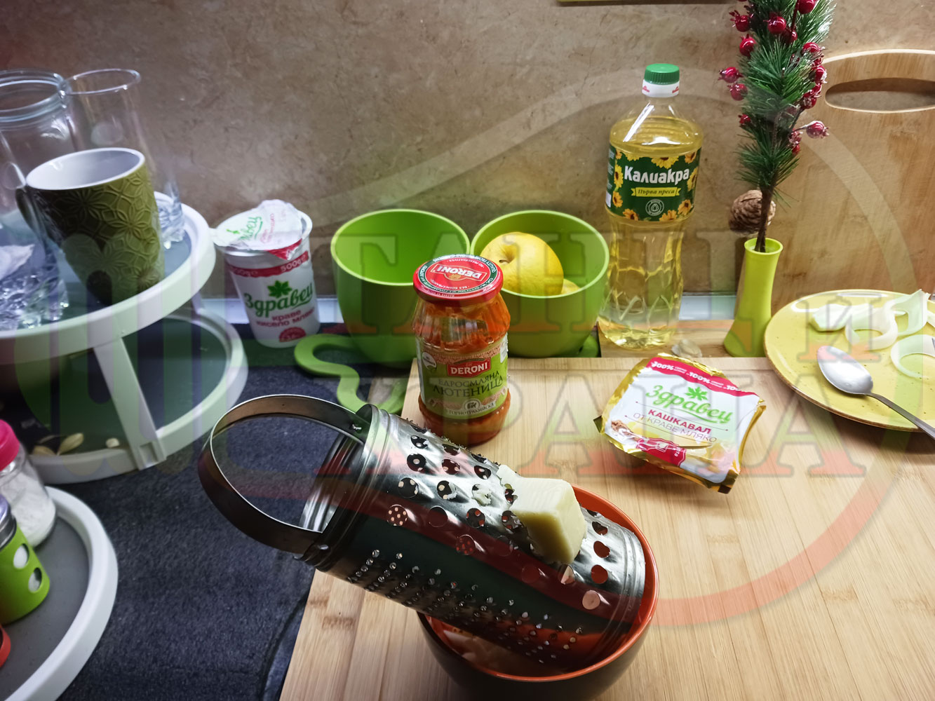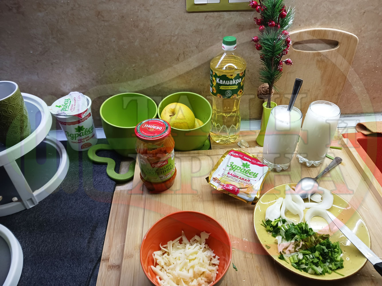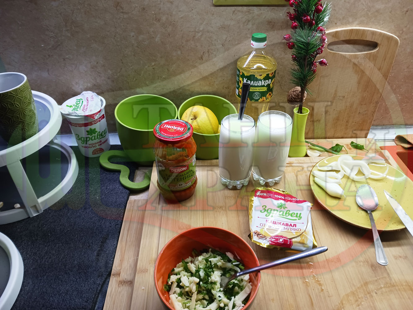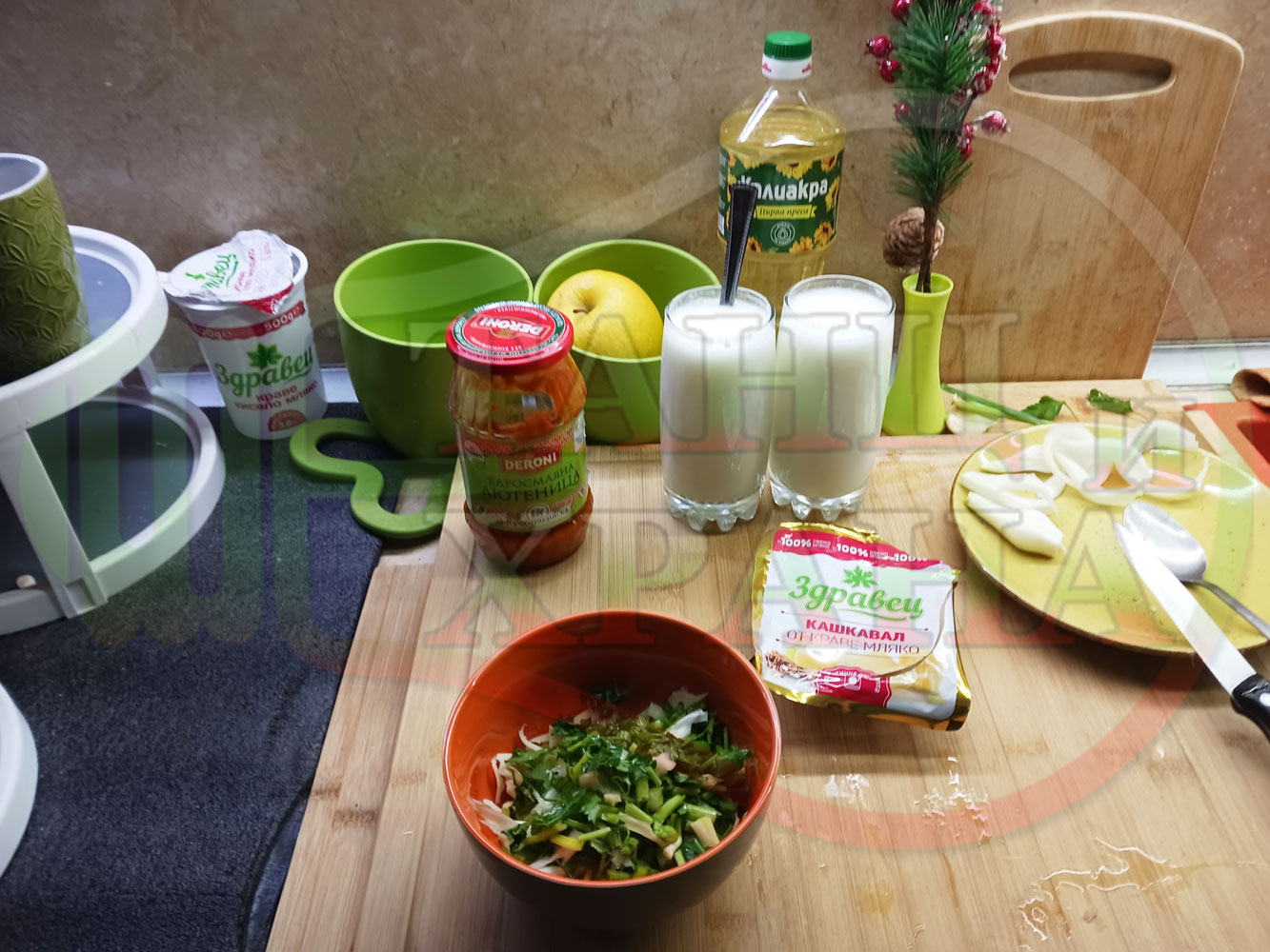 ... вплела традиционни български продукти, които се намират във всеки български дом през зимните и пролетни месеци (сок от кисело зеле и лютеница). ![]()