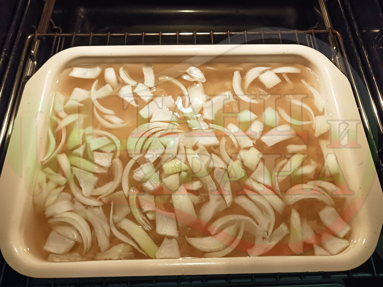 Сипете макароните в тава за печене и добавете обеления, измит и нарязан на едро кромид лук (заделете вътрешната част на лука за украса). Изсипете сока от киселото зеле, налейте топла към гореща вода от чешмата и сипете слънчогледовото олио (съобразете солеността на зелевия сок преди да го изсипете и преценете количеството на водата, което да налеете според солеността на сока и продуктите за сурово гарниране). Разбъркайте и поставете тавата в предварително загрятата фурна (загрейте я за поне 5 минути). Сварете и леко запечете на фурна без вентилатор на 180 градуса за около 50 минути.