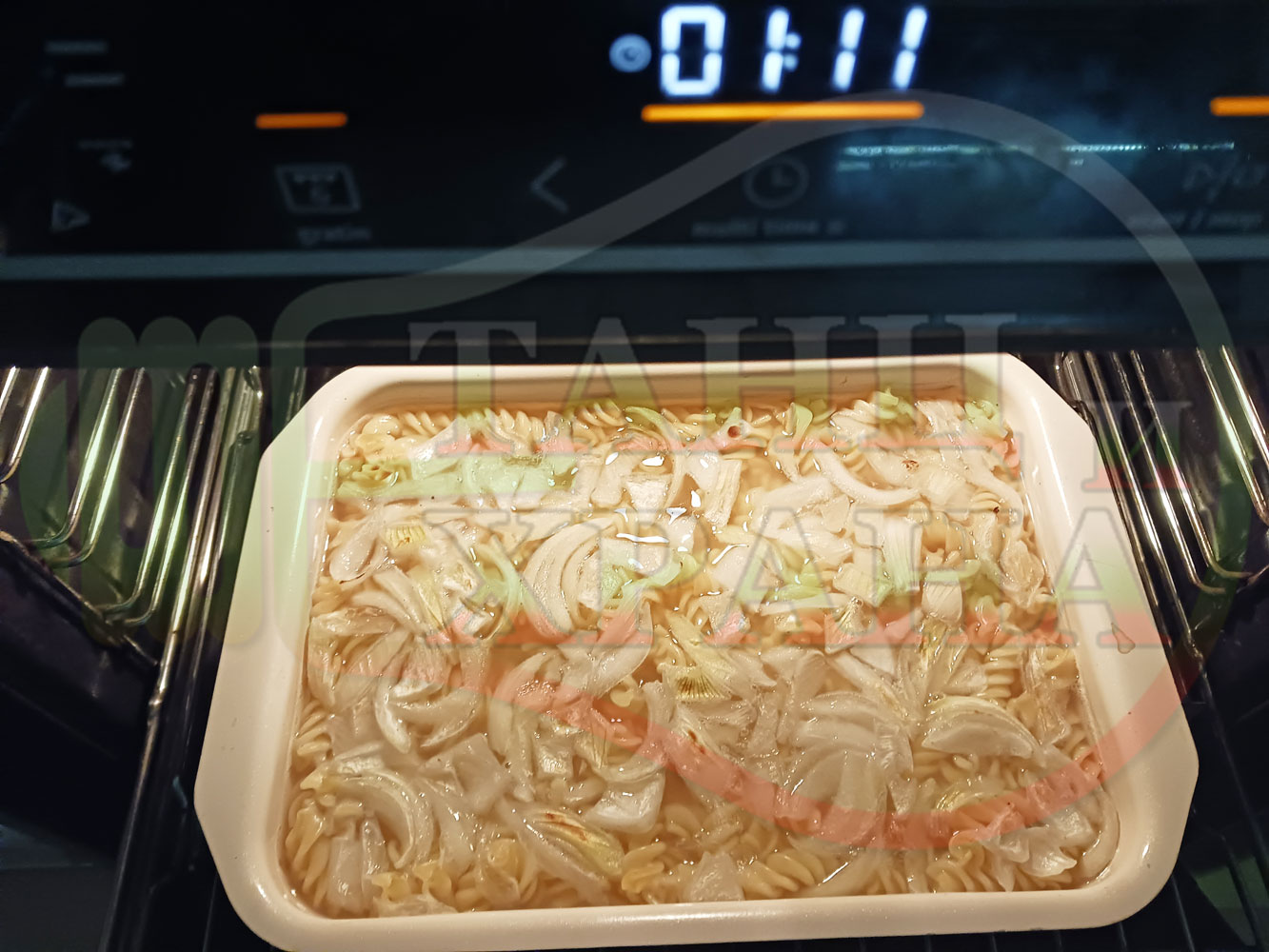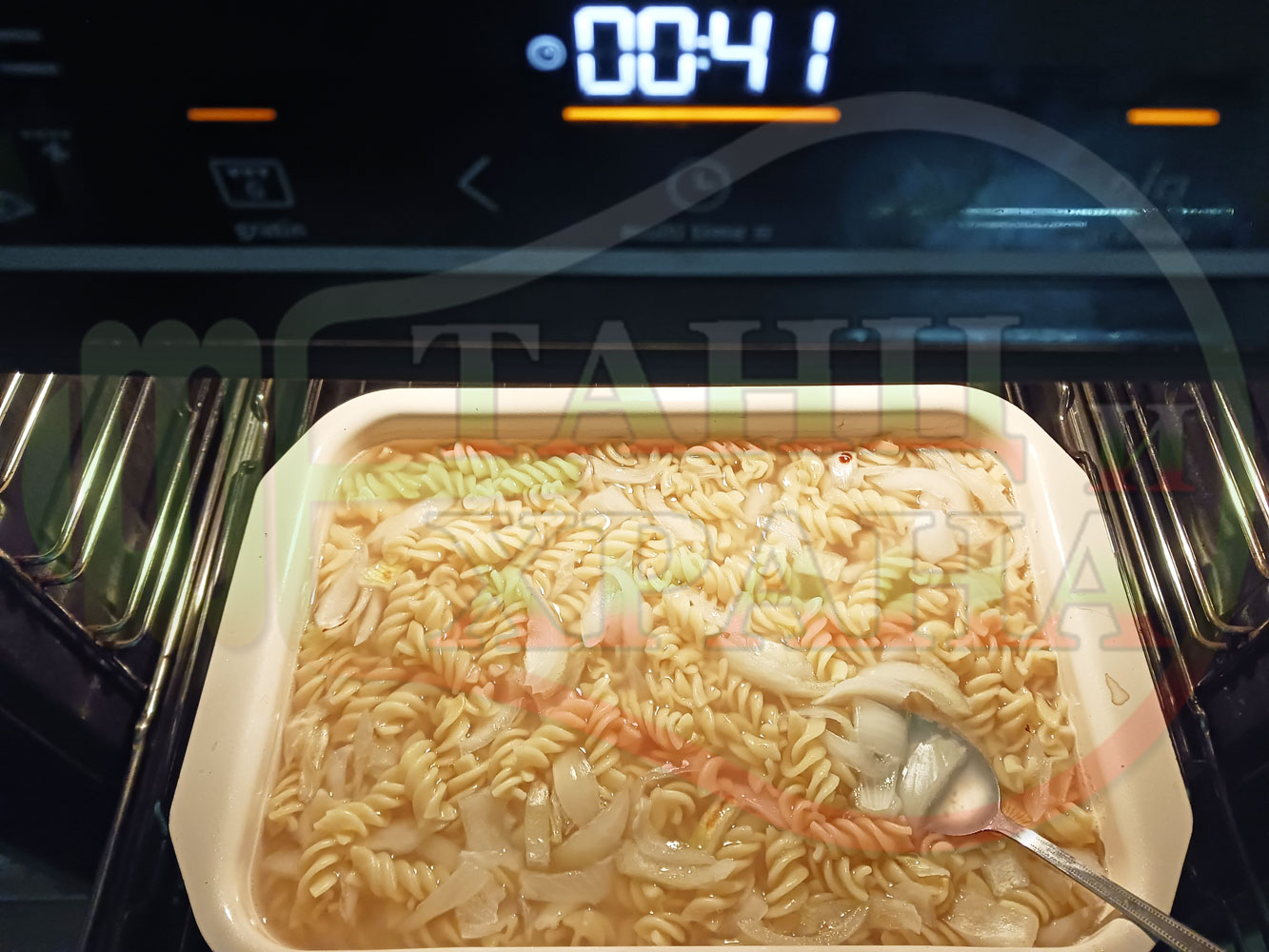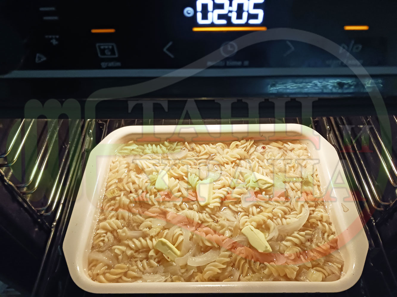 ВНИМАНИЕ: Фурните са различни и съответно времето за сваряване и леко запичане е ориентировъчно. Наблюдавайте процеса на запичане и при необходимост покрийте с капак или отстранете тавата от фурната. Разбърквайте макароните от време на време за да се сварят равномерно.