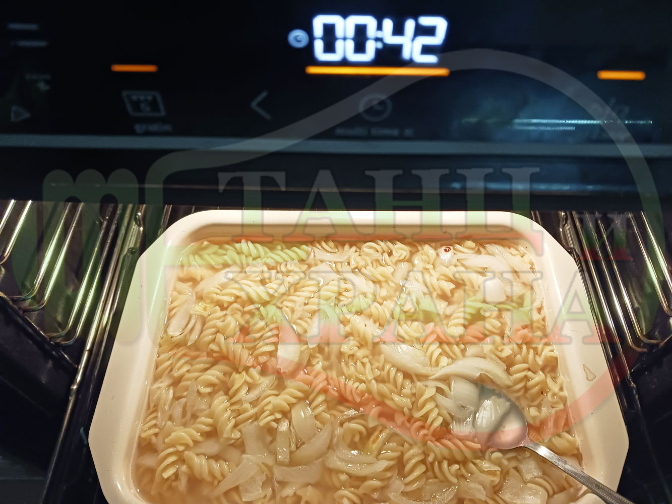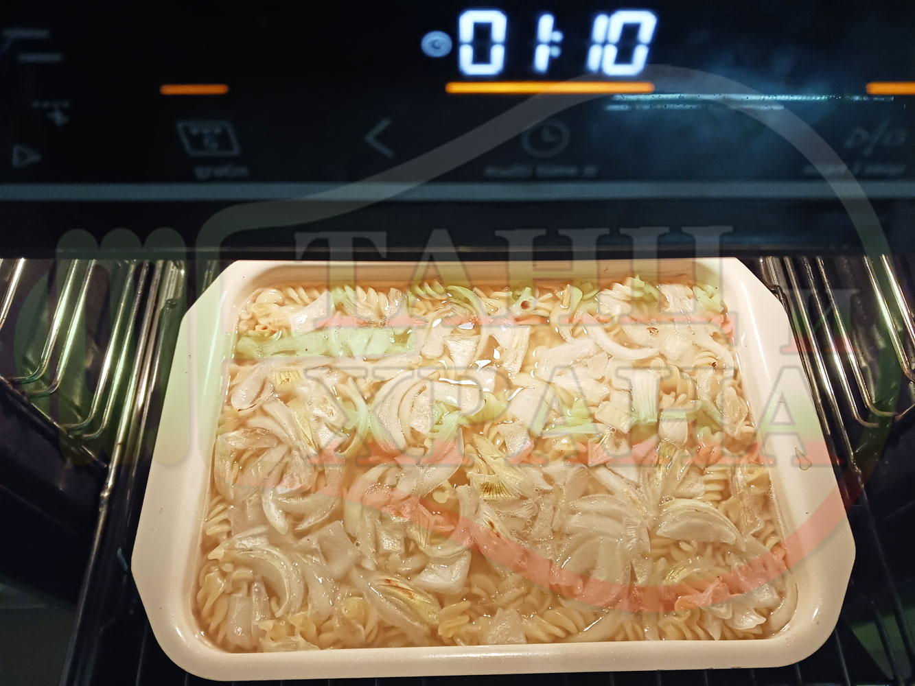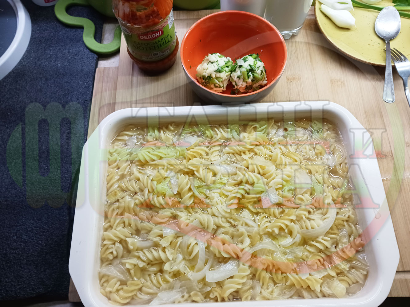 ВНИМАНИЕ: Фурните са различни и съответно времето за сваряване и леко запичане е ориентировъчно. Наблюдавайте процеса на запичане и при необходимост покрийте с капак или отстранете тавата от фурната. Разбърквайте макароните от време на време за да се сварят равномерно.