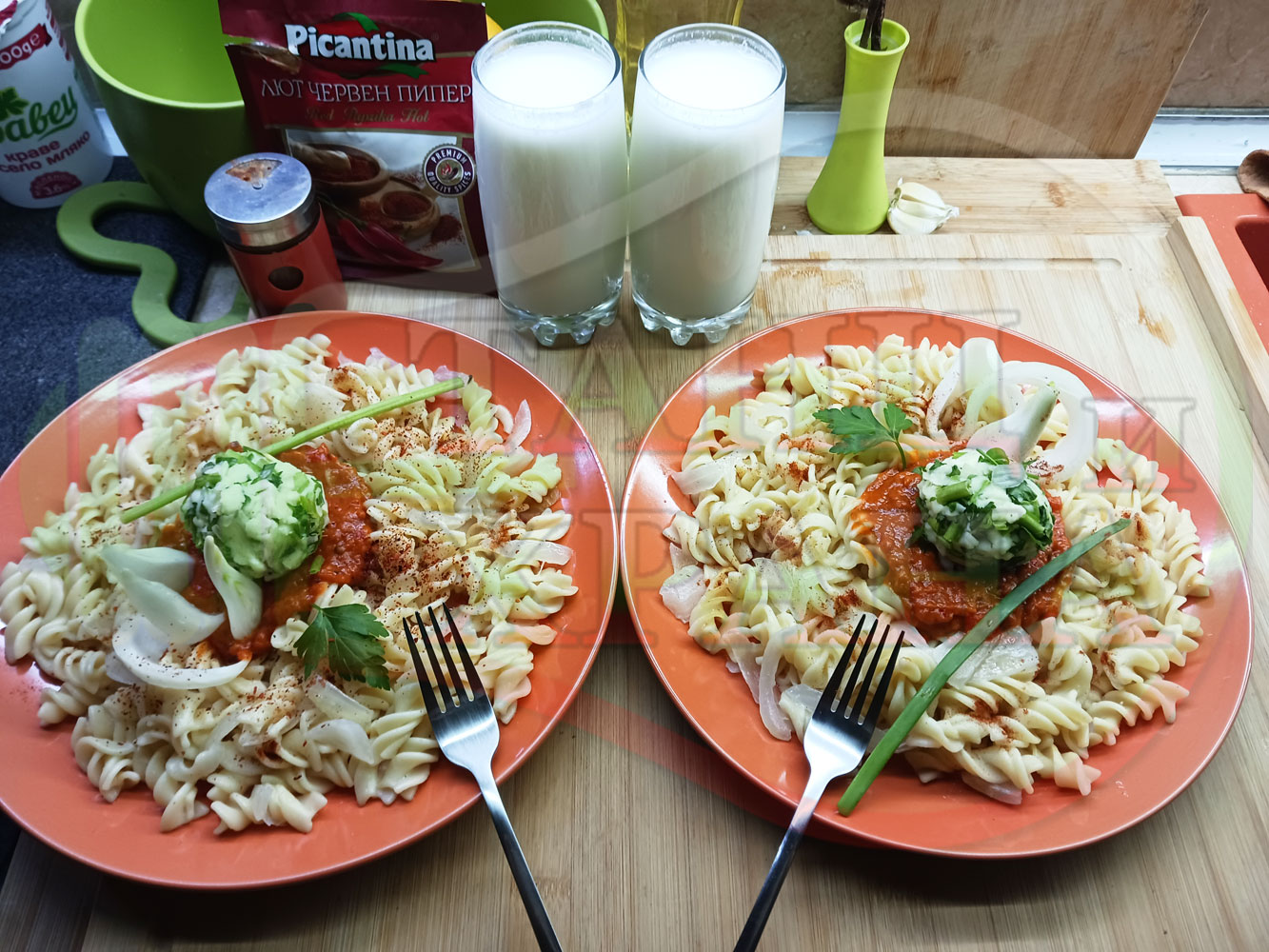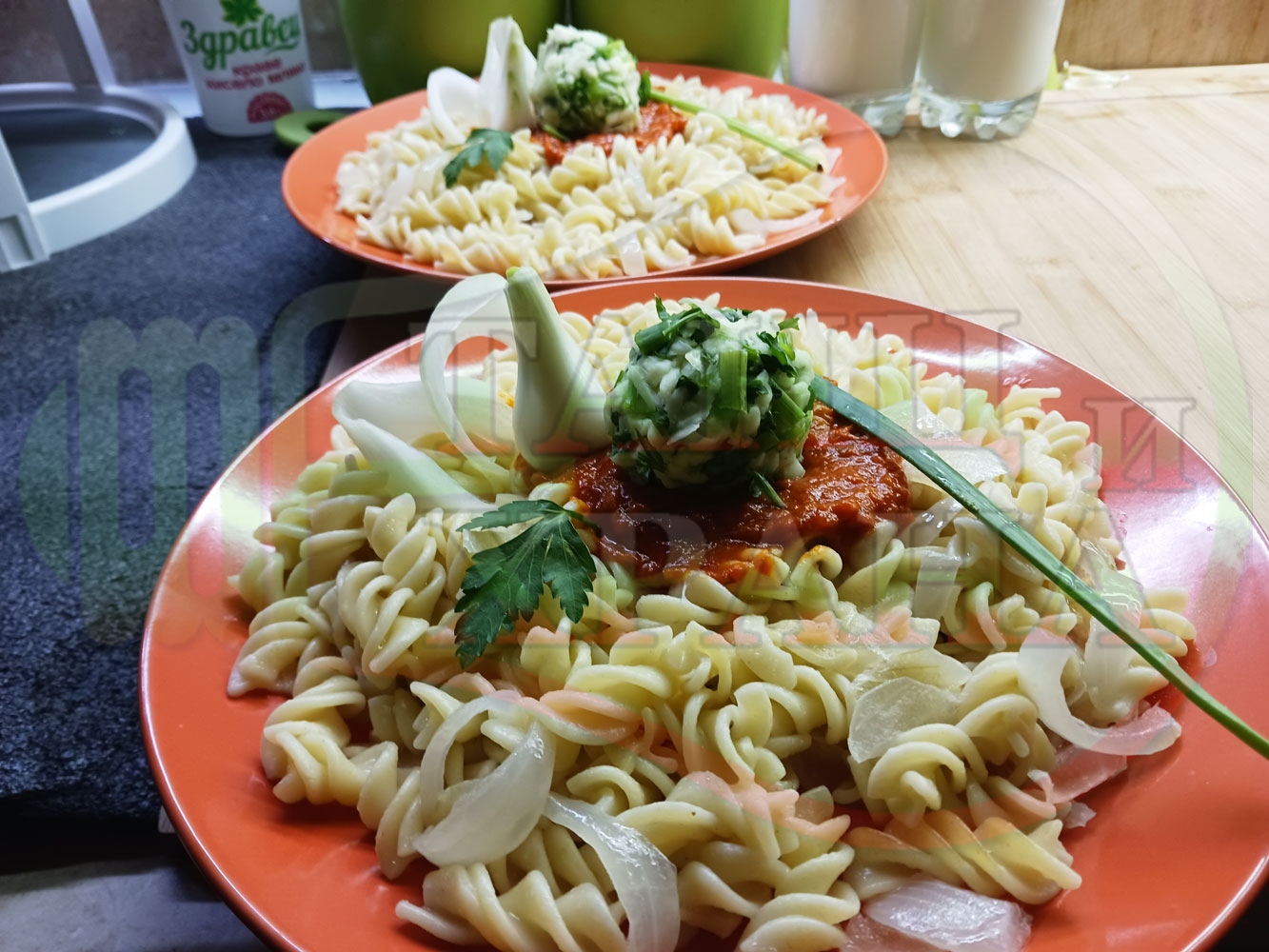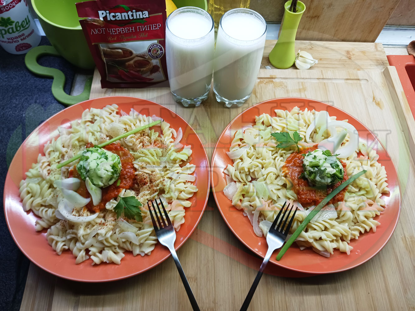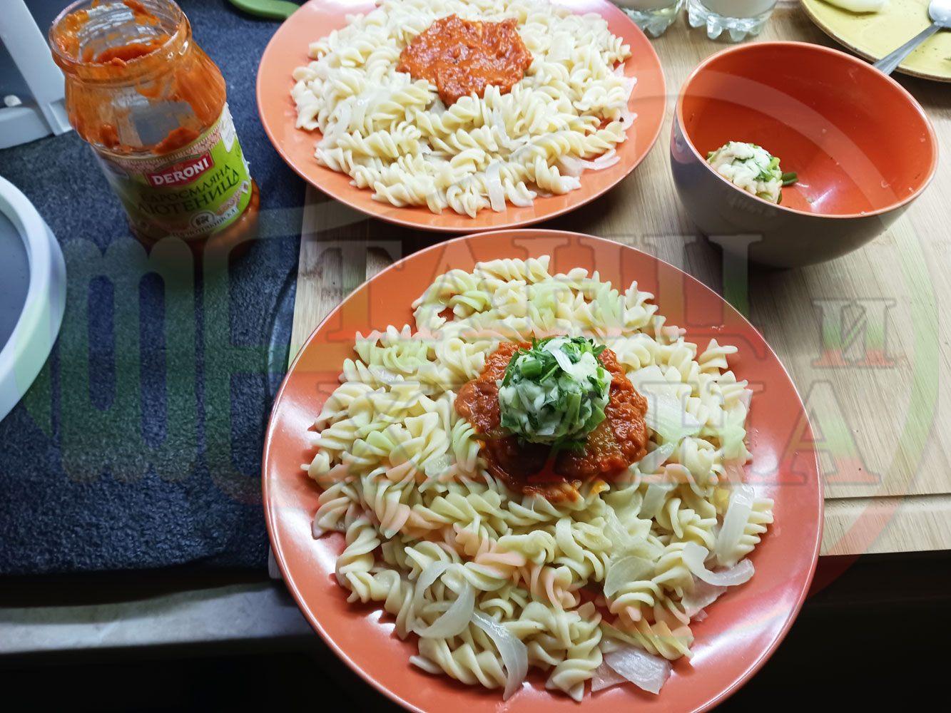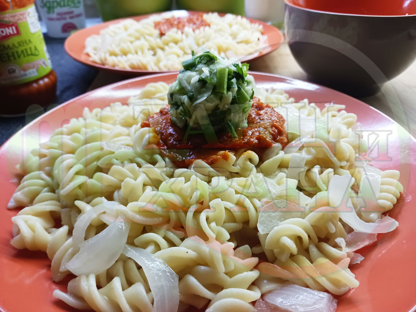 Спретнах изключително вкусни вити макарони, сварени със сок от кисело зеле и кромид лук. Гарнирах макароните с лютенична основа от едросмляна лютеница и с топки от кашкавалено магданозен пряснолучен крем, приготвен с млечен кашкавал, пресен зелен лук и свеж магданоз. Отново се получи невероятна вкусно, вкусна, вкусотия (вкуснотия)...