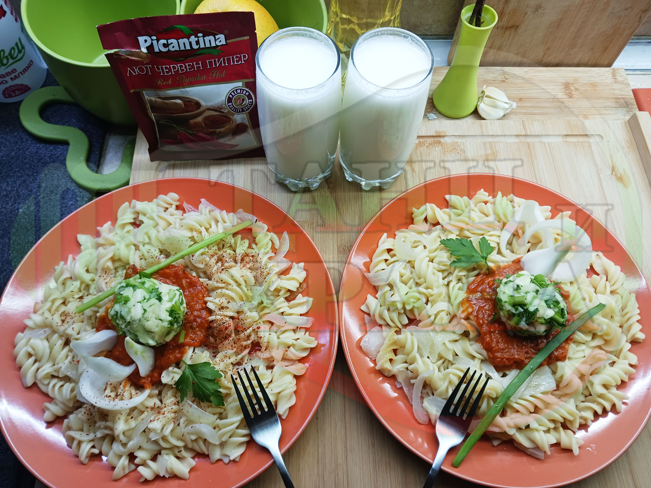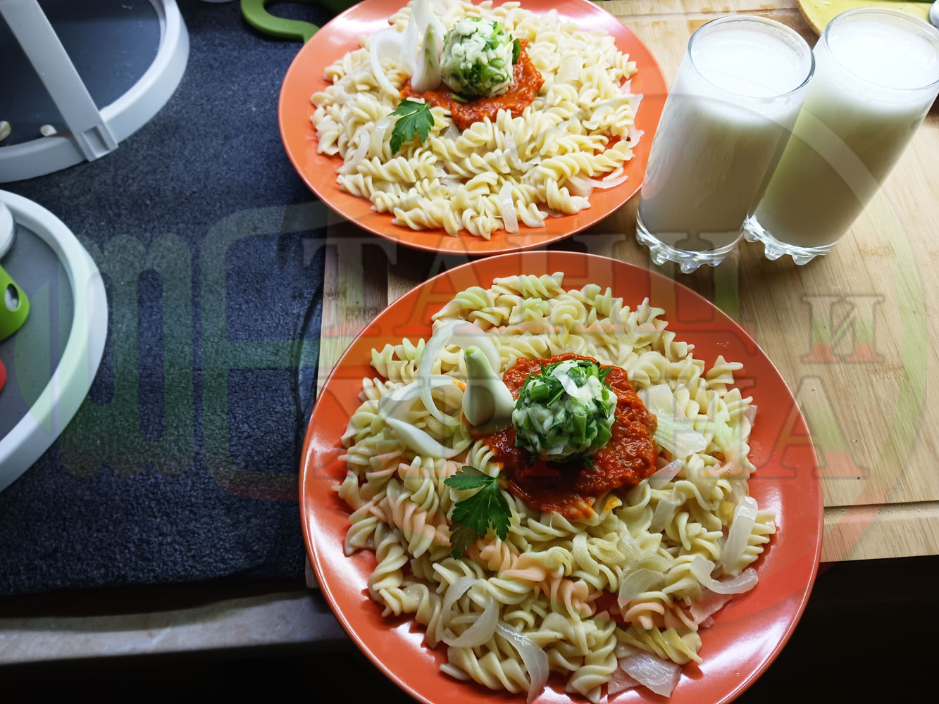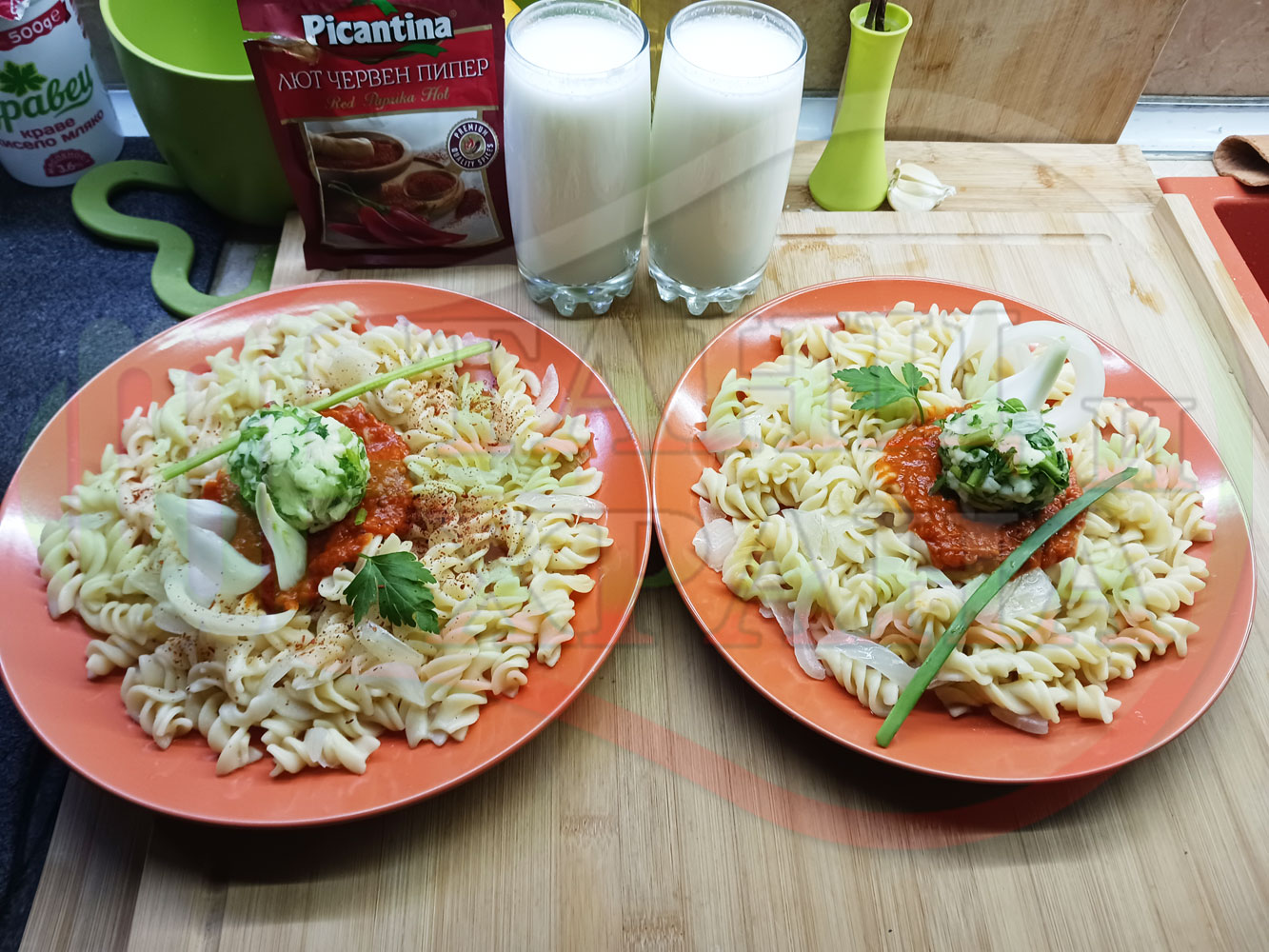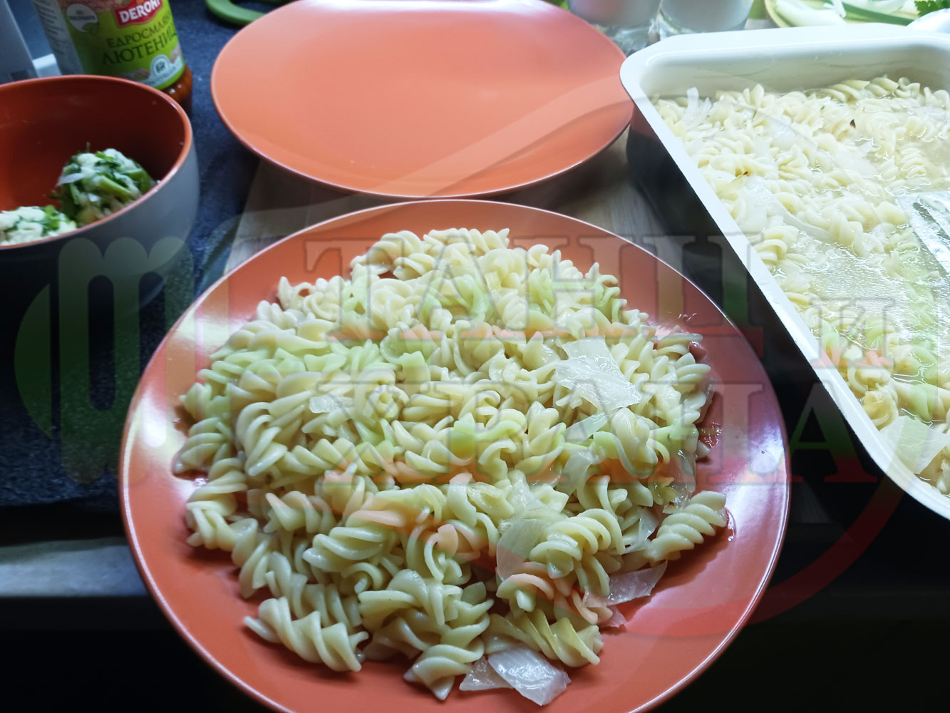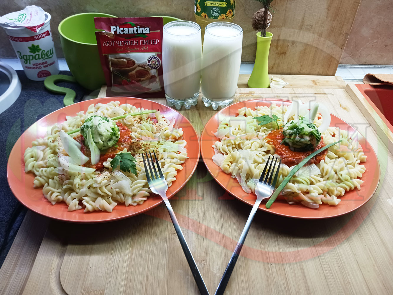 Спретнах изключително вкусни вити макарони, сварени със сок от кисело зеле и кромид лук. Гарнирах макароните с лютенична основа от едросмляна лютеница и с топки от кашкавалено магданозен пряснолучен крем, приготвен с млечен кашкавал, пресен зелен лук и свеж магданоз. Отново се получи невероятна вкусно, вкусна, вкусотия (вкуснотия)...