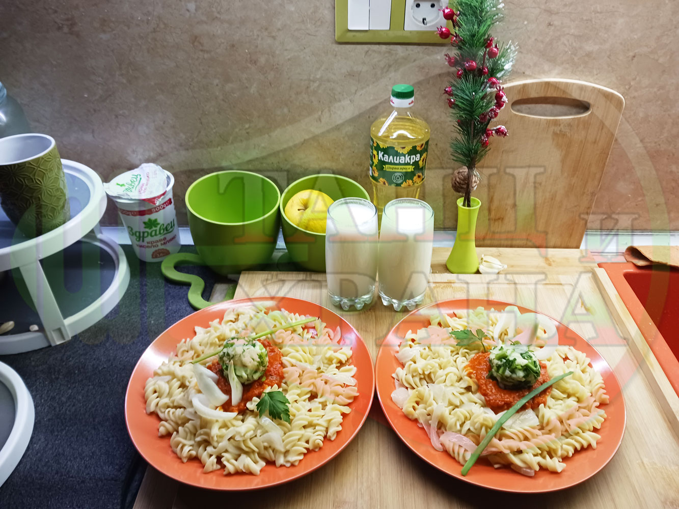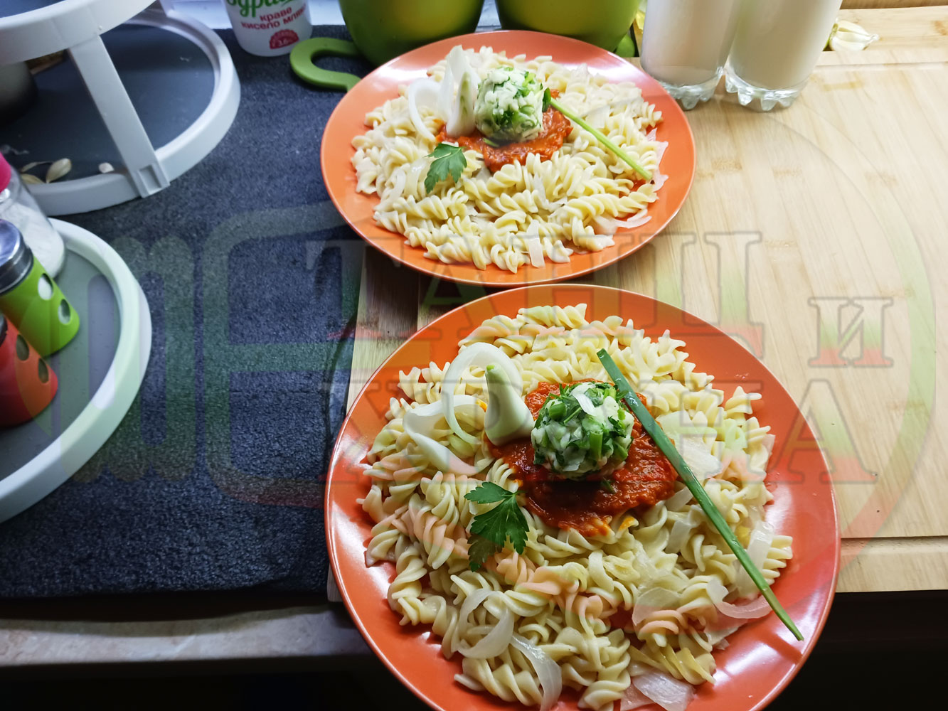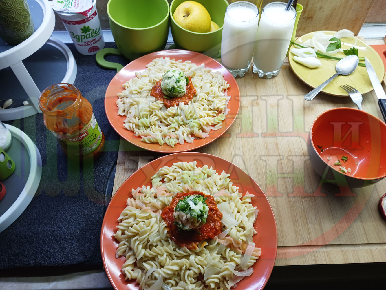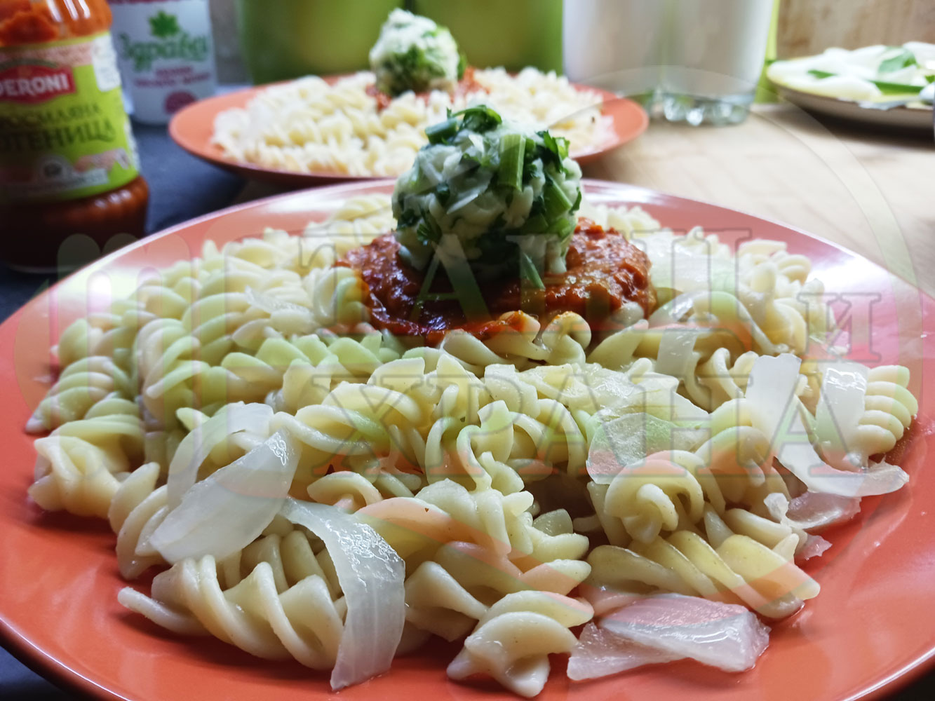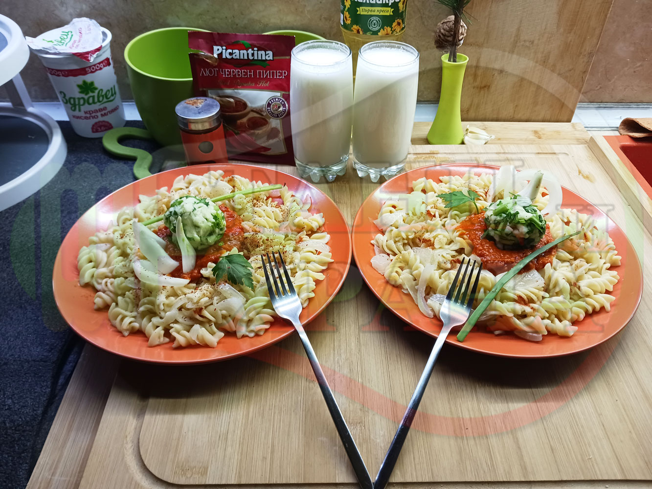 Спретнах изключително вкусни вити макарони, сварени със сок от кисело зеле и кромид лук. Гарнирах макароните с лютенична основа от едросмляна лютеница и с топки от кашкавалено магданозен пряснолучен крем, приготвен с млечен кашкавал, пресен зелен лук и свеж магданоз. Отново се получи невероятна вкусно, вкусна, вкусотия (вкуснотия)...