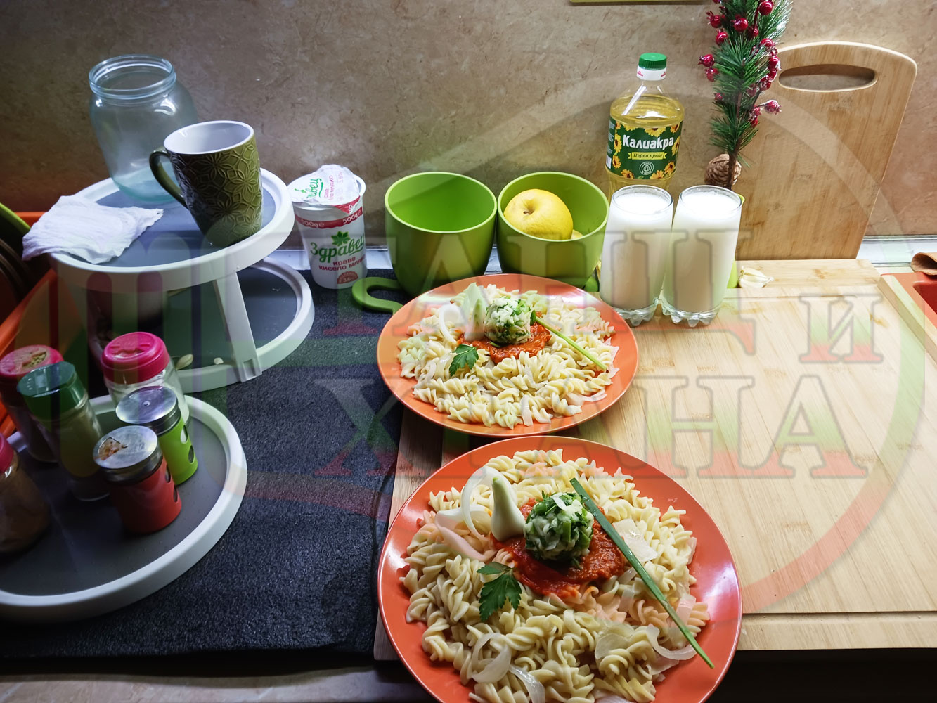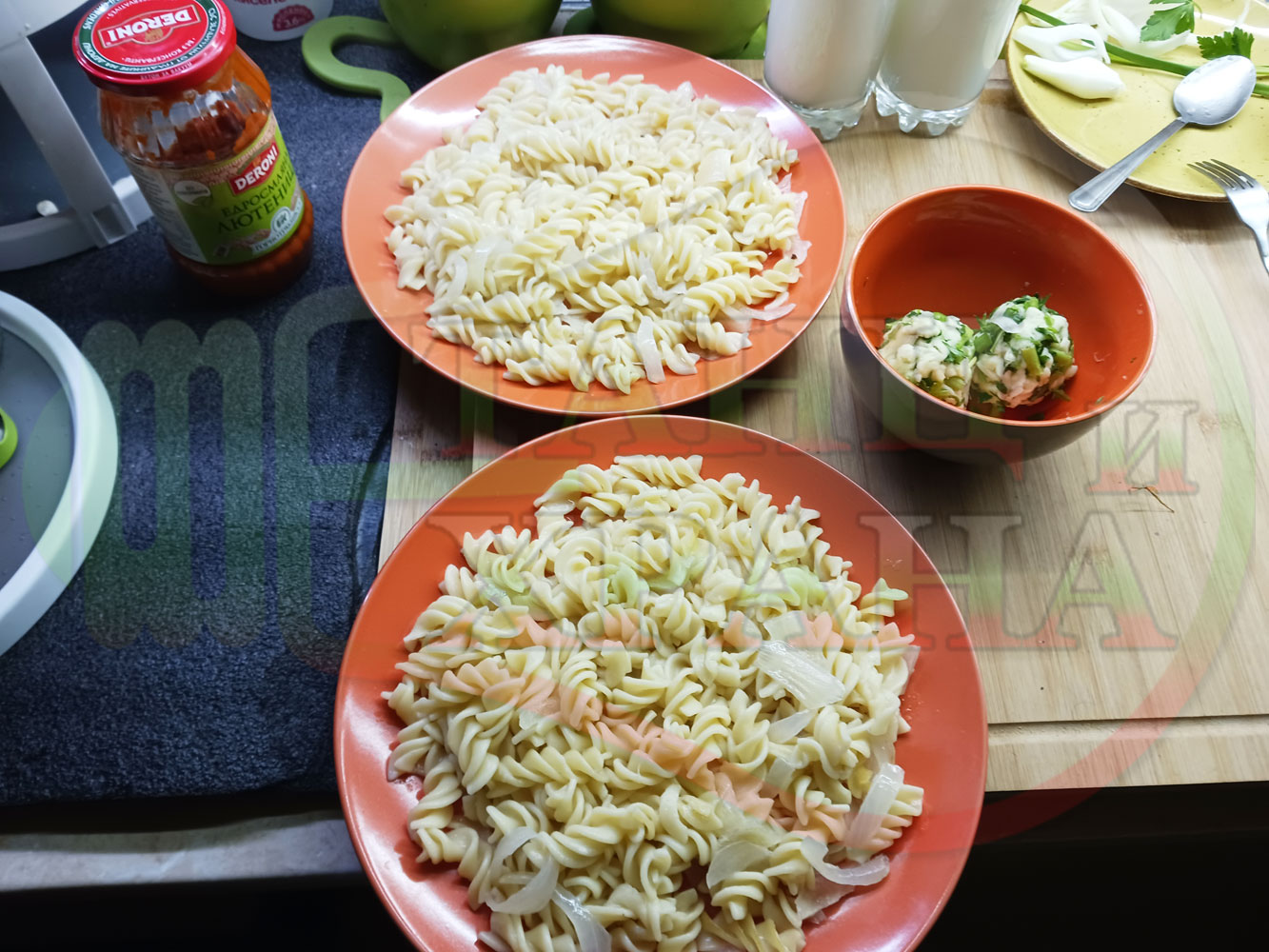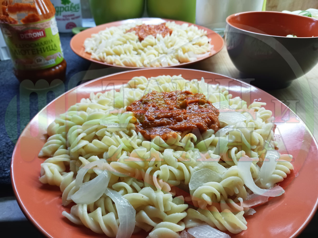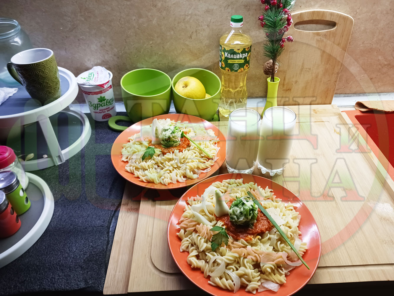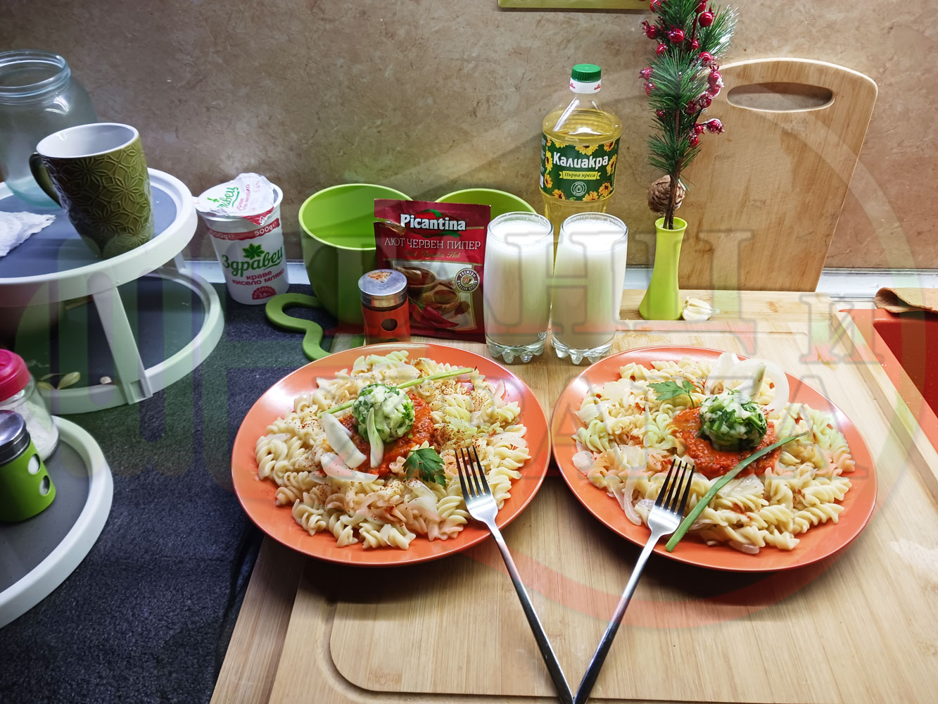Спретнах изключително вкусни вити макарони, сварени със сок от кисело зеле и кромид лук. Гарнирах макароните с лютенична основа от едросмляна лютеница и с топки от кашкавалено магданозен пряснолучен крем, приготвен с млечен кашкавал, пресен зелен лук и свеж магданоз. Отново се получи невероятна вкусно, вкусна, вкусотия (вкуснотия)...