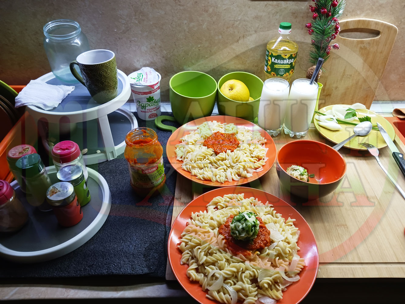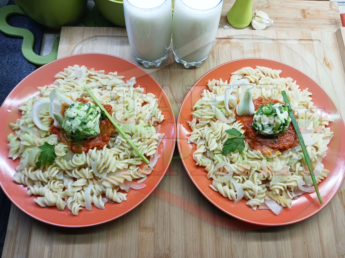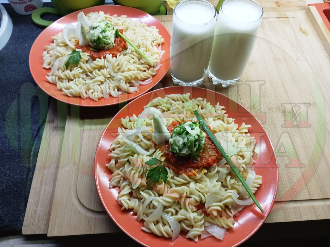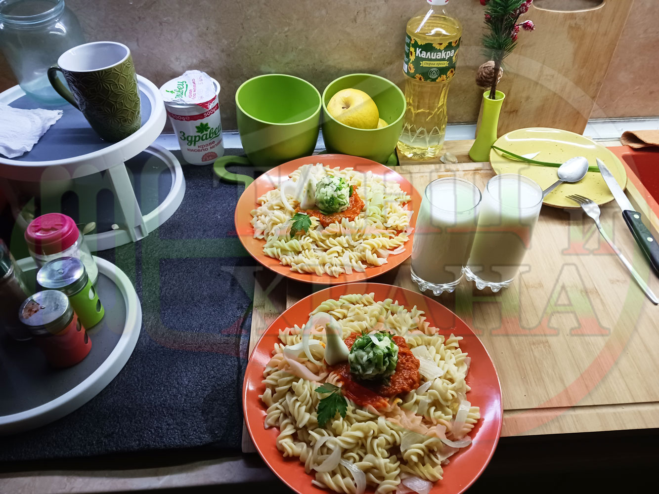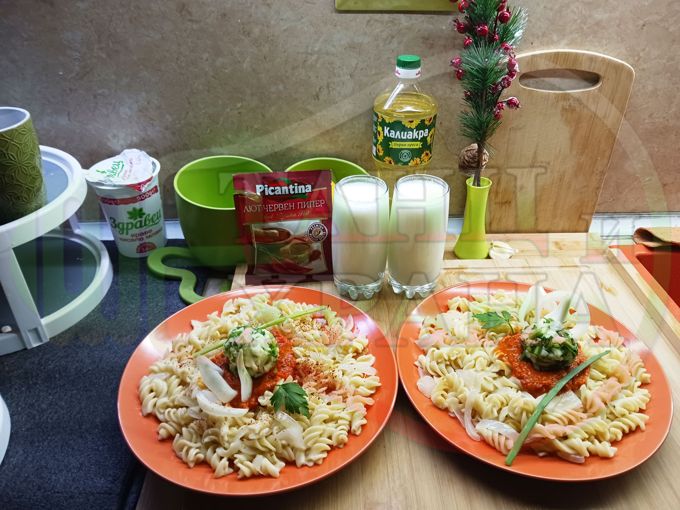 Спретнах изключително вкусни вити макарони, сварени със сок от кисело зеле и кромид лук. Гарнирах макароните с лютенична основа от едросмляна лютеница и с топки от кашкавалено магданозен пряснолучен крем, приготвен с млечен кашкавал, пресен зелен лук и свеж магданоз. Отново се получи невероятна вкусно, вкусна, вкусотия (вкуснотия)...