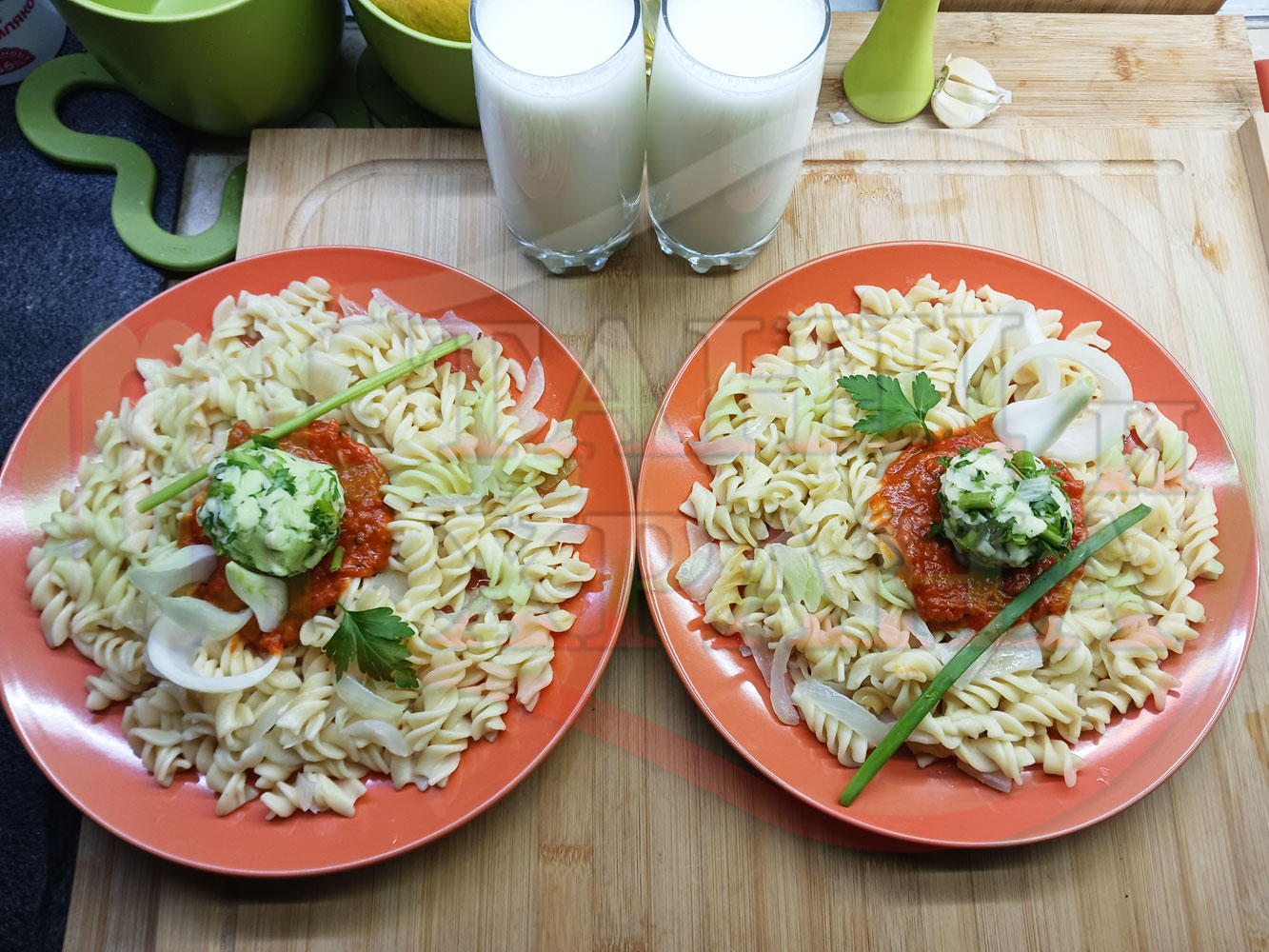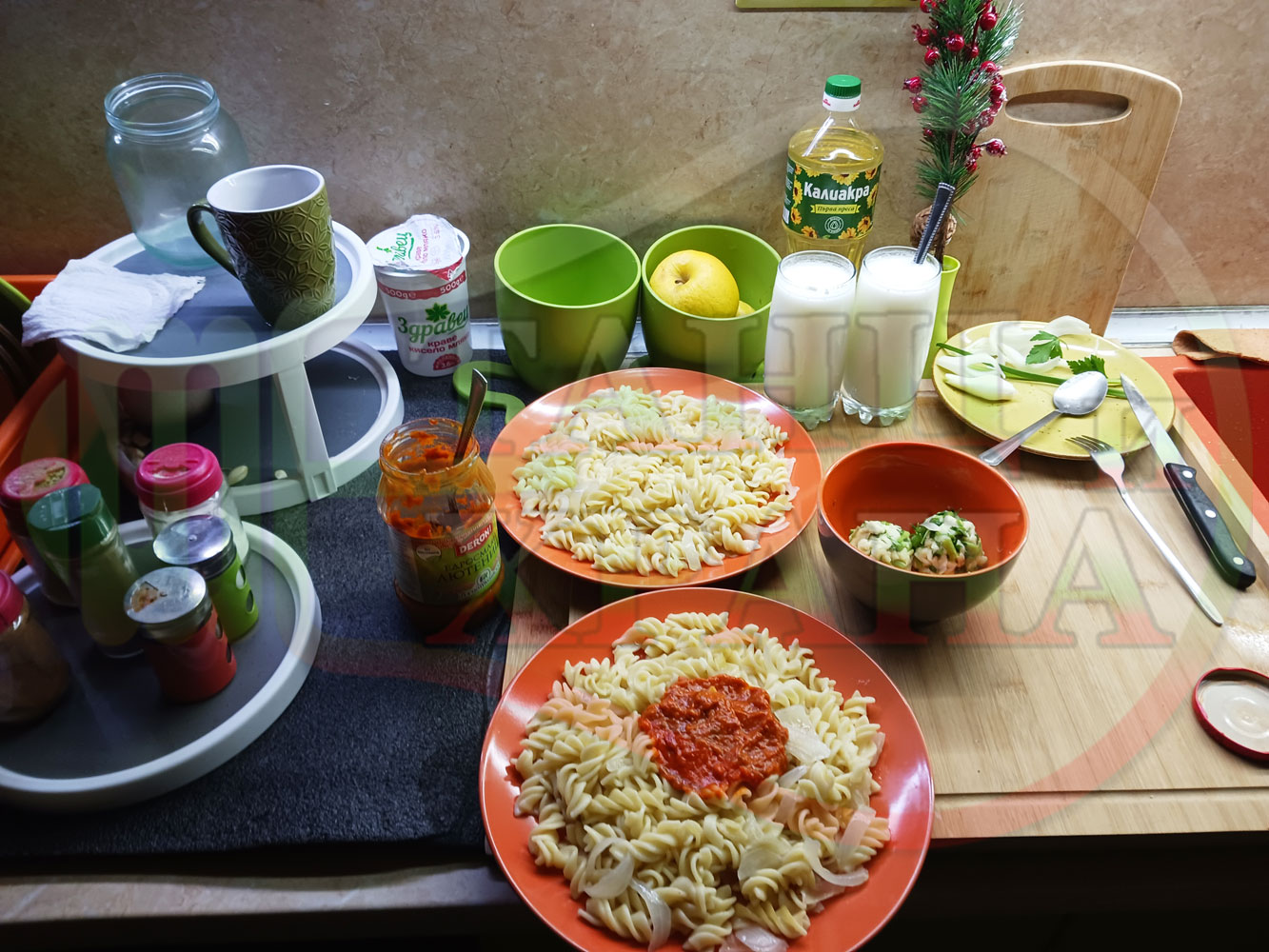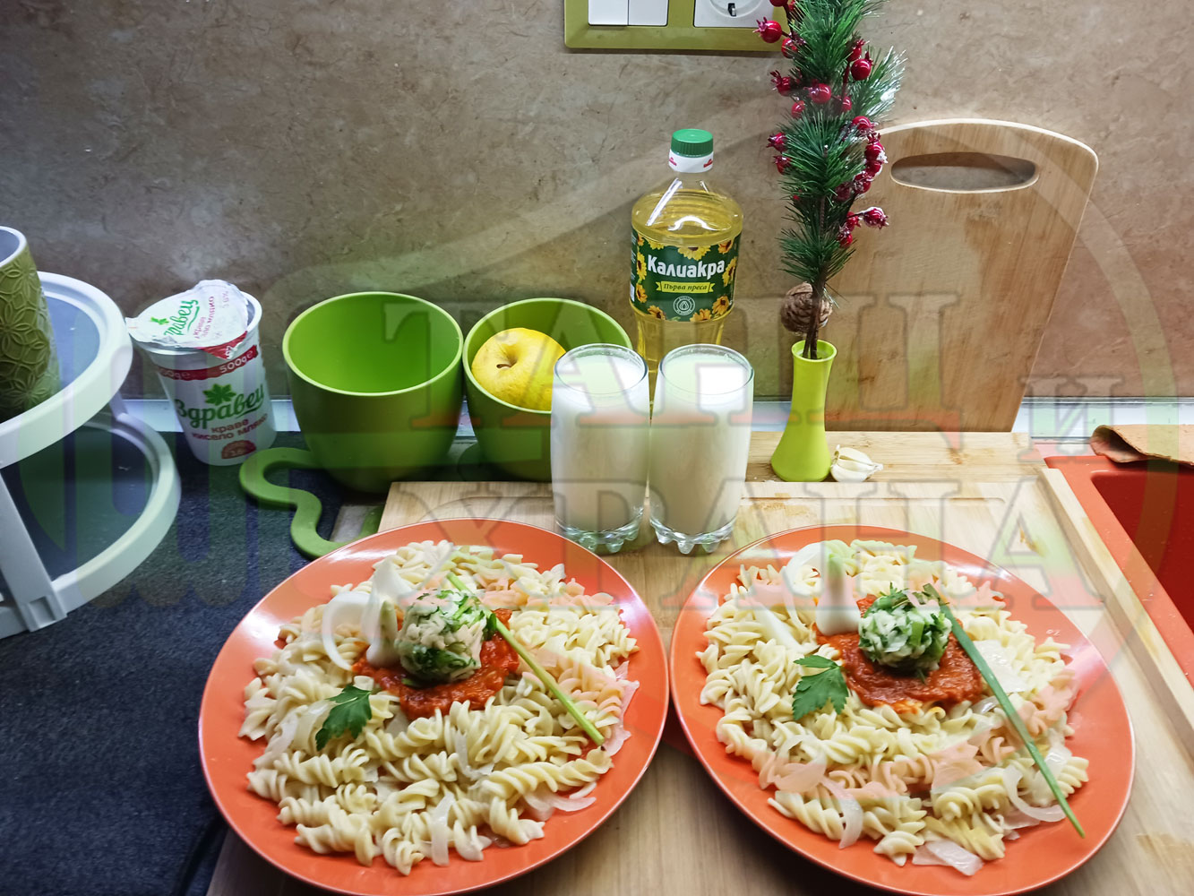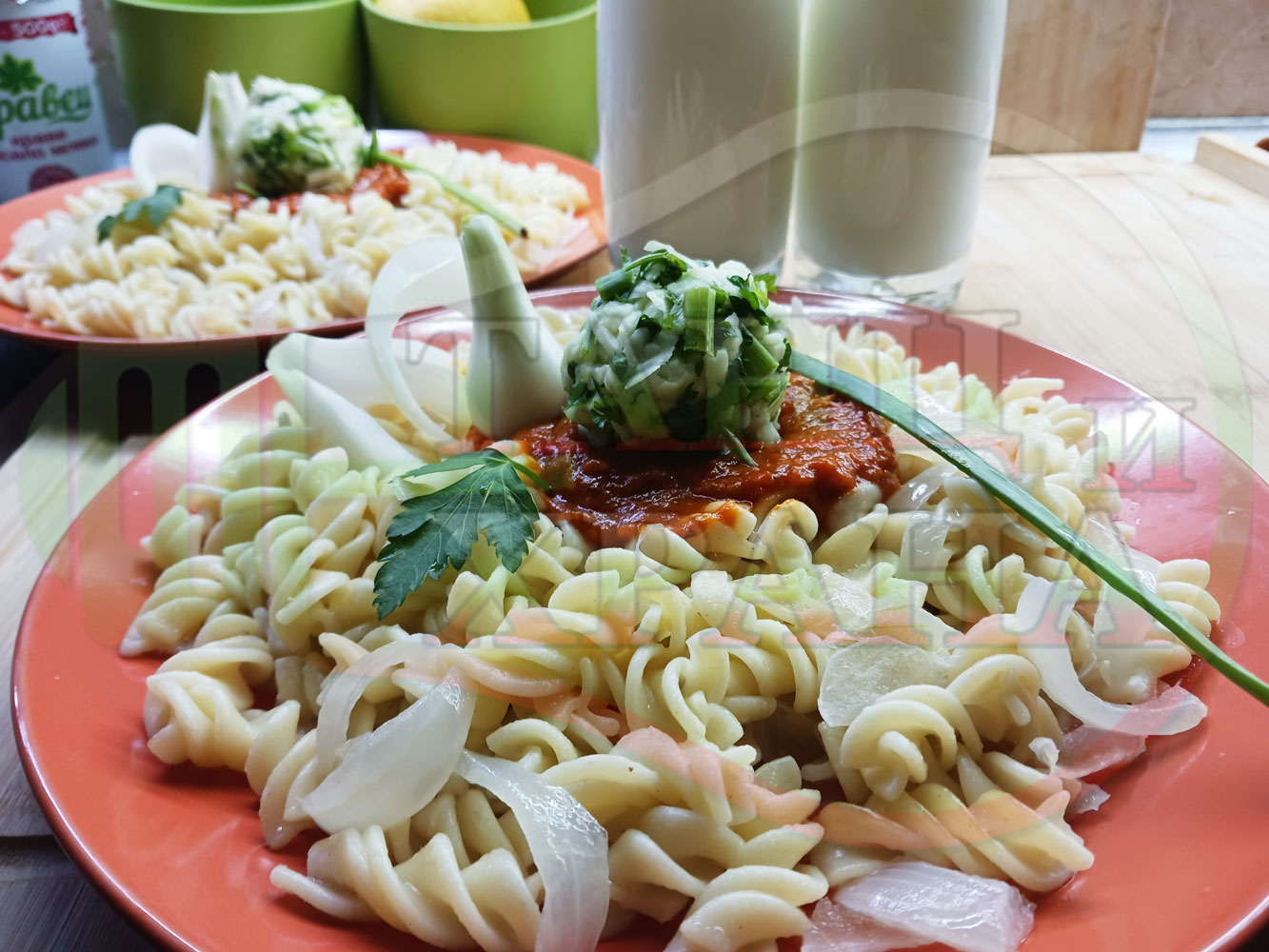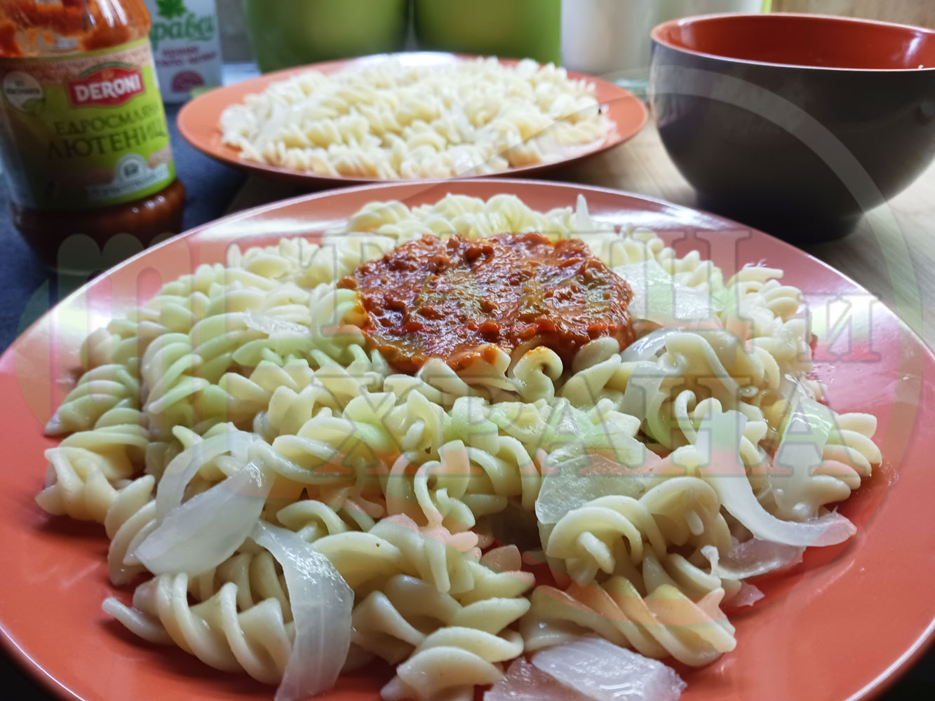 Спретнах изключително вкусни вити макарони, сварени със сок от кисело зеле и кромид лук. Гарнирах макароните с лютенична основа от едросмляна лютеница и с топки от кашкавалено магданозен пряснолучен крем, приготвен с млечен кашкавал, пресен зелен лук и свеж магданоз. Отново се получи невероятна вкусно, вкусна, вкусотия (вкуснотия)...
