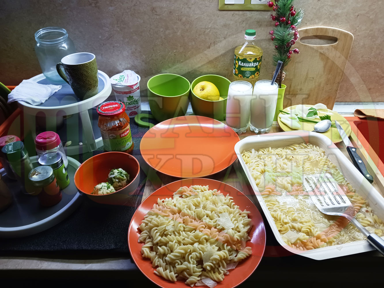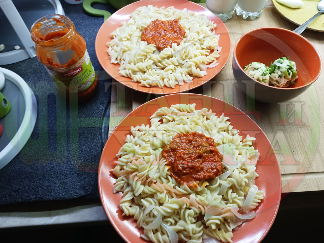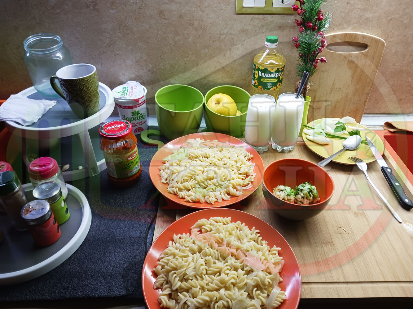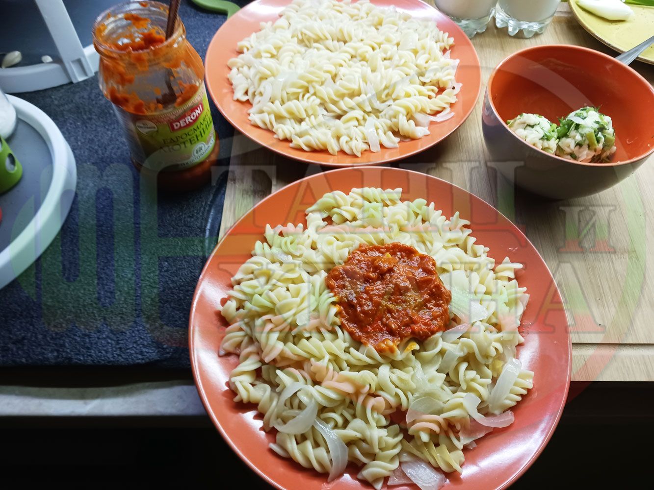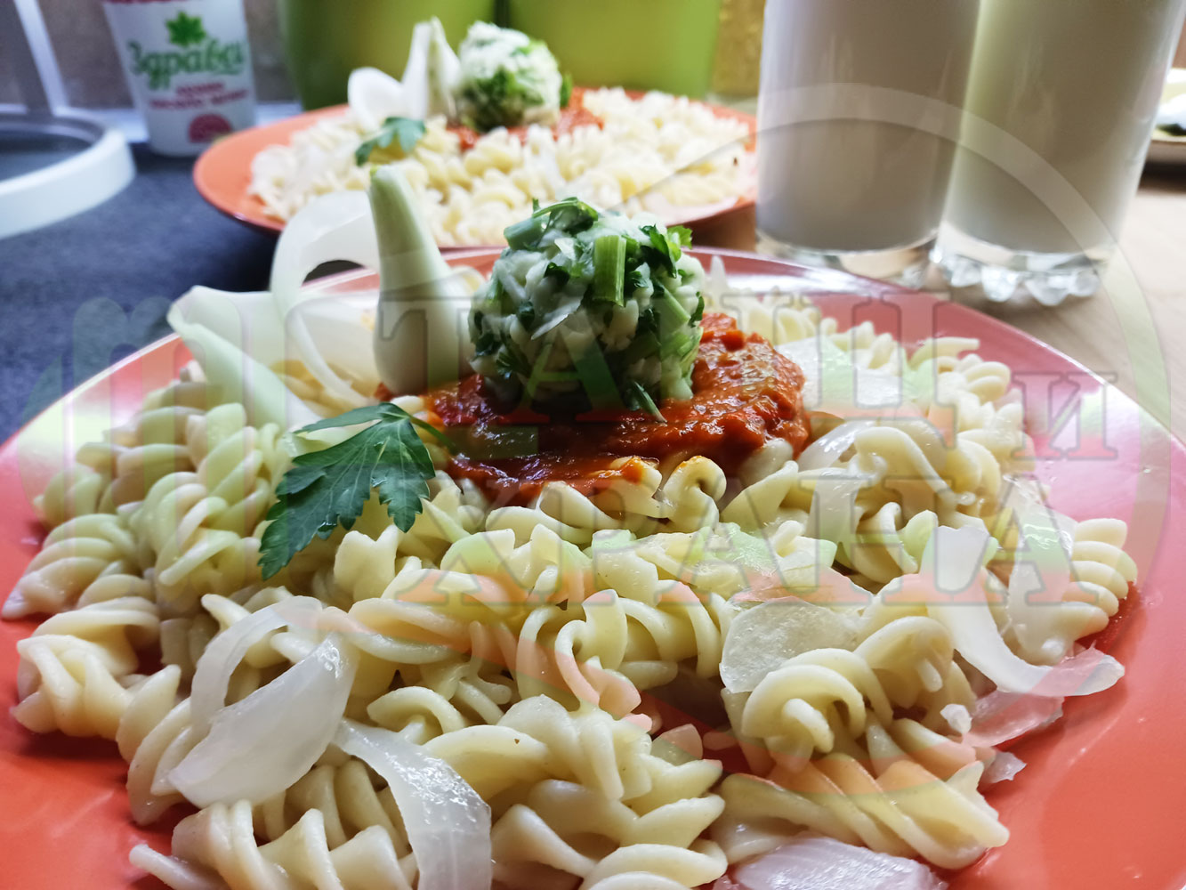 Спретнах изключително вкусни вити макарони, сварени със сок от кисело зеле и кромид лук. Гарнирах макароните с лютенична основа от едросмляна лютеница и с топки от кашкавалено магданозен пряснолучен крем, приготвен с млечен кашкавал, пресен зелен лук и свеж магданоз. Отново се получи невероятна вкусно, вкусна, вкусотия (вкуснотия)...