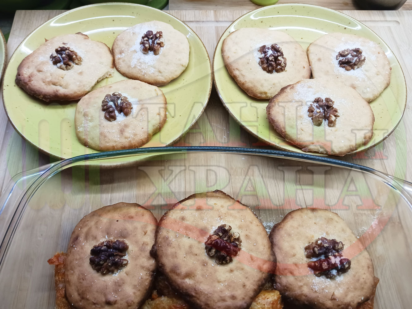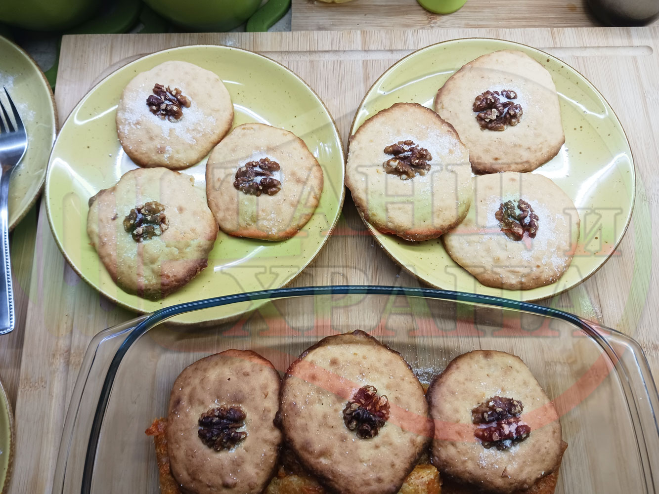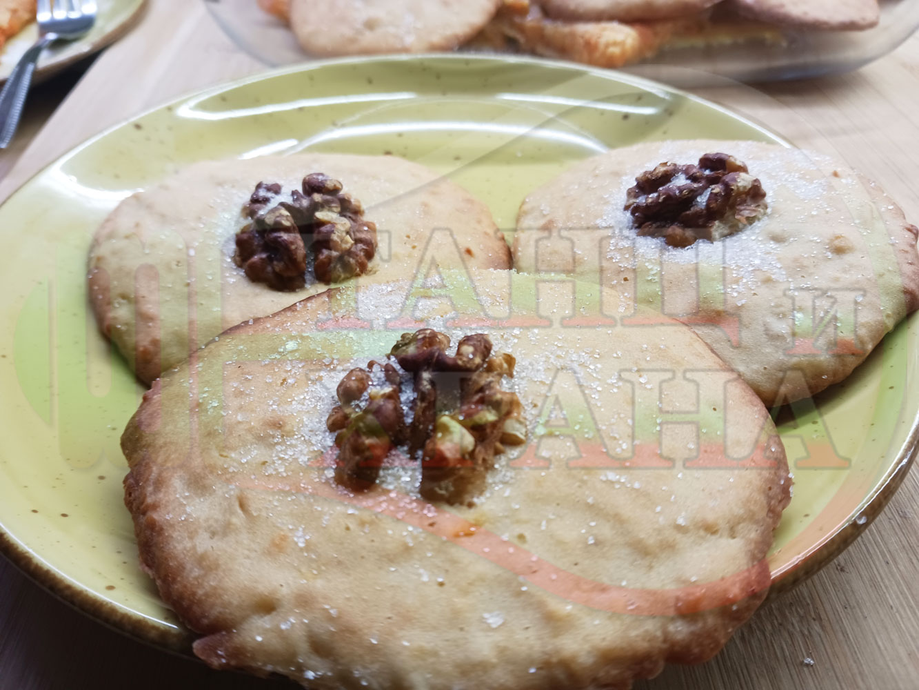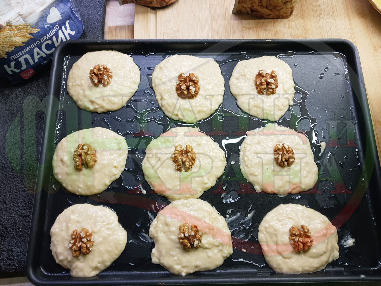Български курабийки "Крушови прясномлечни" приготвени с пресни круши и прясно мляко омесени с брашно, яйца, царевично нишесте и кристална захар запечени на фурна със сурови орехи - производни
