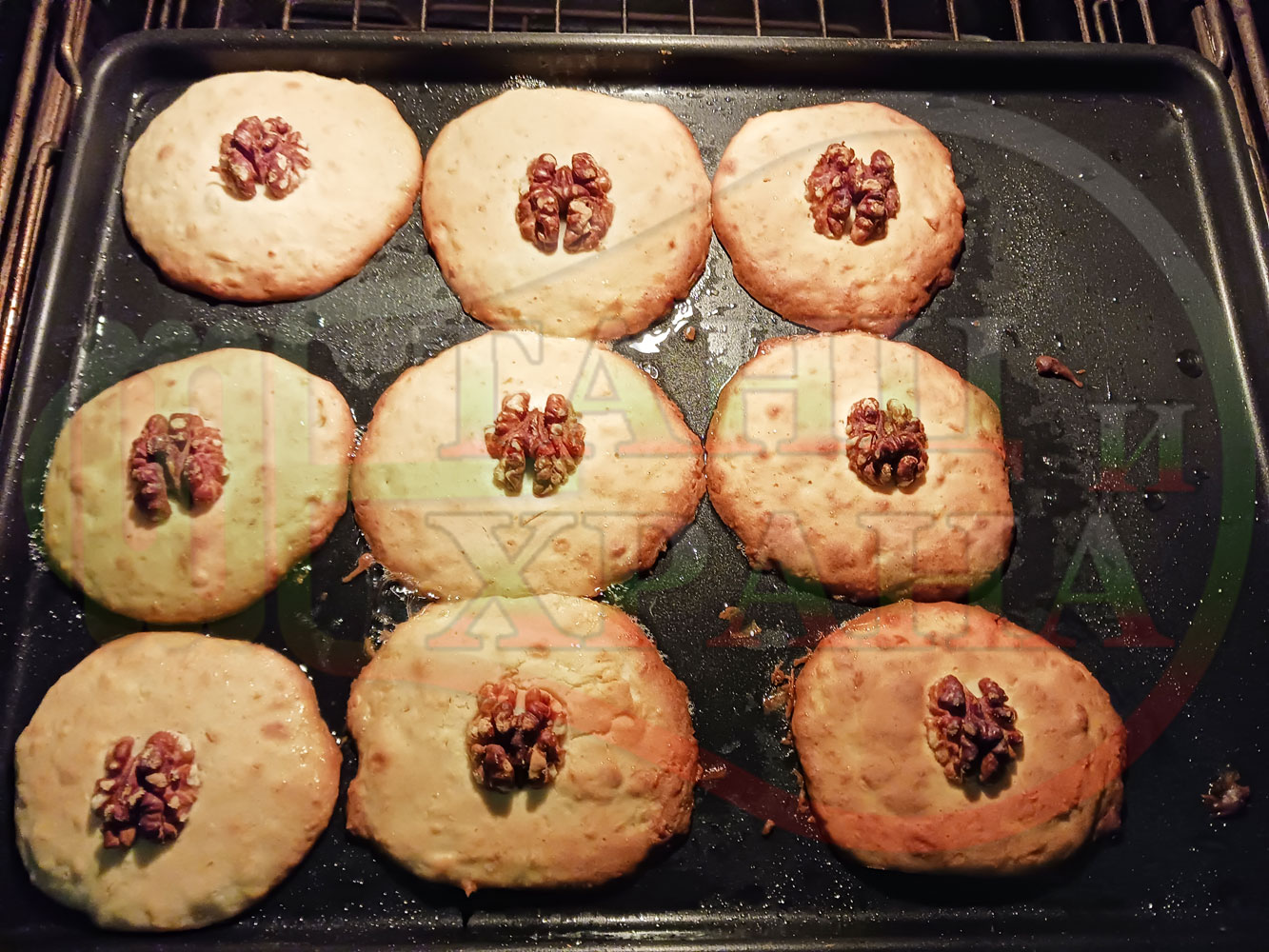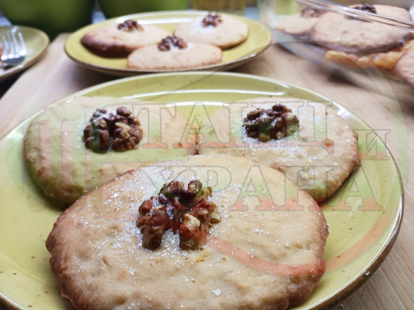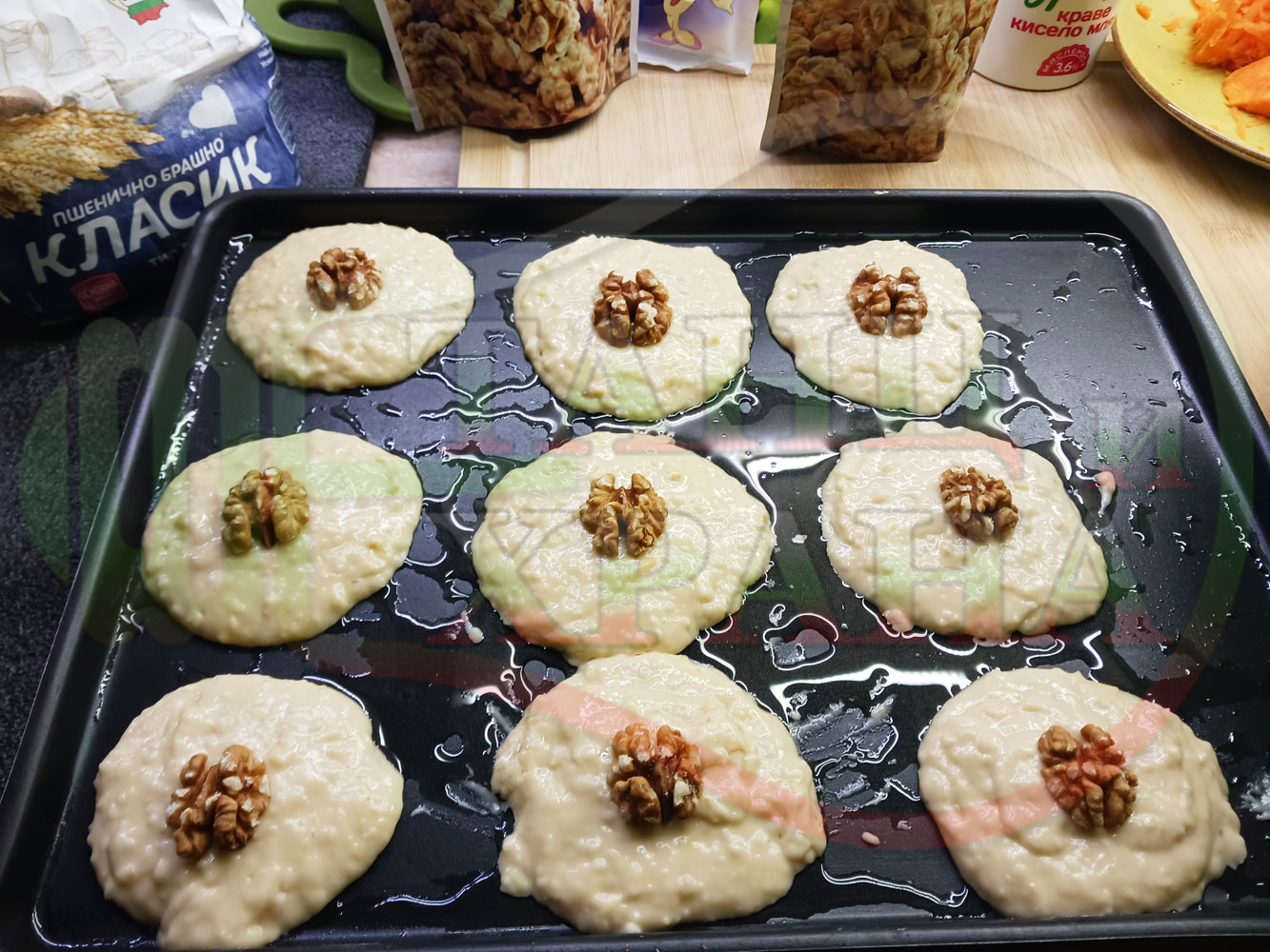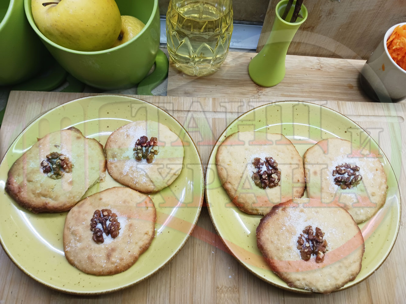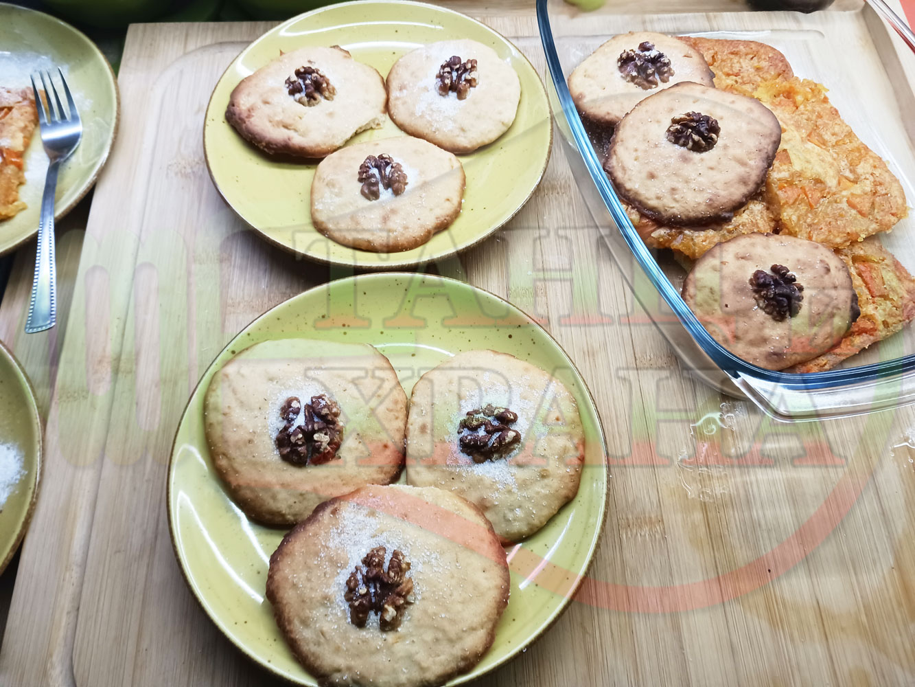 Български курабийки "Крушови прясномлечни" приготвени с пресни круши и прясно мляко омесени с брашно, яйца, царевично нишесте и кристална захар запечени на фурна със сурови орехи - производни
