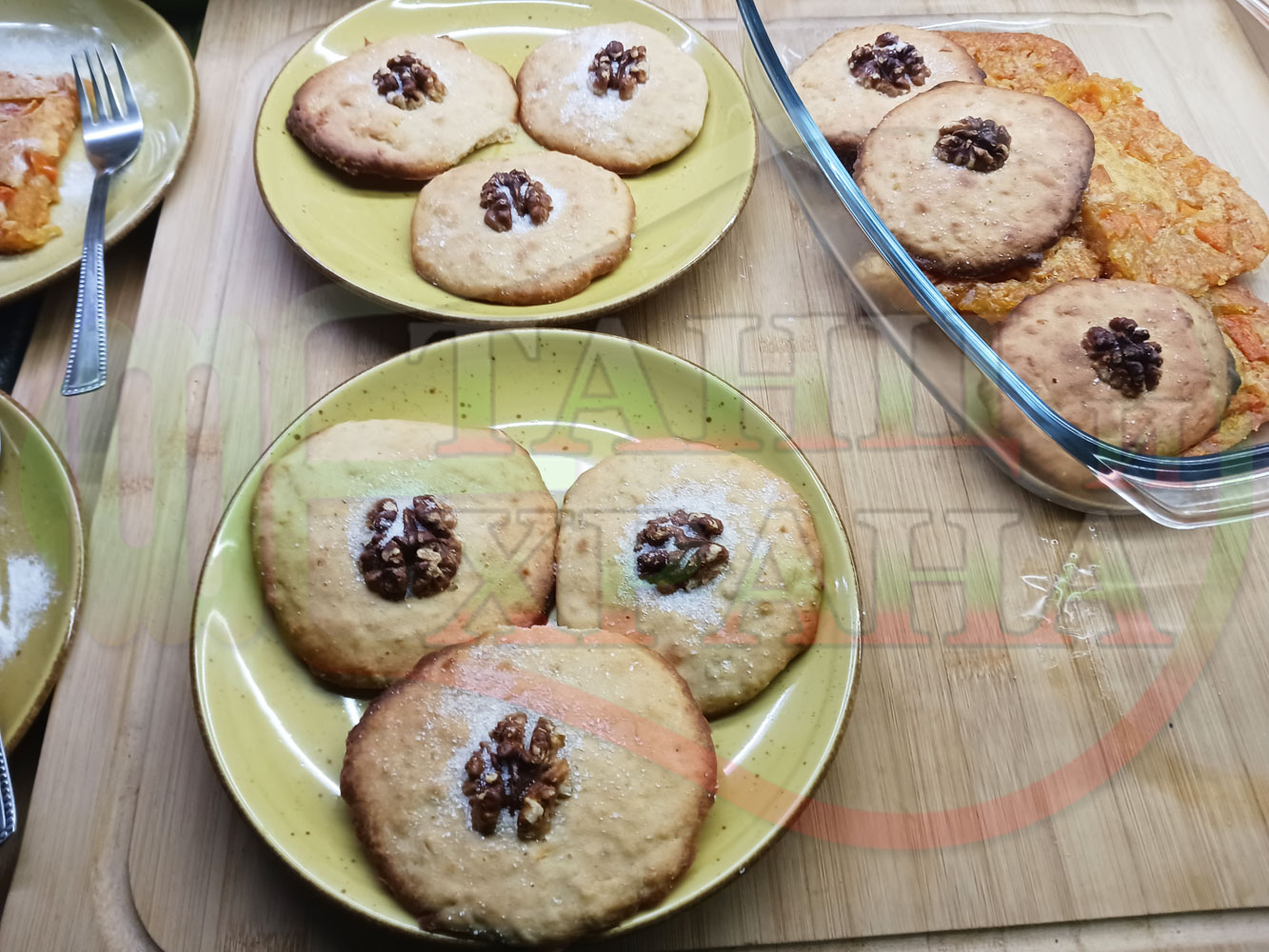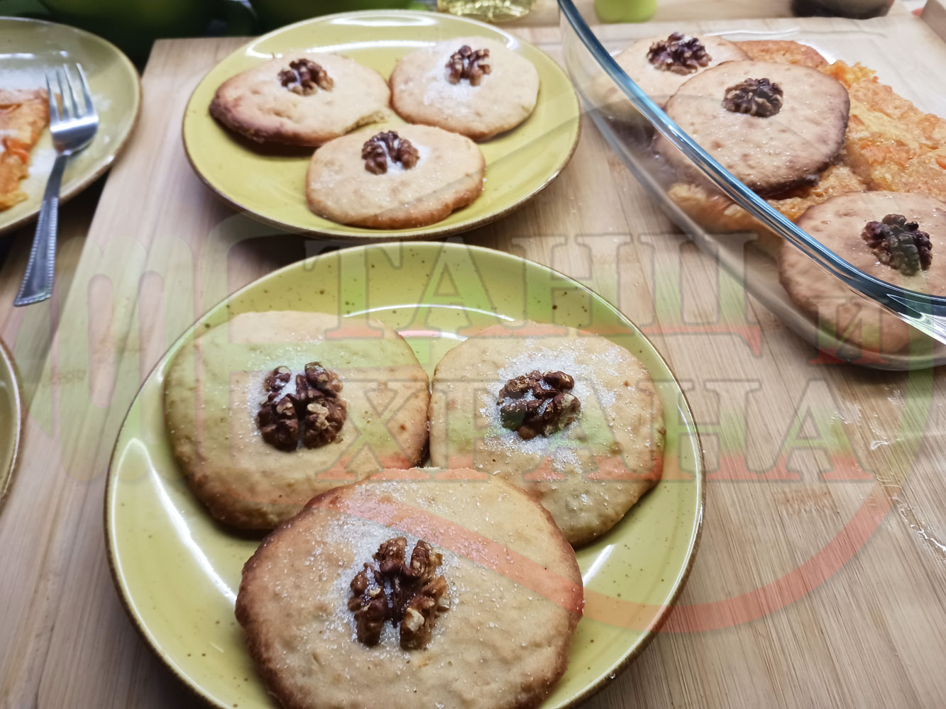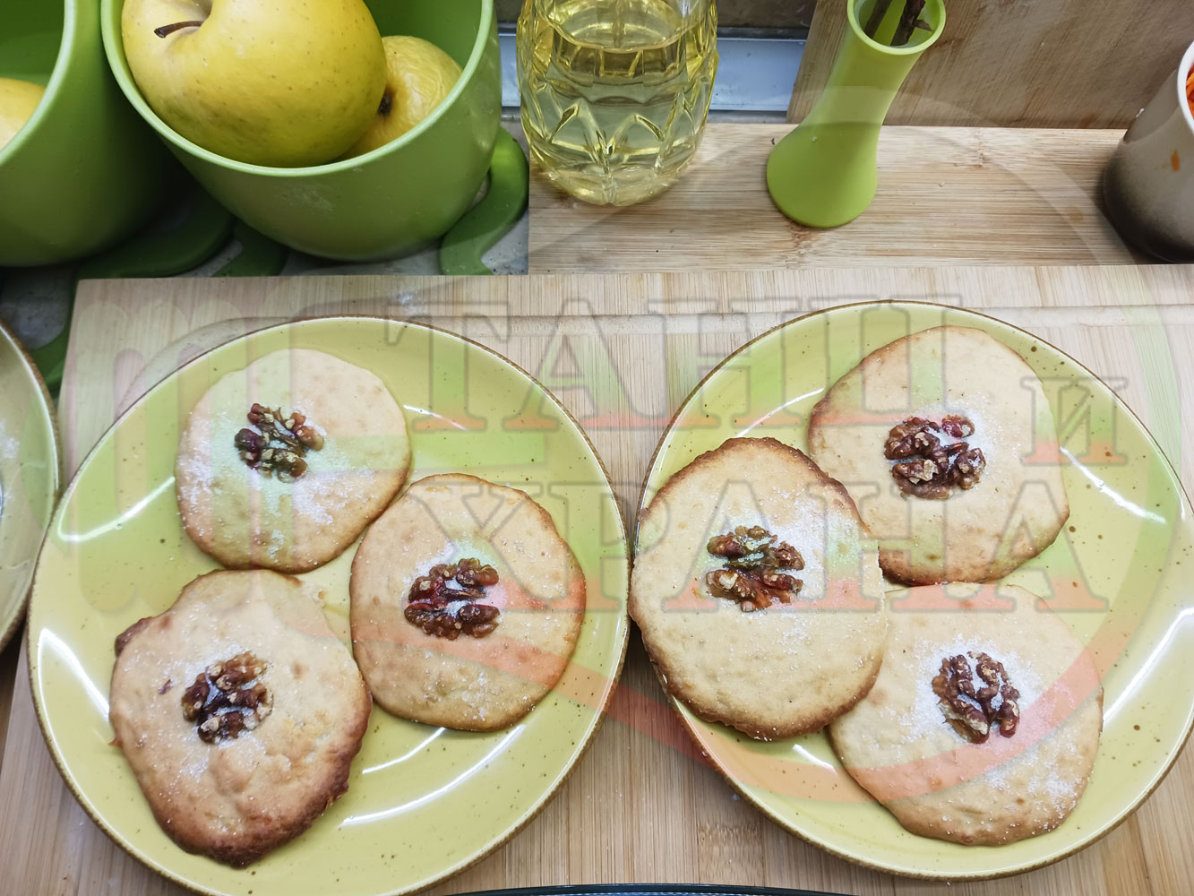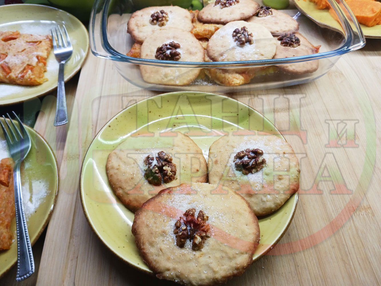 Български курабийки "Крушови прясномлечни" приготвени с пресни круши и прясно мляко омесени с брашно, яйца, царевично нишесте и кристална захар запечени на фурна със сурови орехи - производни