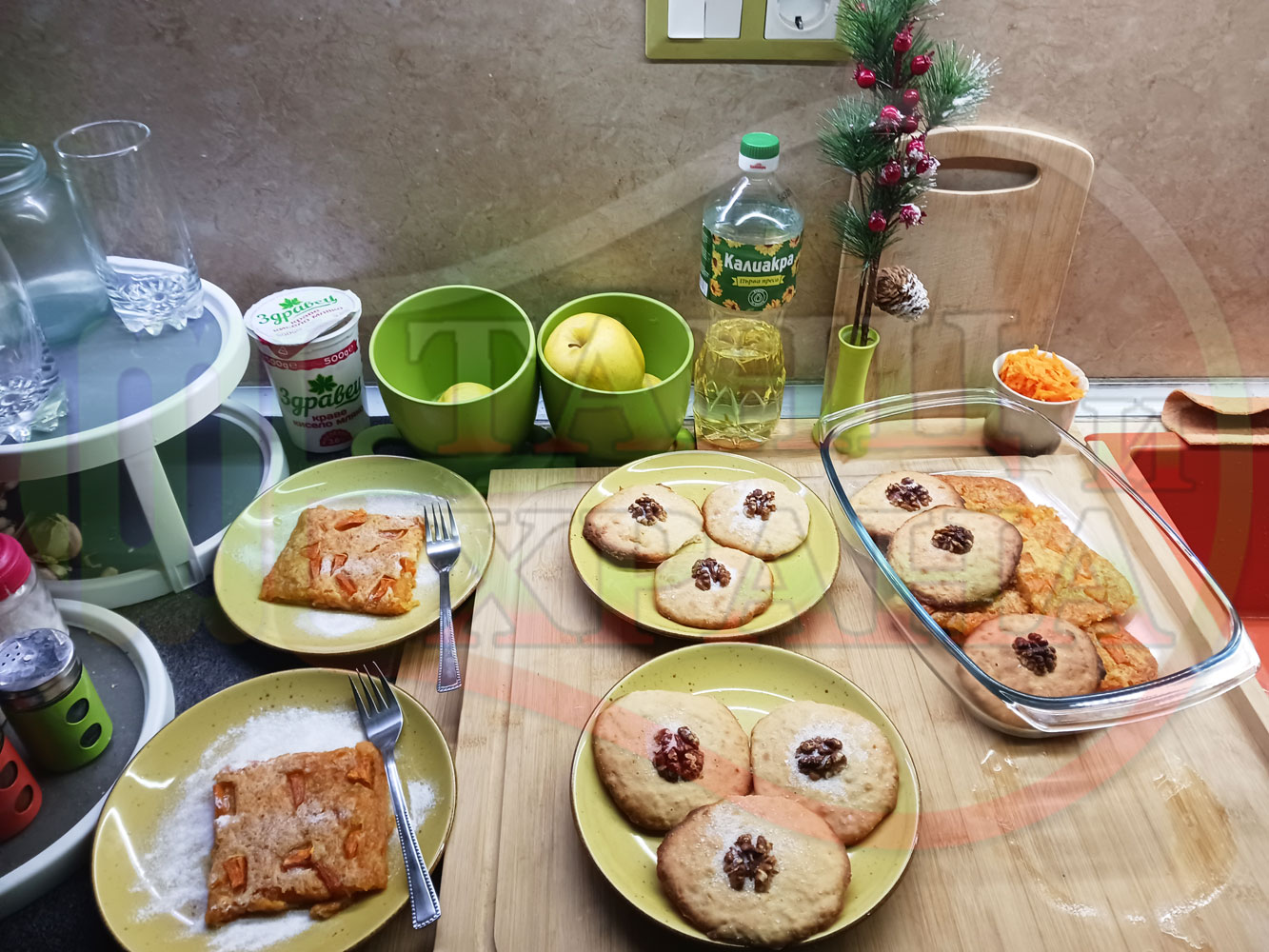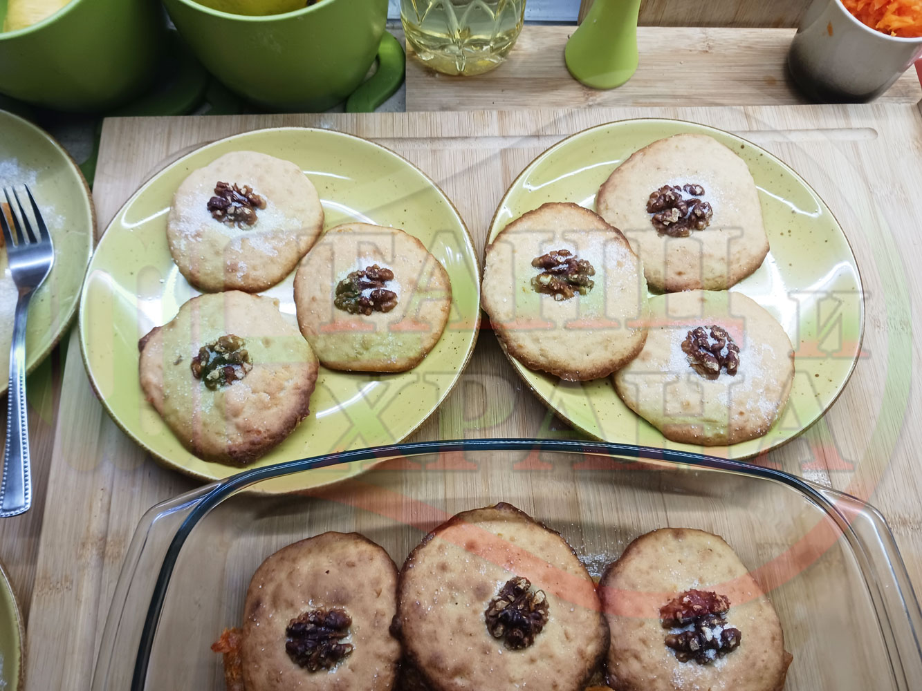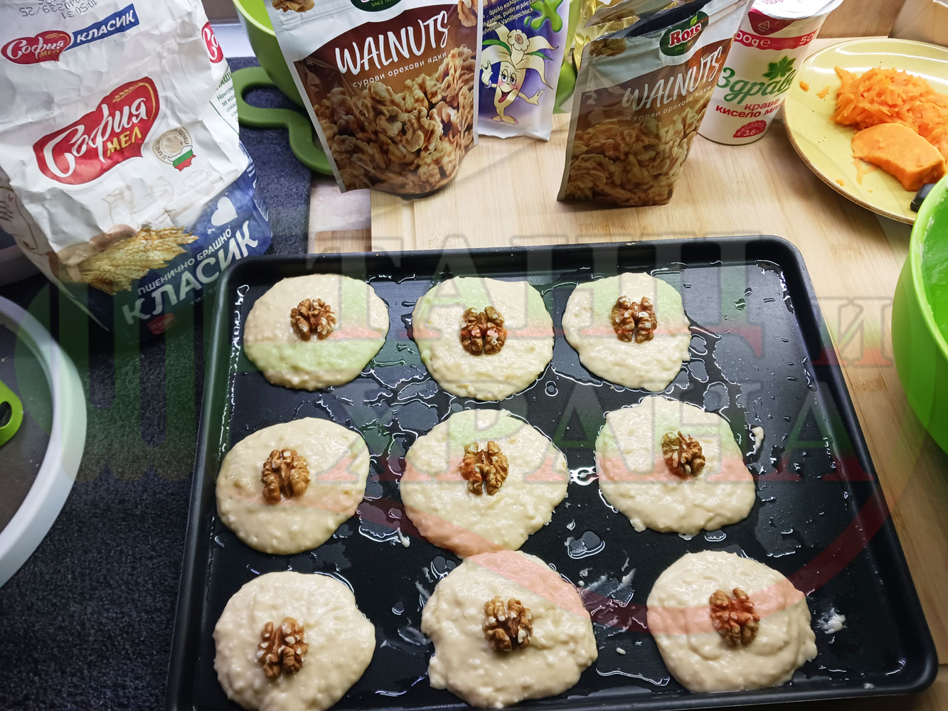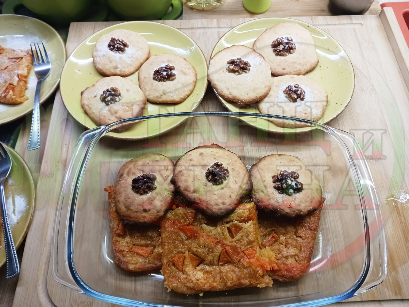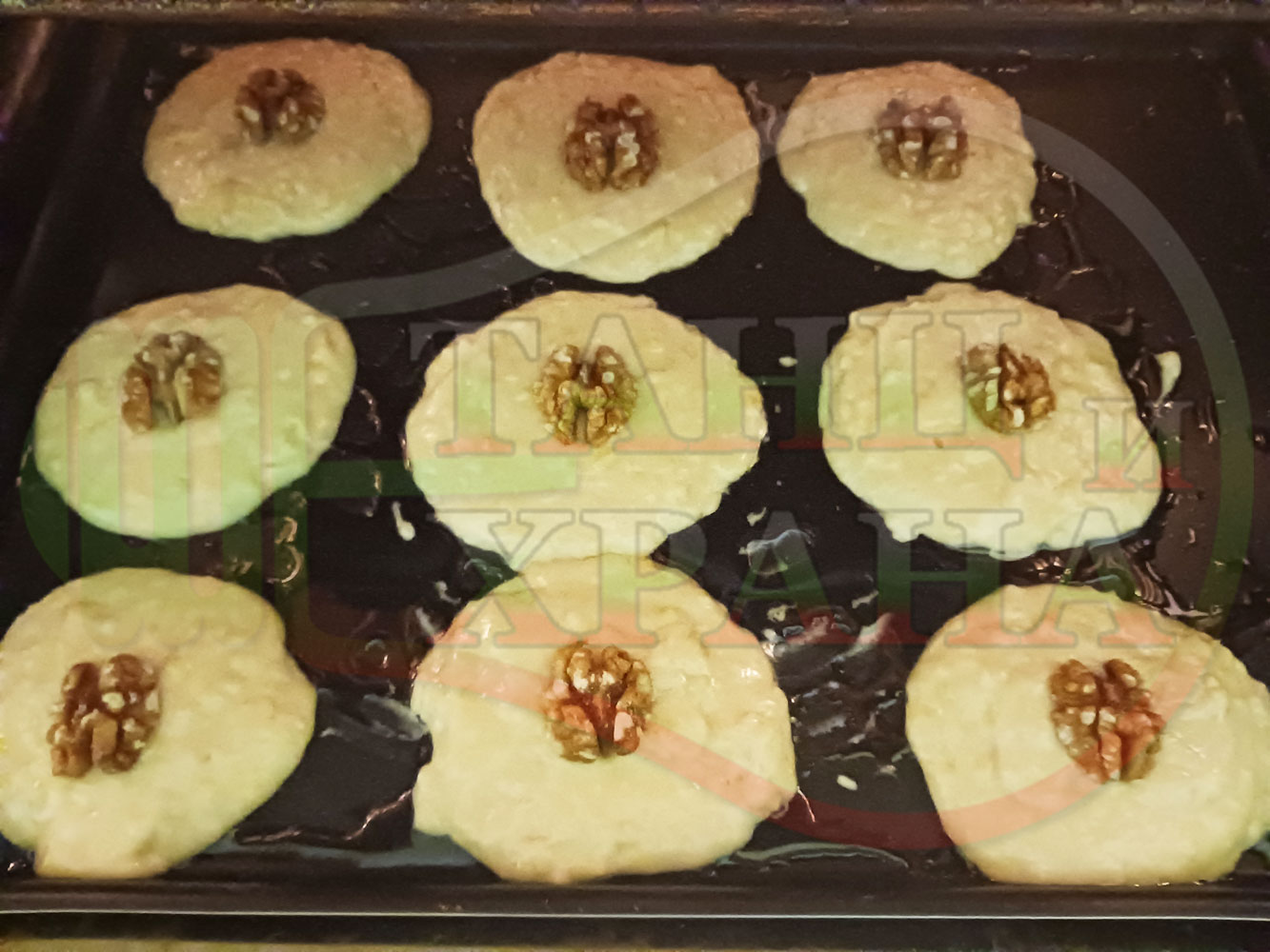 Български курабийки "Крушови прясномлечни" приготвени с пресни круши и прясно мляко омесени с брашно, яйца, царевично нишесте и кристална захар запечени на фурна със сурови орехи - производни