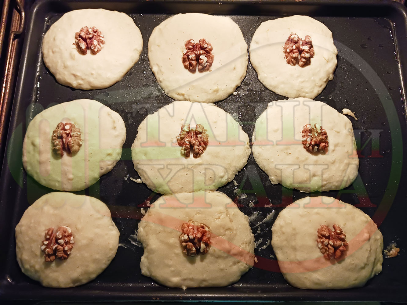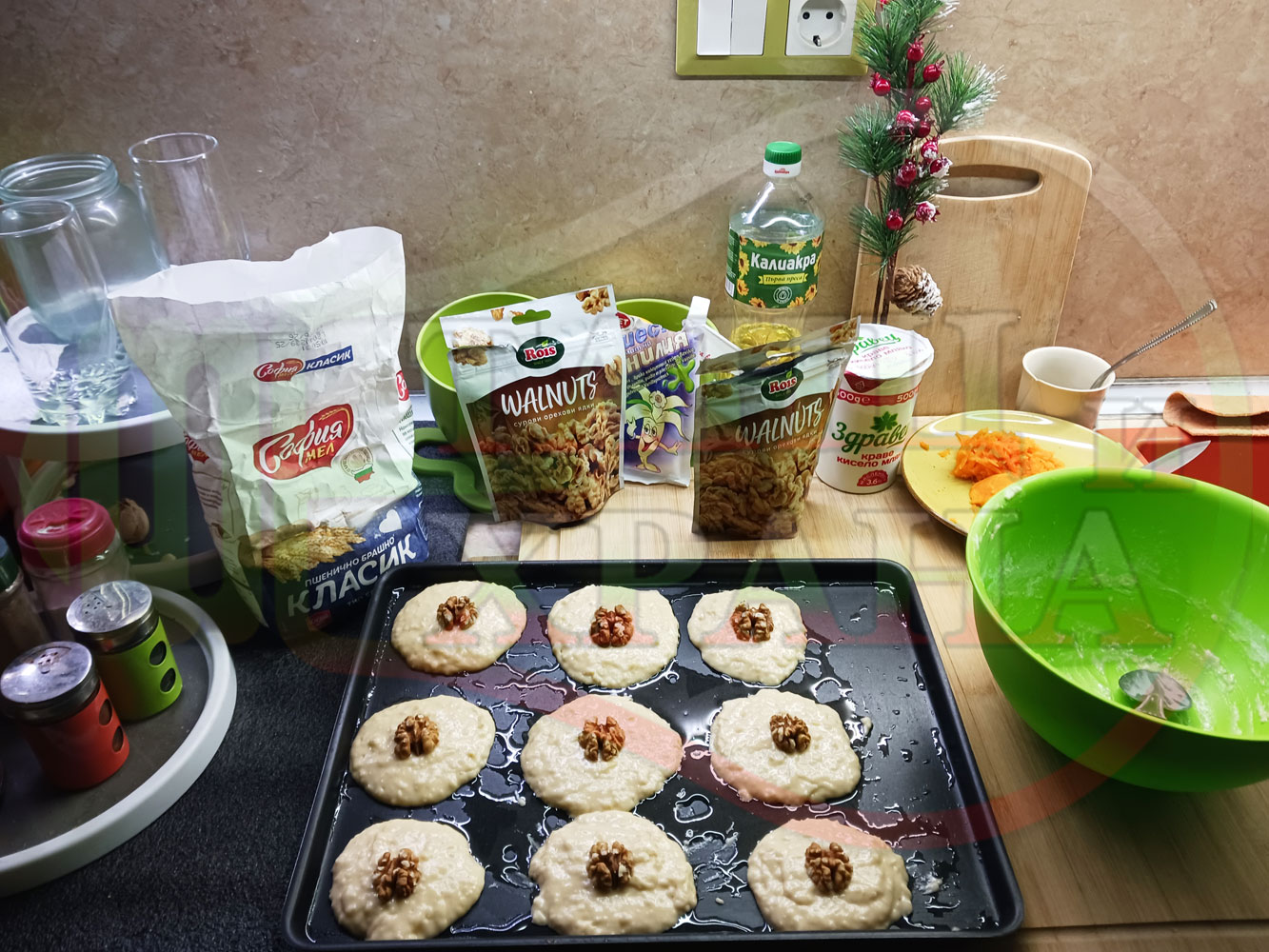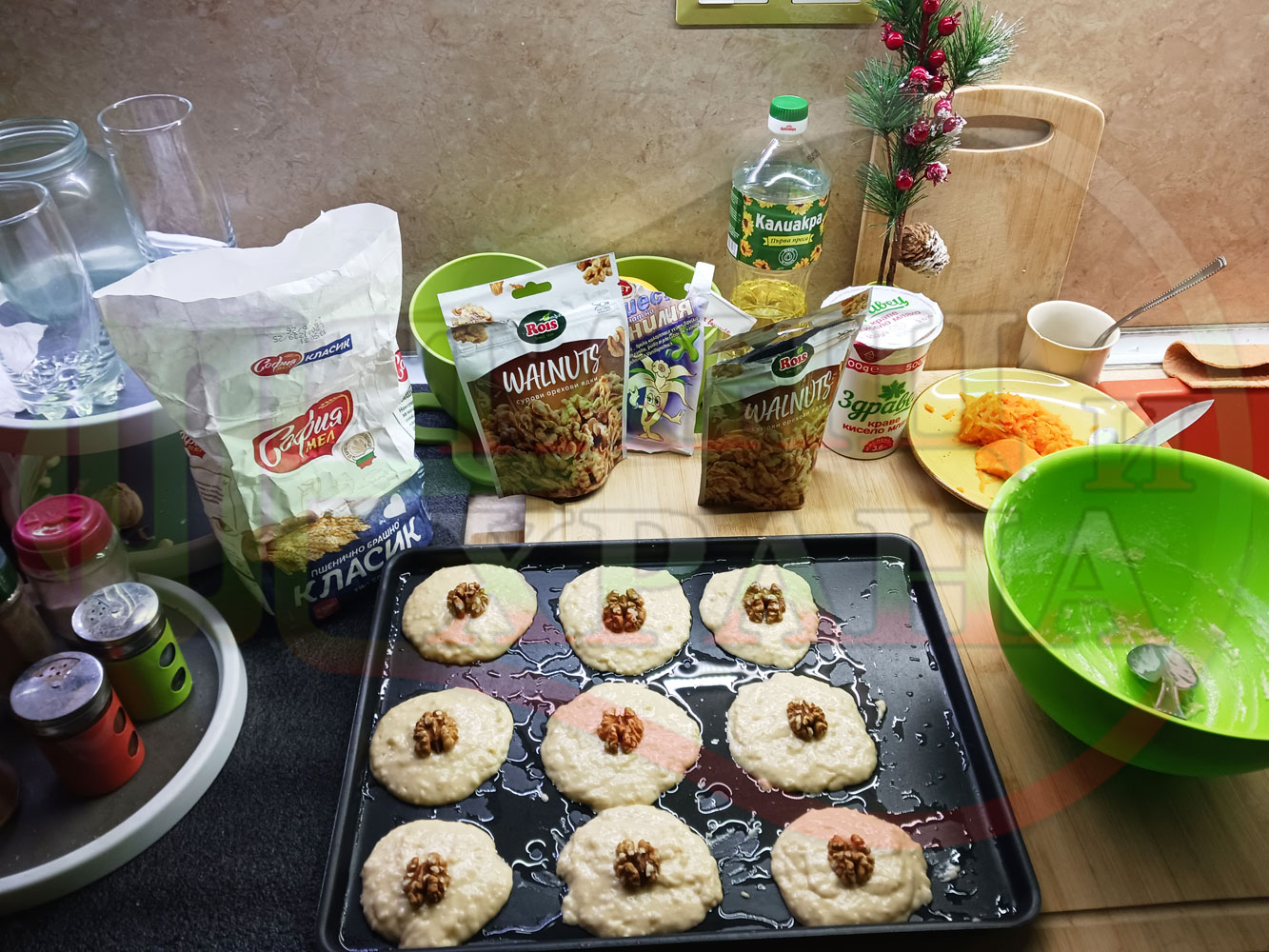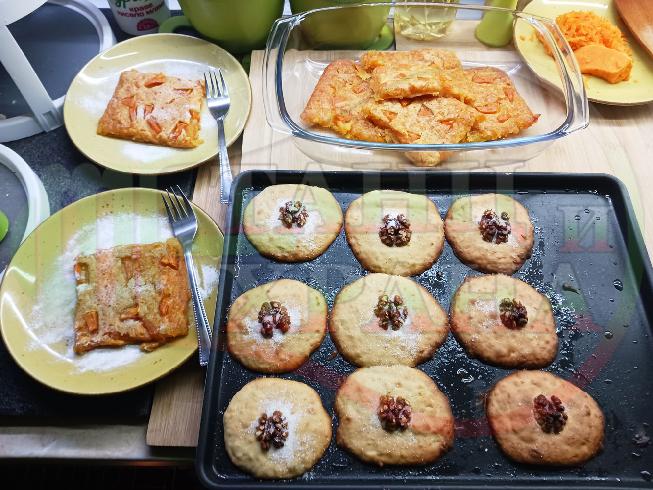 Спретнах производни български крушови курабийки от заделената сурова супа с круши и прясно мляко "Крушова прясномлечна кашкаваленомайонезена" (снимките от приготвянето на супата са към рецептата за супата). Добавих яйце, брашно, царевично нишесте и захар към крушовата прясномлечна супа и замесих лепкаво тесто за курабийки. Гарнирах курабийките със сурови орехи и ги изпекох на фурна за около 20 минути заедно с тиквената постна пита. Поръсих курабийките с кристална захар, която се карамелизира леко в горещата фурна и отново се получи невероятна вкусно, вкусна, вкусотия (вкуснотия). laughing