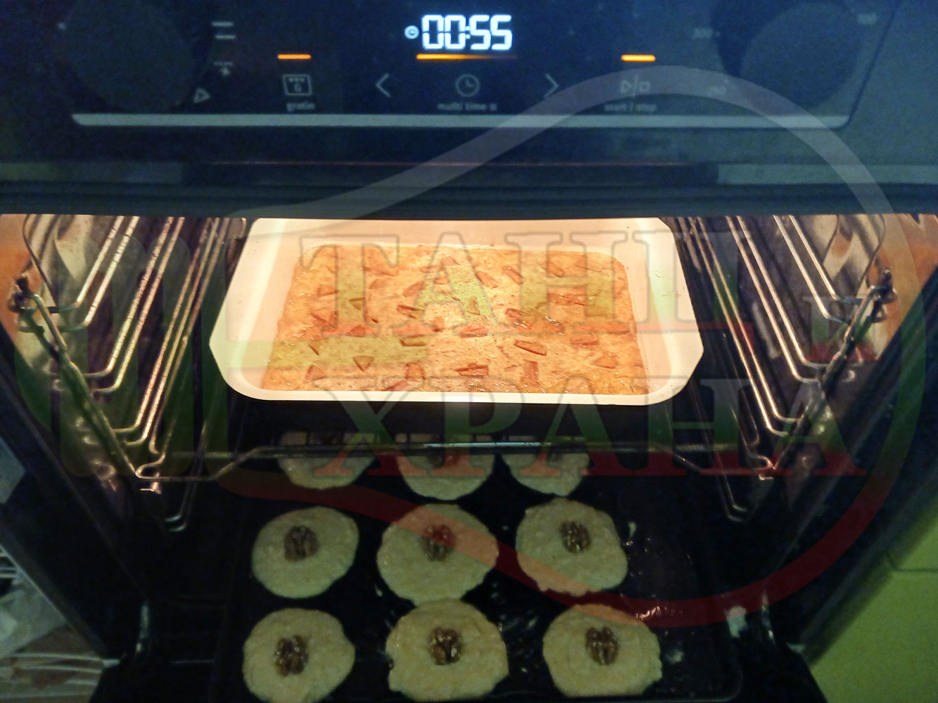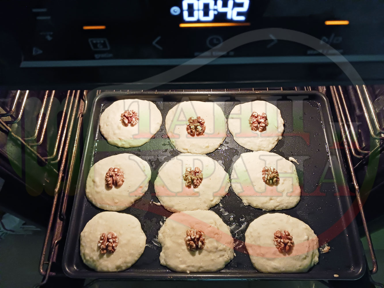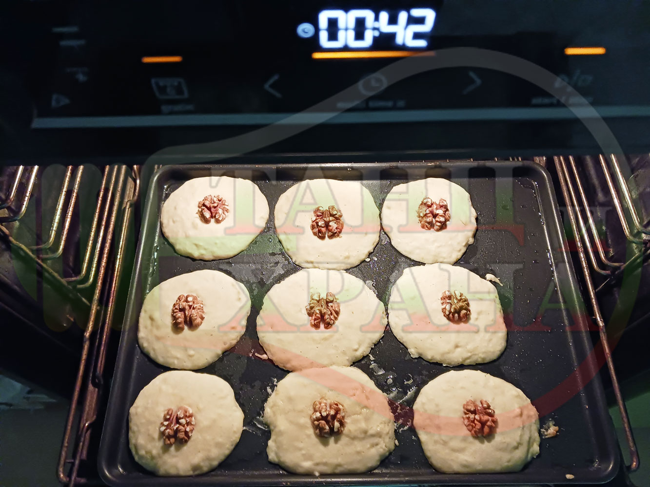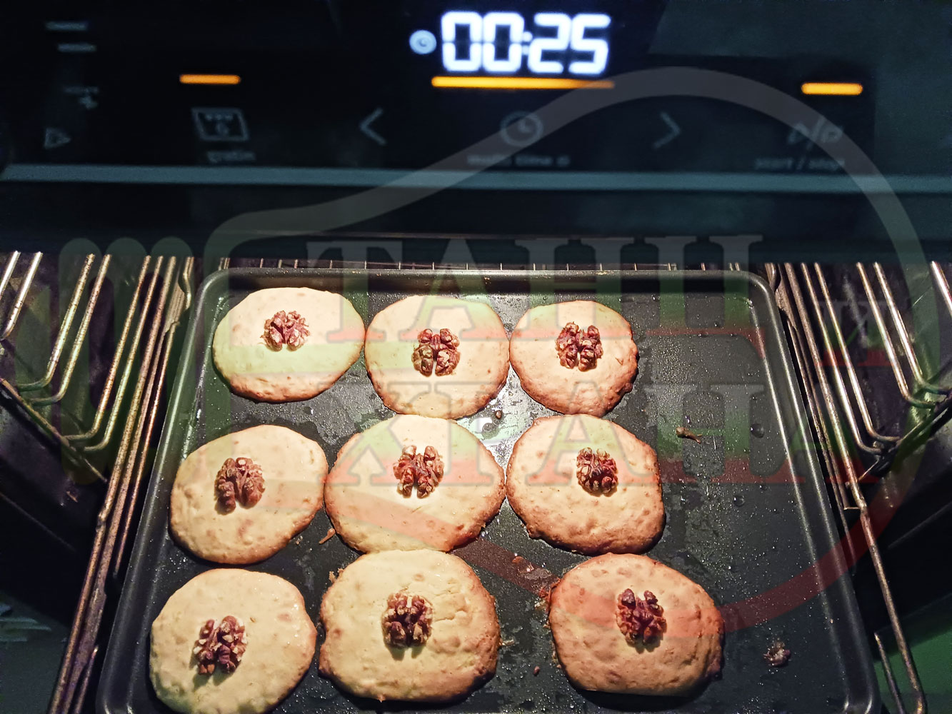 ВНИМАНИЕ: Фурните са различни и съответно времето за запичане е ориентировъчно. Наблюдавайте процеса на запичане и при необходимост, покрийте с хартия, фолио за печене или сменяйте позициите на тавите според нивата на фурната за да се запекат равномерно курабийките без да ги покривате. Имайте предвид, че по-малките курабийки се запичат по-бързо от по-големите и е необходимо да ги извадите от тавата веднага щом се запекат и дори да ги размествате в тавата според степента им на запичане.