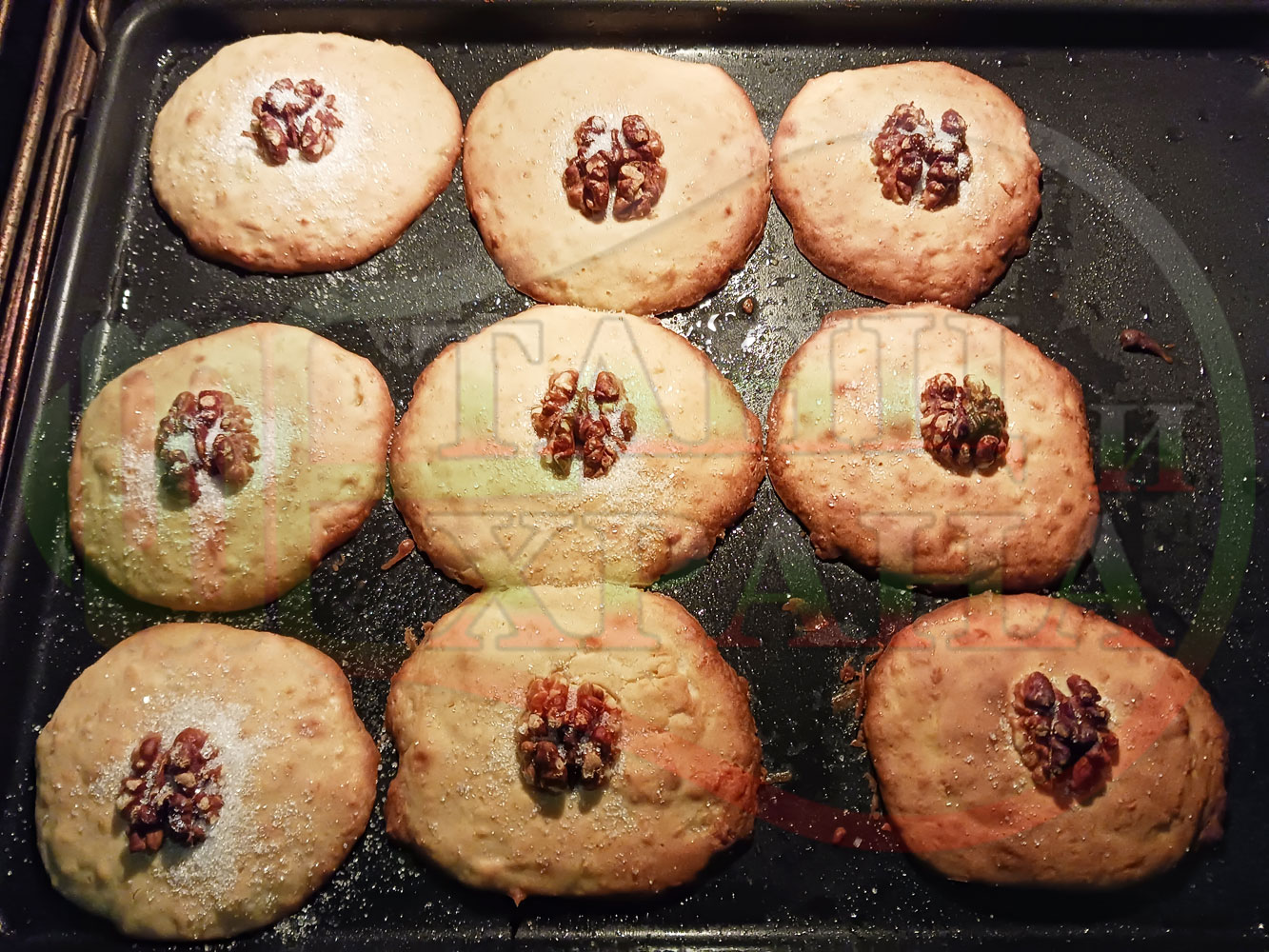 Поръсете изпечените курабийки с кристална захар и ги оставете в горещата фурна до леко разтопяване и залепване на захарта по тях (наблюдавайте курабийките докато са в горещата фурна за да не прегорят (или поръсете захарта около 2 минути преди края на зададеното време и запечете курабийките със захарта до желаната от вас степен)).