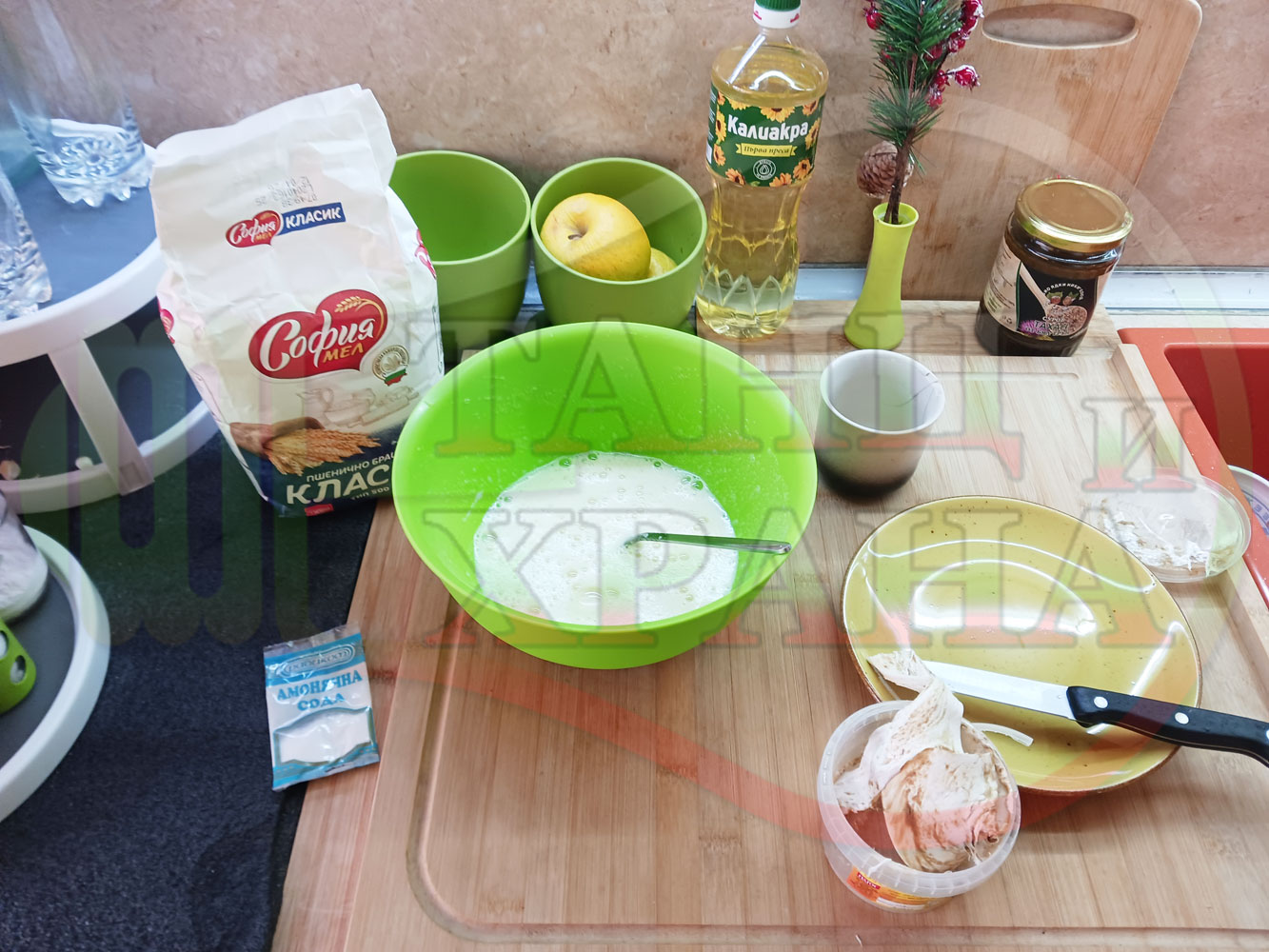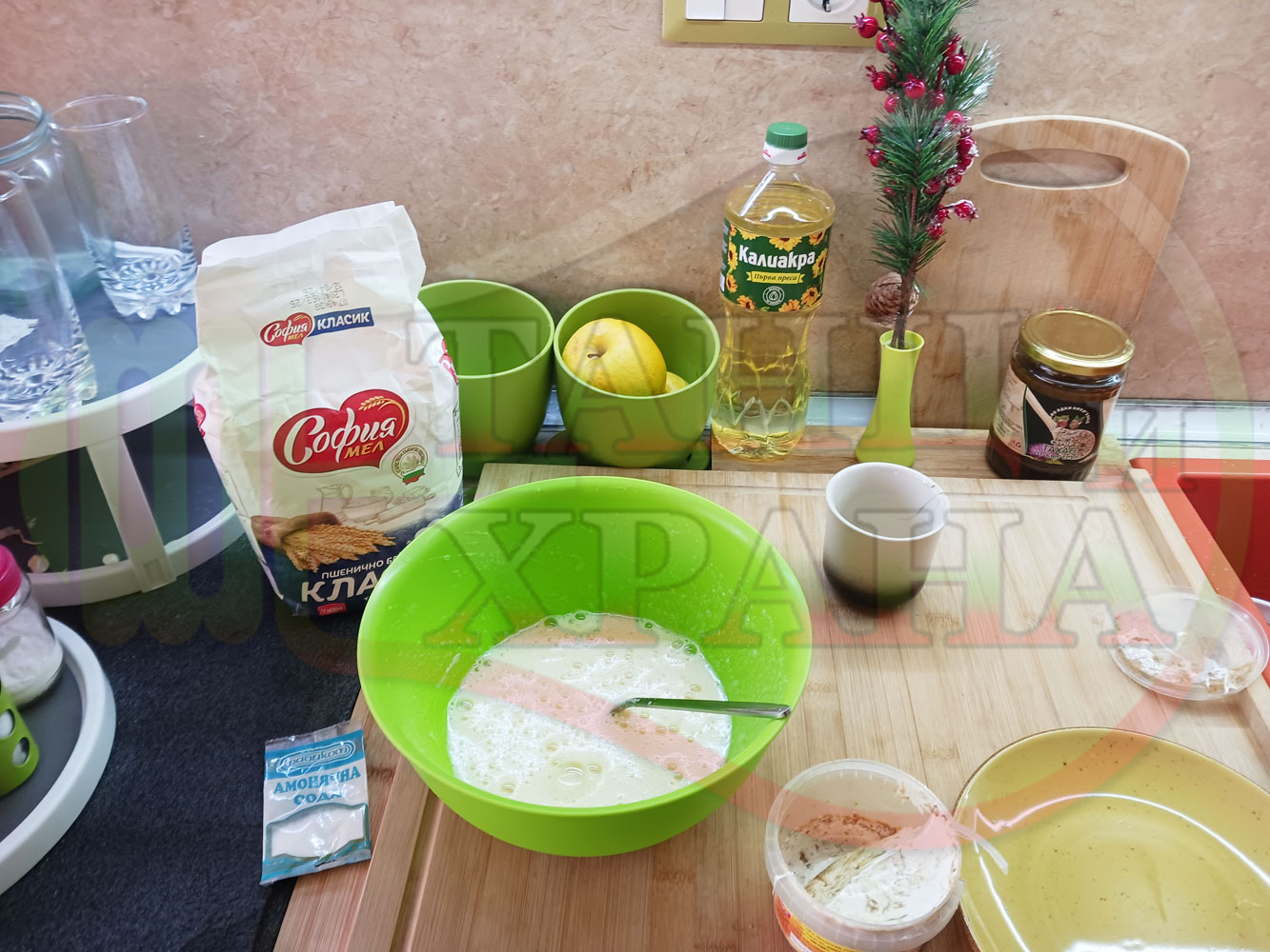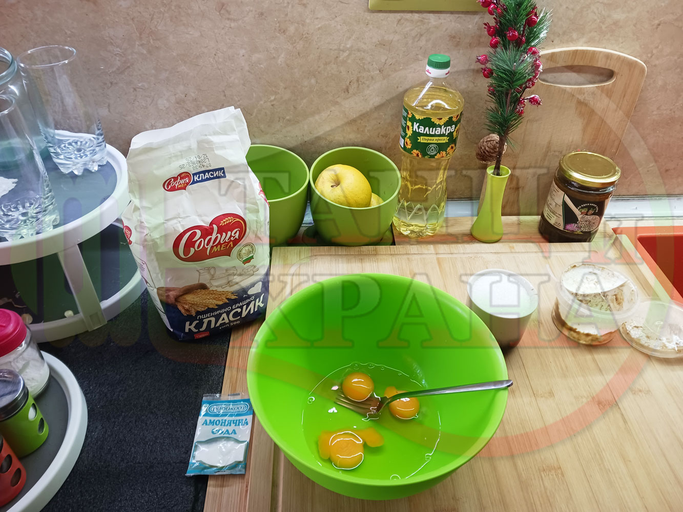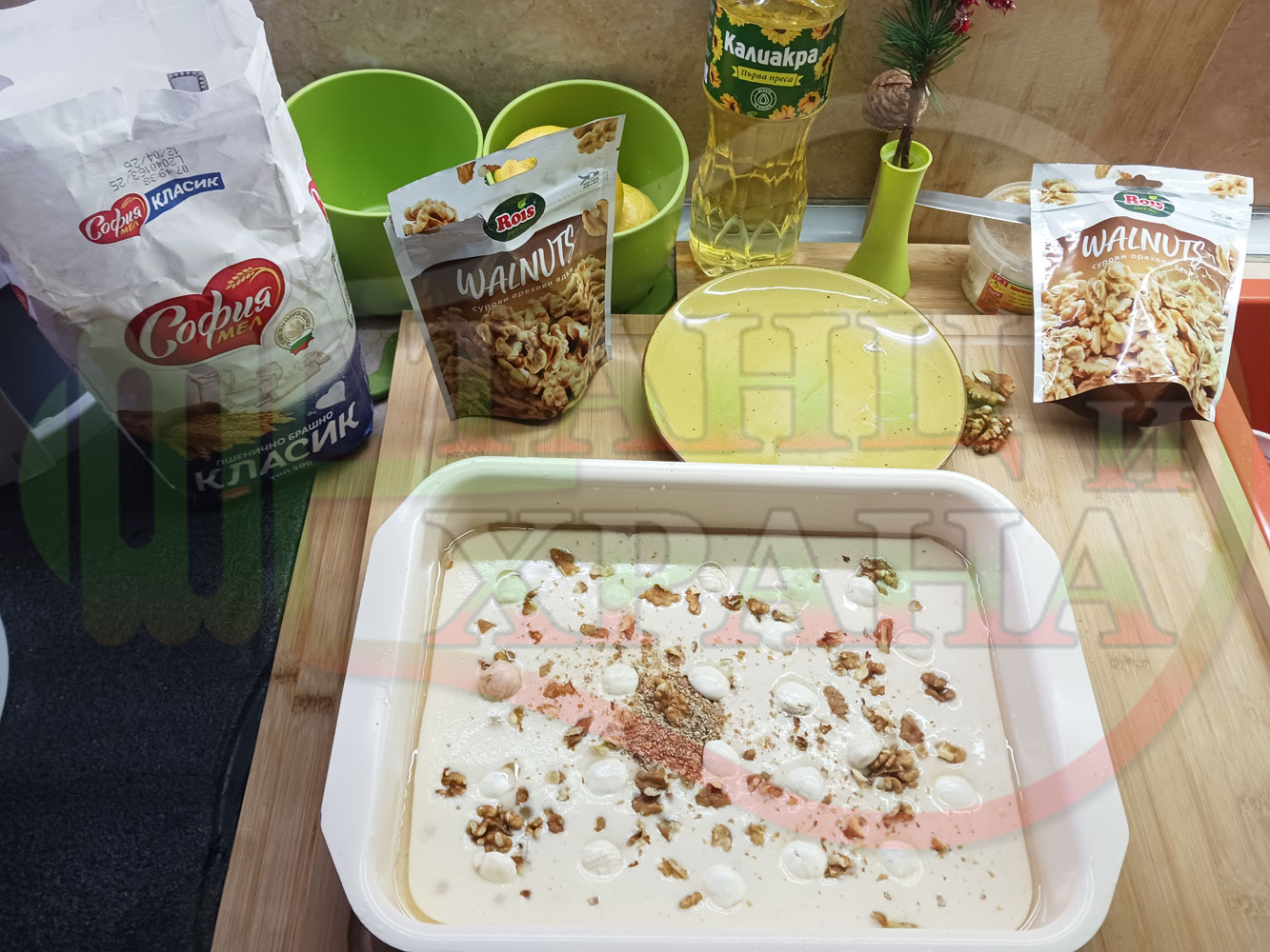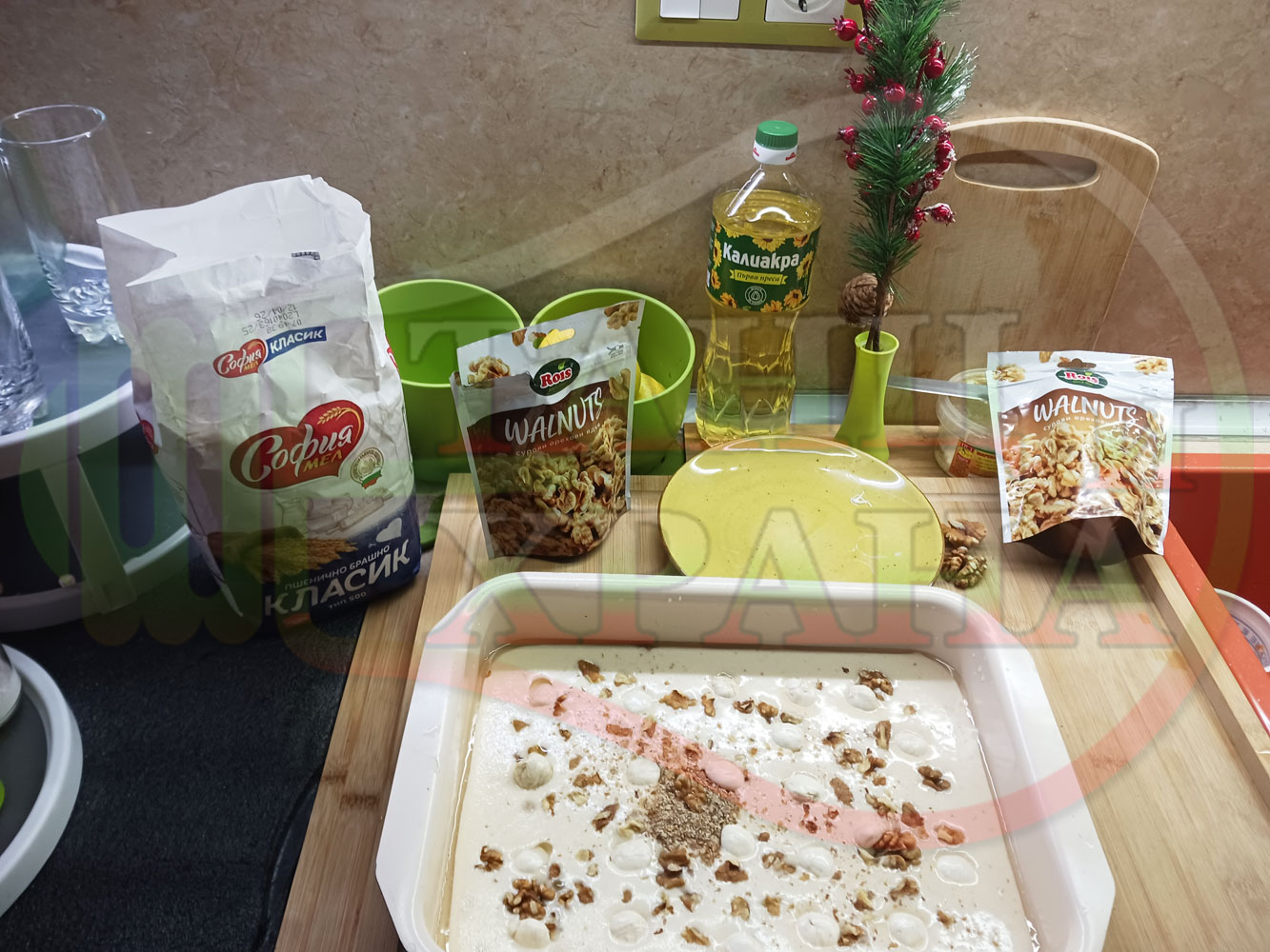 ПРОДУКТИ: Приблизителни количества за български сладък кекс "Халвян орехов" приготвен с яйца, брашно, прясно мляко и кристална захар с плънка от топчета оформени от тахан халва от Ябланица и сурови орехи