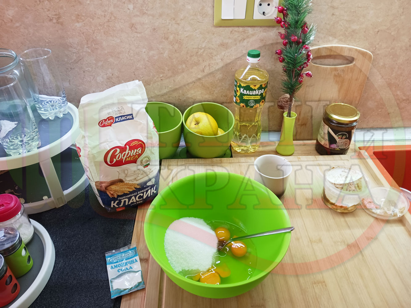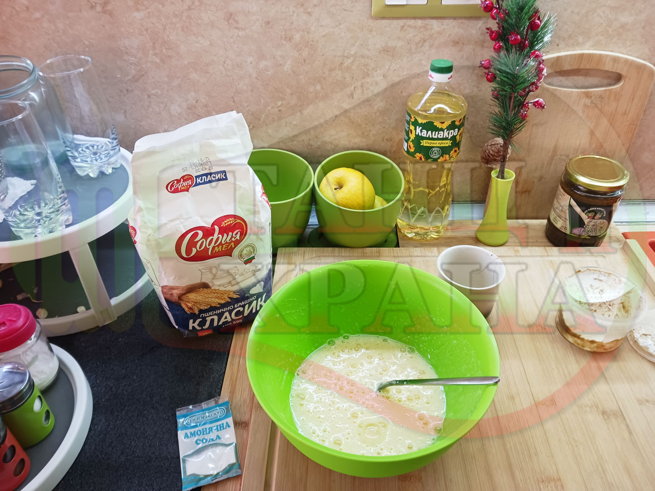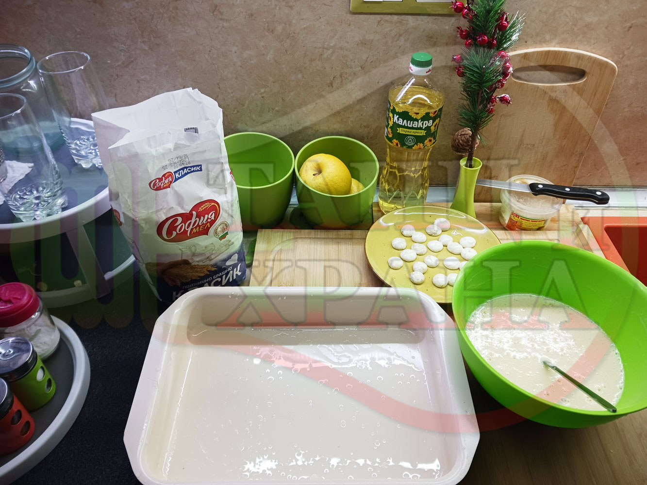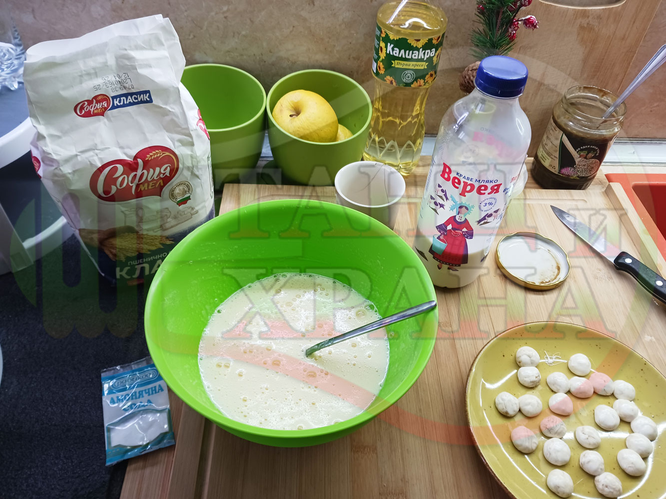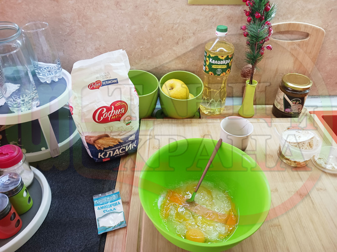ПРОДУКТИ: Приблизителни количества за български сладък кекс "Халвян орехов" приготвен с яйца, брашно, прясно мляко и кристална захар с плънка от топчета оформени от тахан халва от Ябланица и сурови орехи