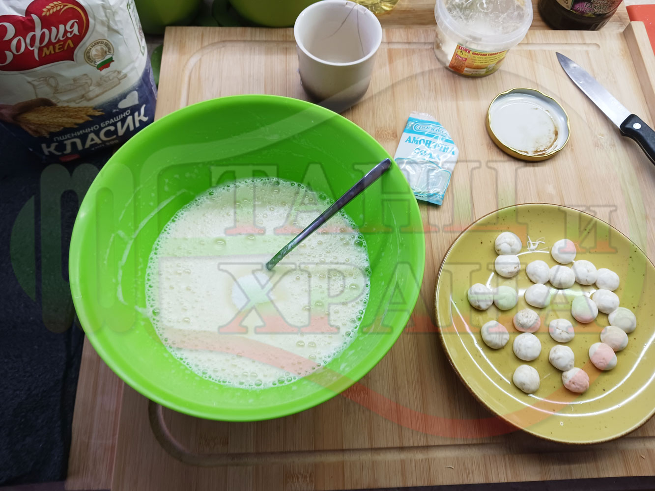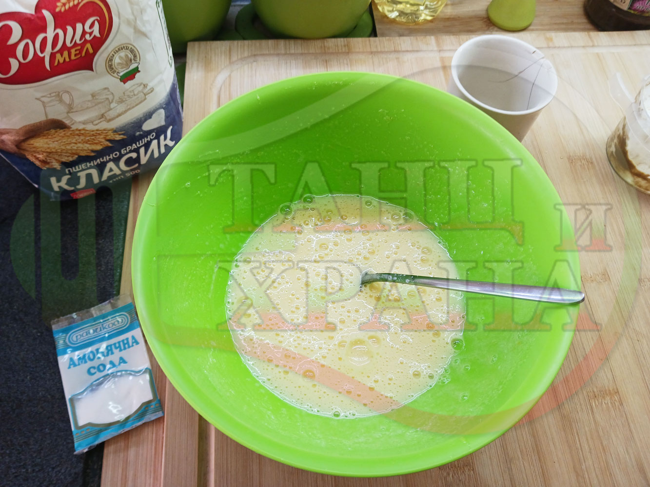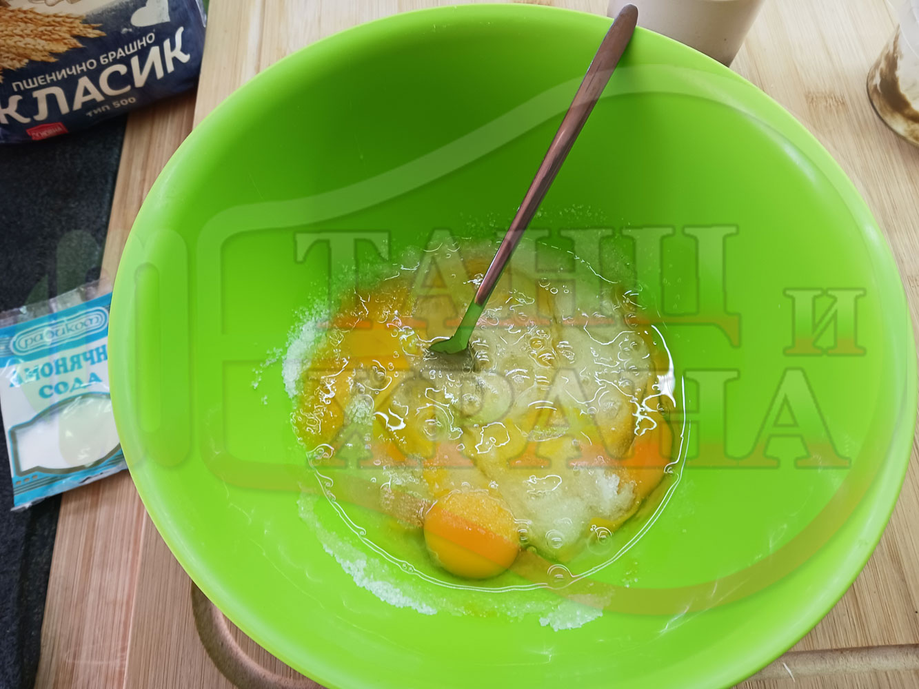 Разбийте яйцата със захарта в дълбока купа с вилица или миксер, до получаване на кремообразна смес. Сипете прясното мляко и амонячната сода, разбъркайте ги с вилицата, добавете брашното и отново разбъркайте с вилица или миксер до получаване на средно гъсто кексово тесто (кексовото тесто е с една степен по-гъсто от палачинковото). Кексовото тесто не трябва да е много гъсто нито много рядко и при необходимост от сгъстяване добавете по 1 или повече супени лъжици брашно.