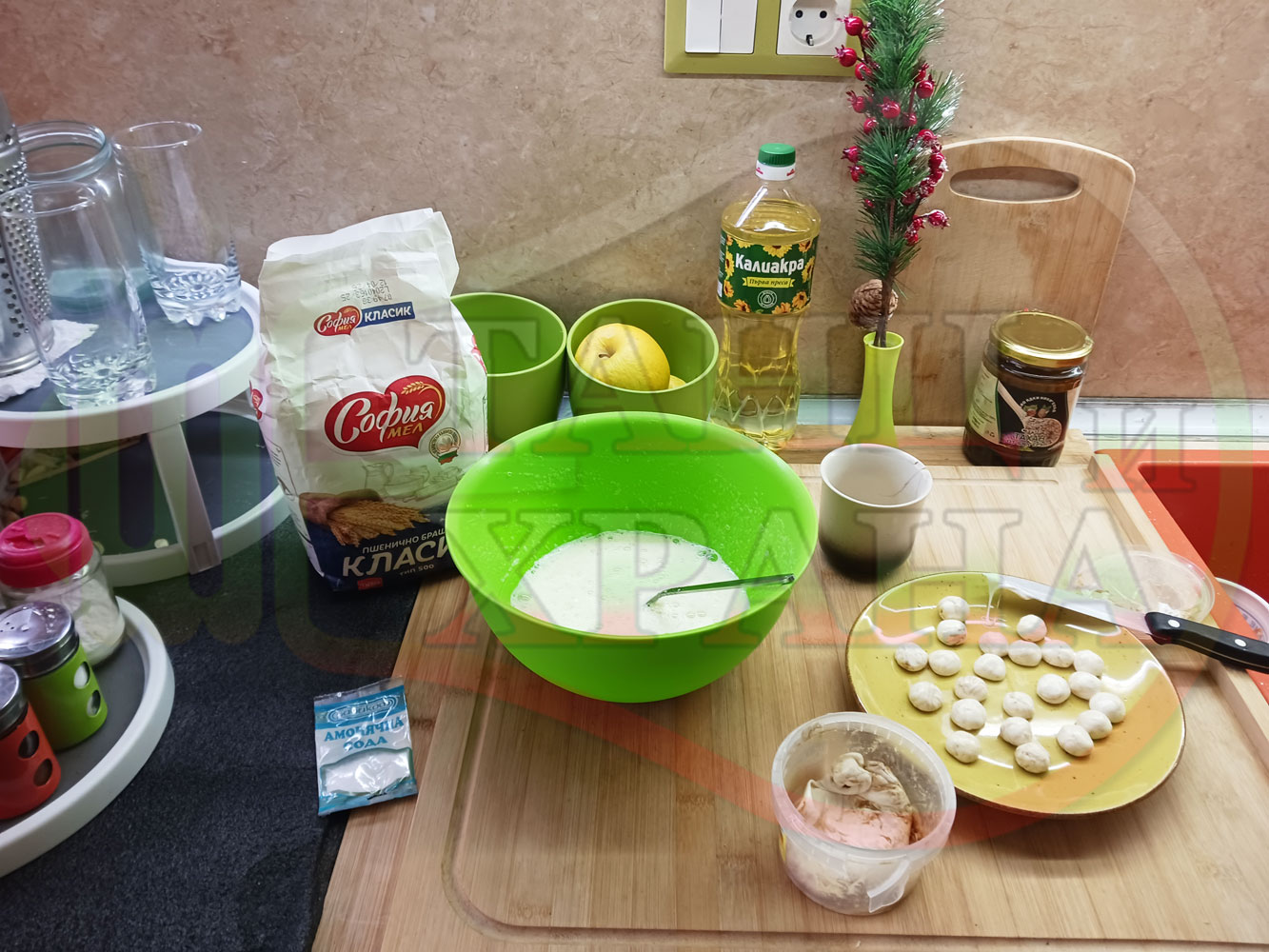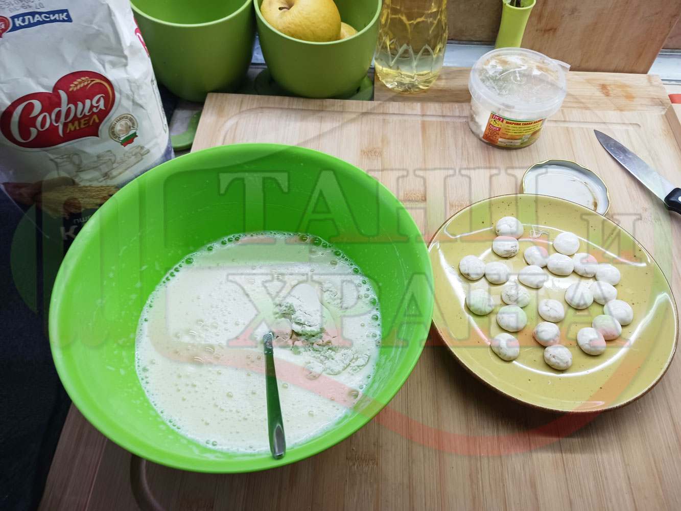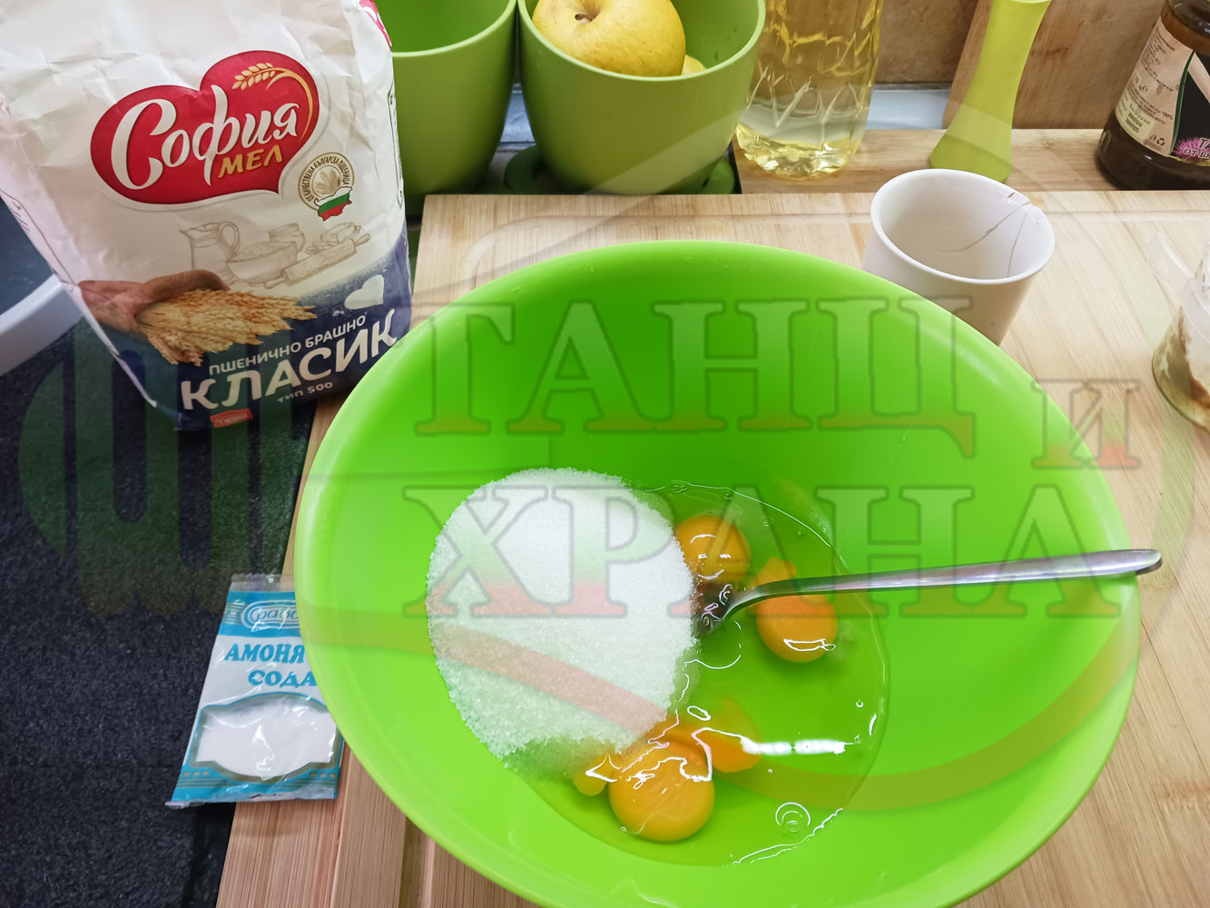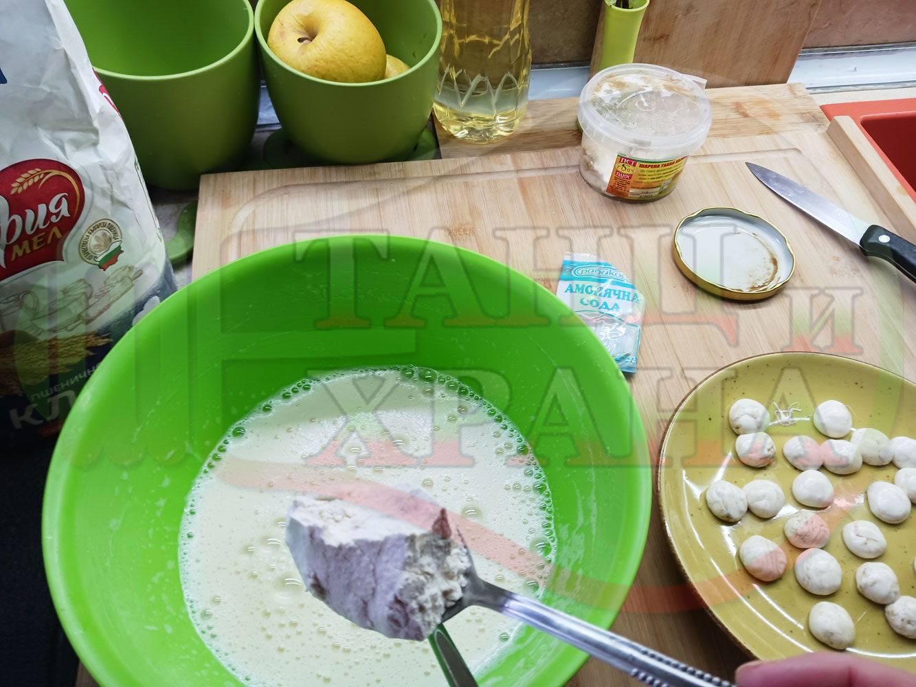 Разбийте яйцата със захарта в дълбока купа с вилица или миксер, до получаване на кремообразна смес. Сипете прясното мляко и амонячната сода, разбъркайте ги с вилицата, добавете брашното и отново разбъркайте с вилица или миксер до получаване на средно гъсто кексово тесто (кексовото тесто е с една степен по-гъсто от палачинковото). Кексовото тесто не трябва да е много гъсто нито много рядко и при необходимост от сгъстяване добавете по 1 или повече супени лъжици брашно.