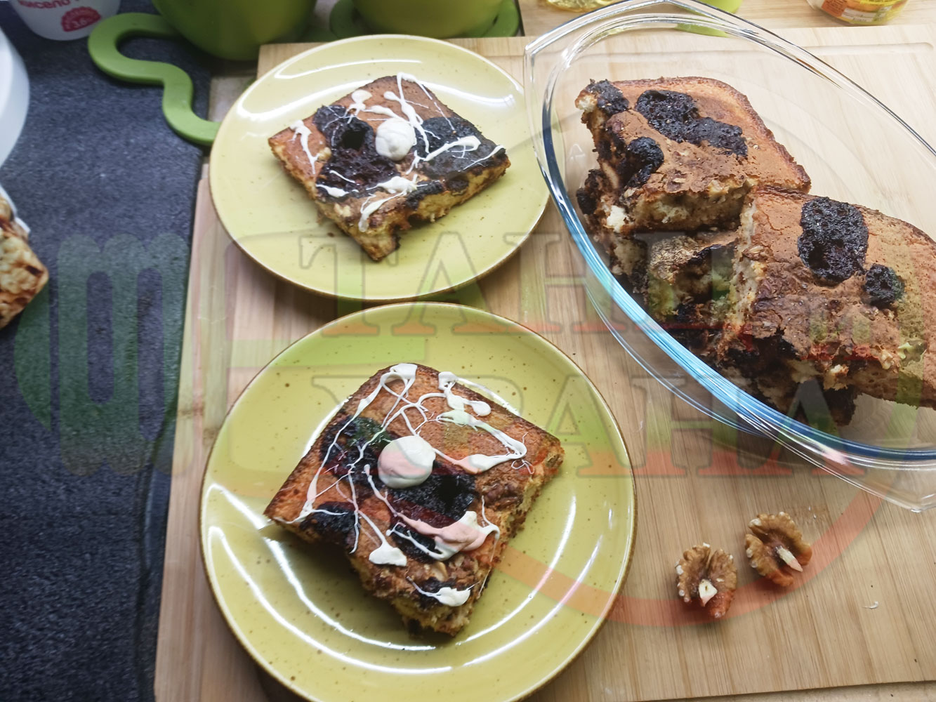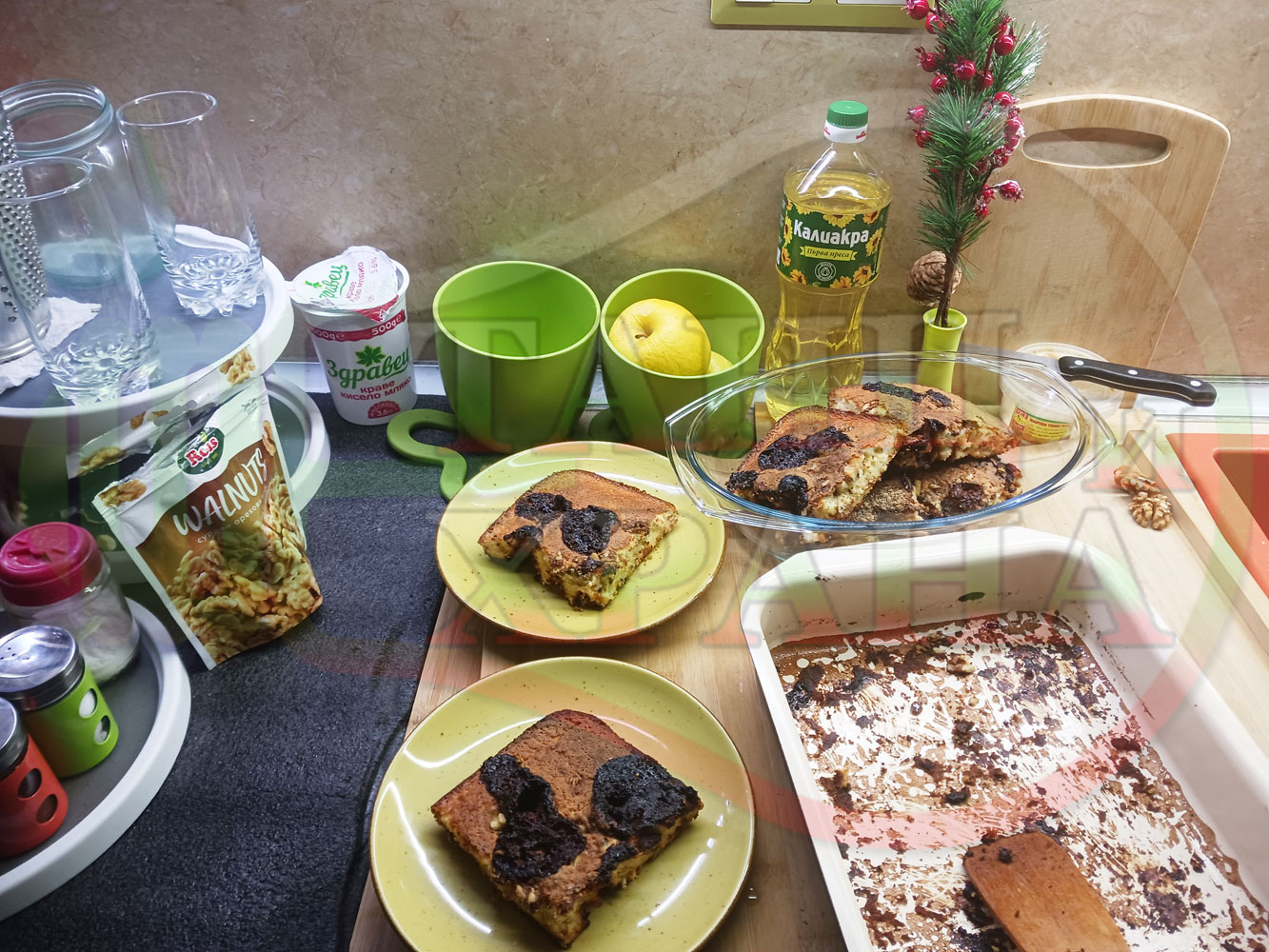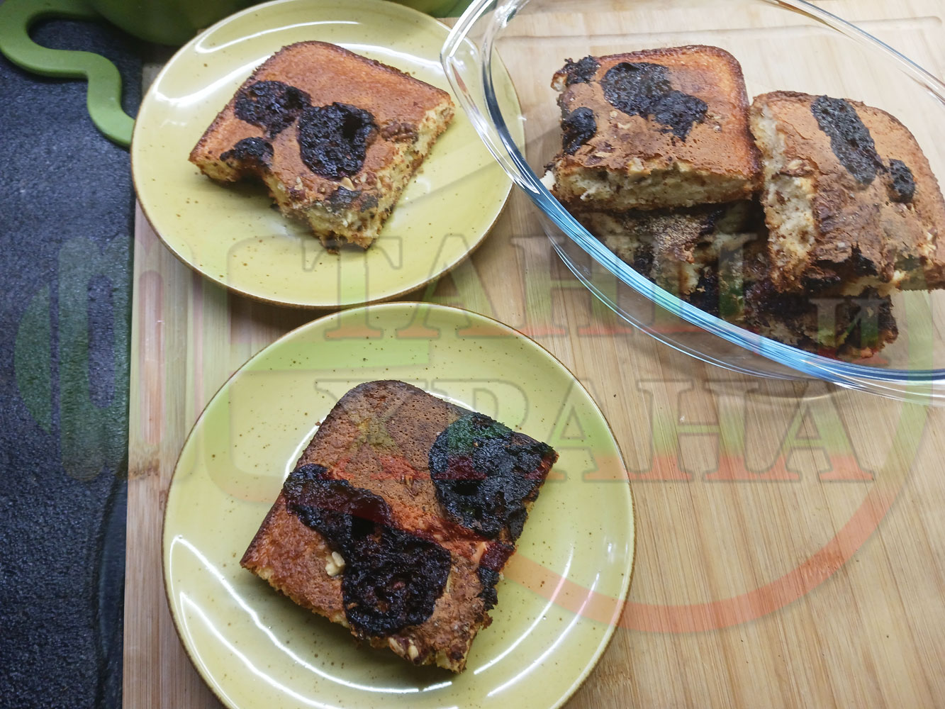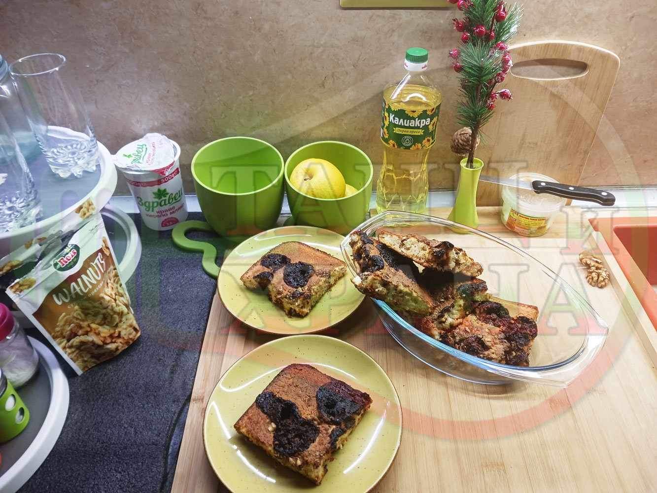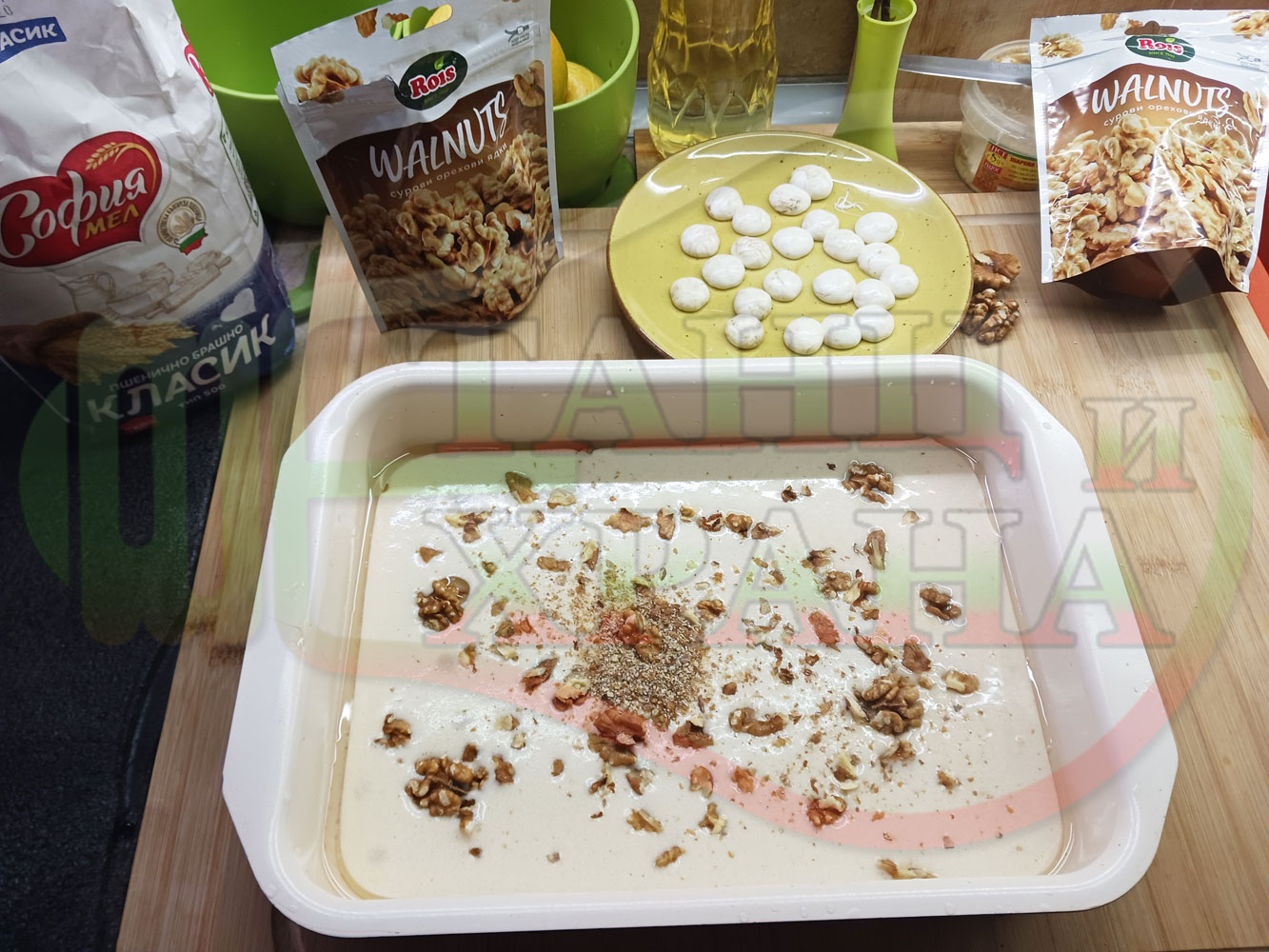 Български сладък кекс "Халвян орехов" приготвен с яйца, брашно, прясно мляко и кристална захар с плънка от топчета оформени от тахан халва от Ябланица и сурови орехи