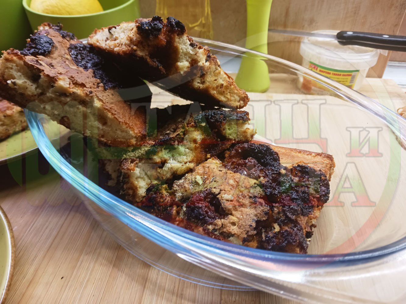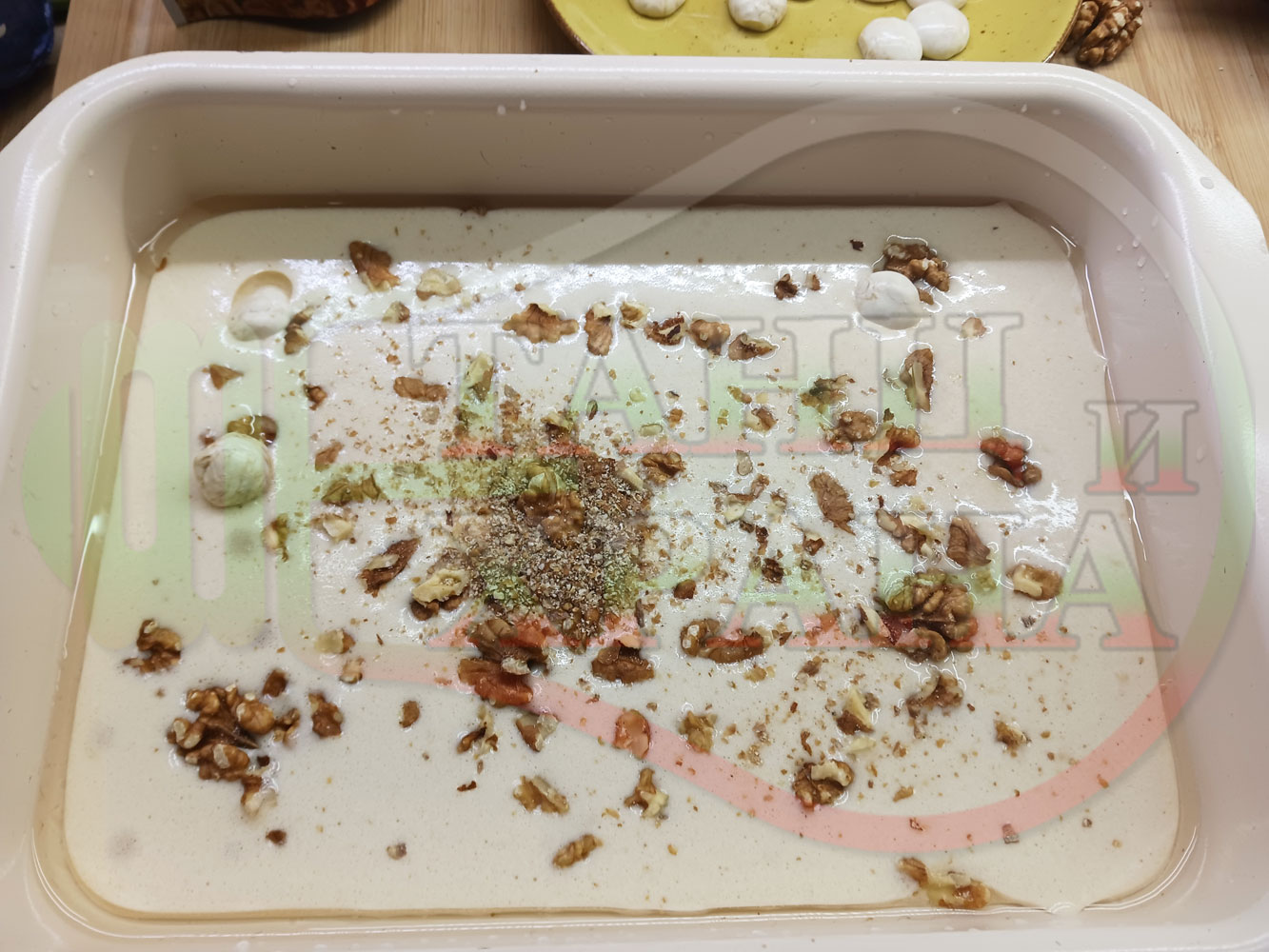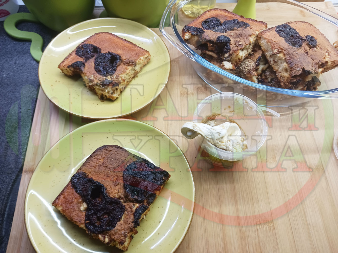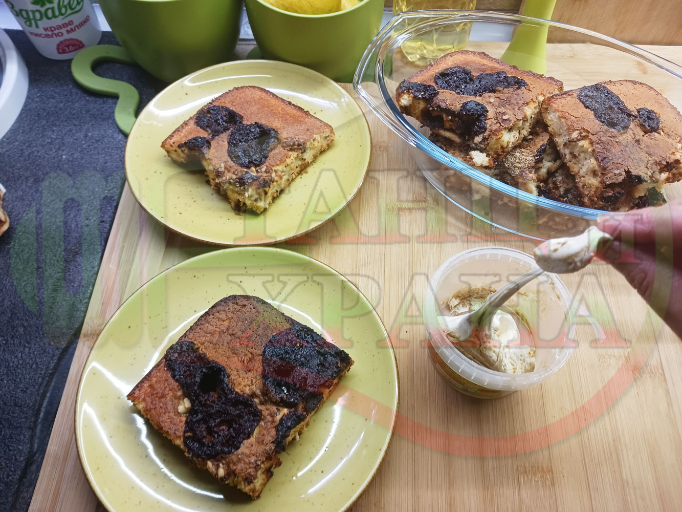 Български сладък кекс "Халвян орехов" приготвен с яйца, брашно, прясно мляко и кристална захар с плънка от топчета оформени от тахан халва от Ябланица и сурови орехи