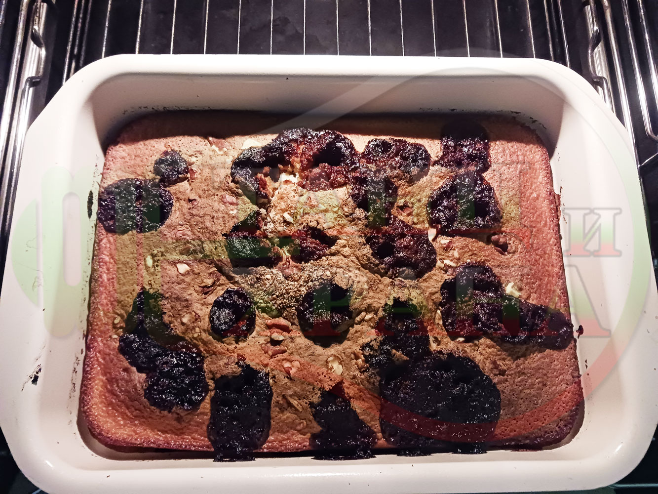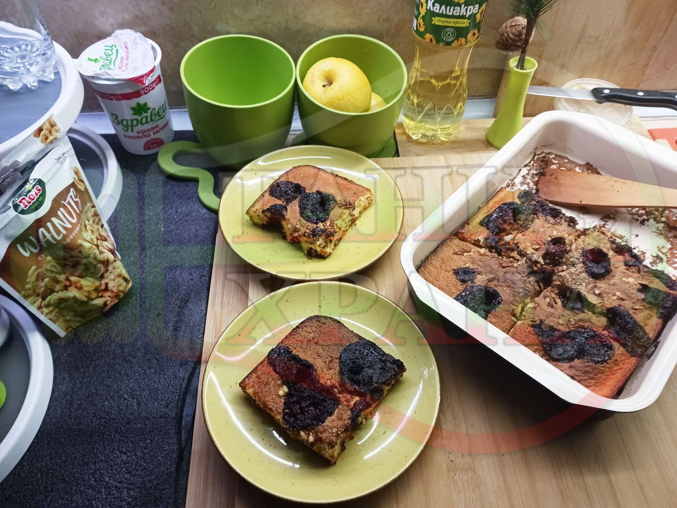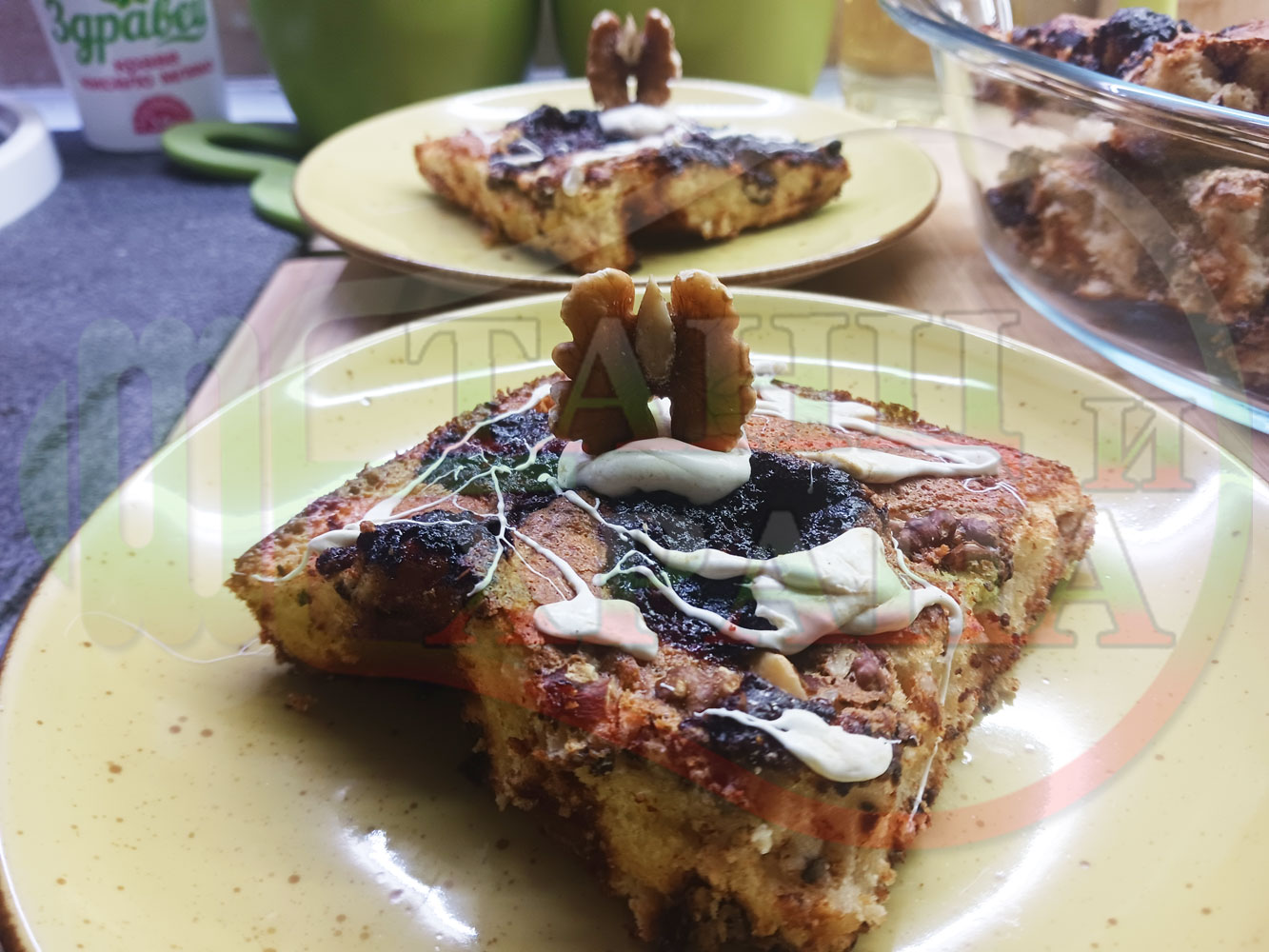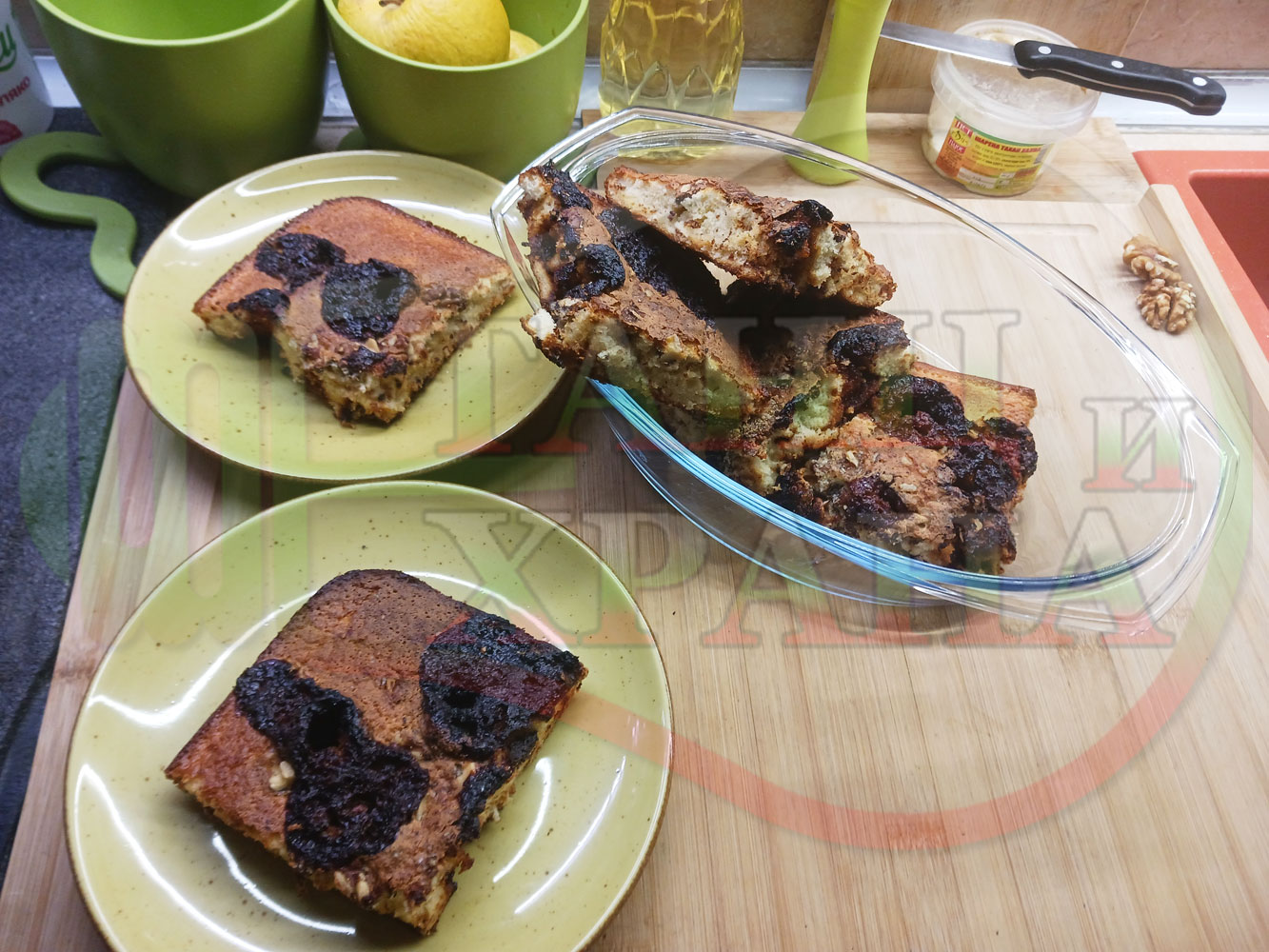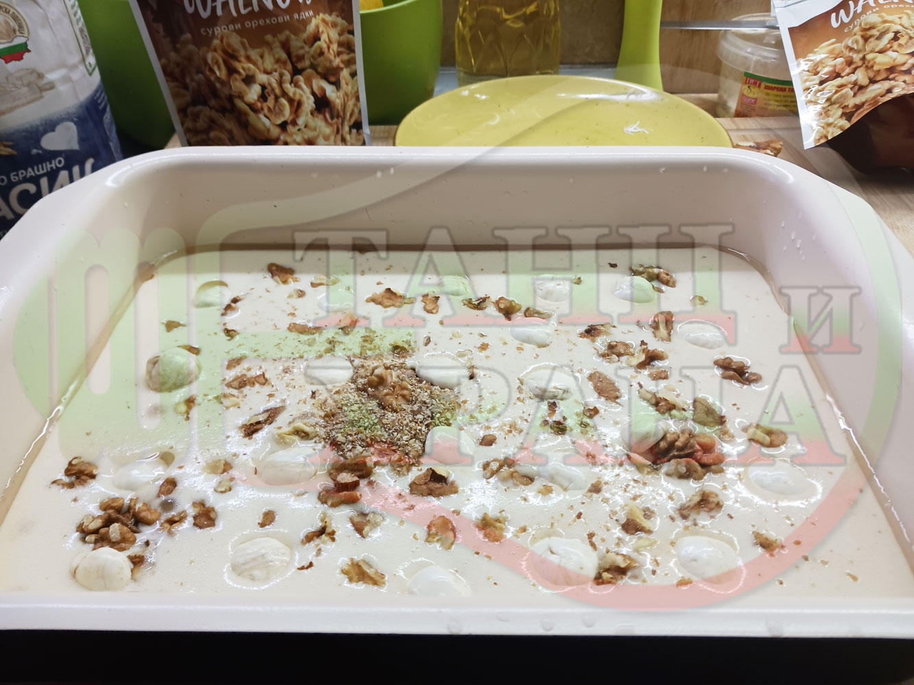 Български сладък кекс "Халвян орехов" приготвен с яйца, брашно, прясно мляко и кристална захар с плънка от топчета оформени от тахан халва от Ябланица и сурови орехи