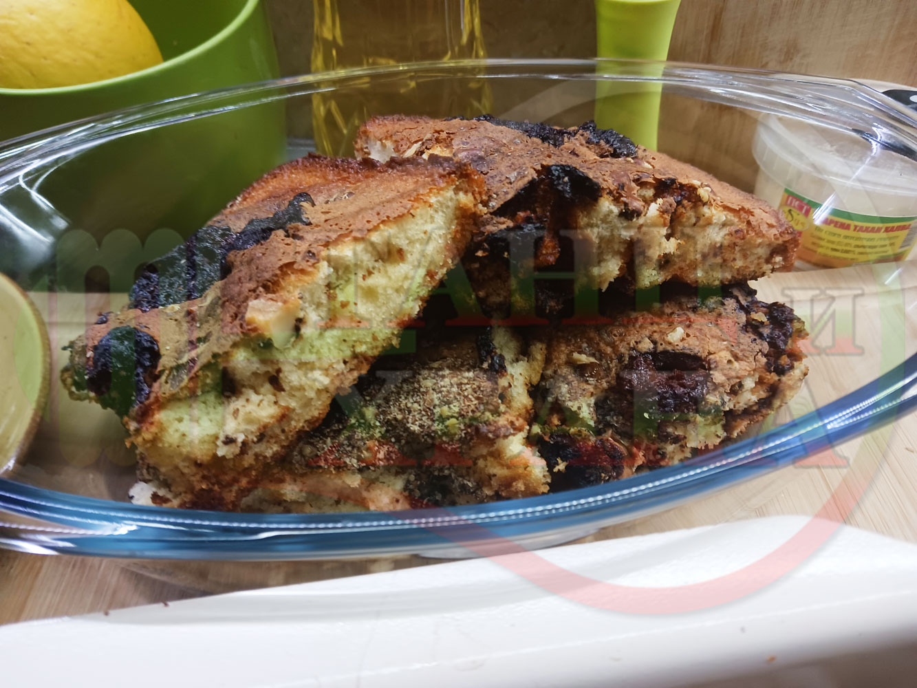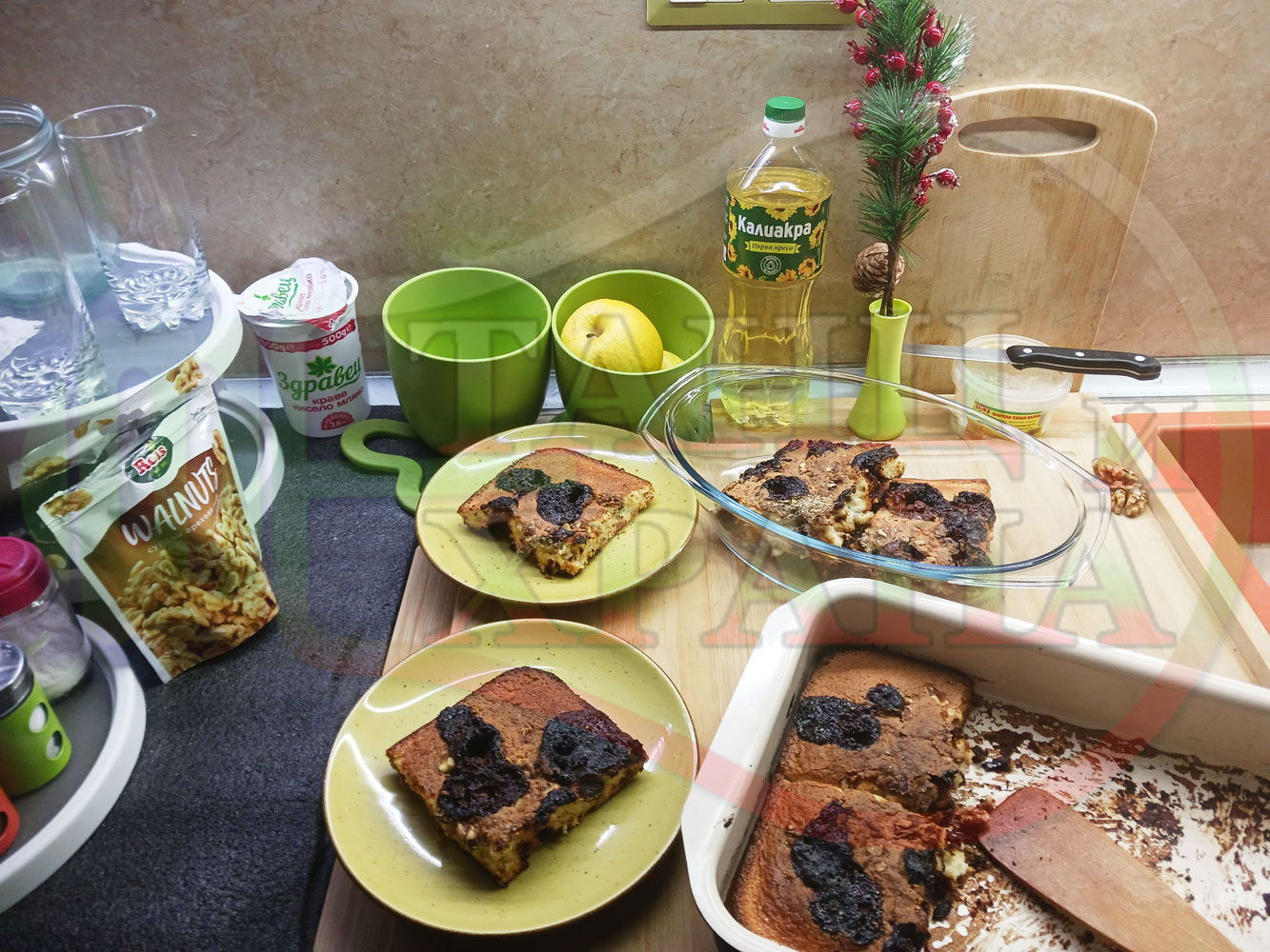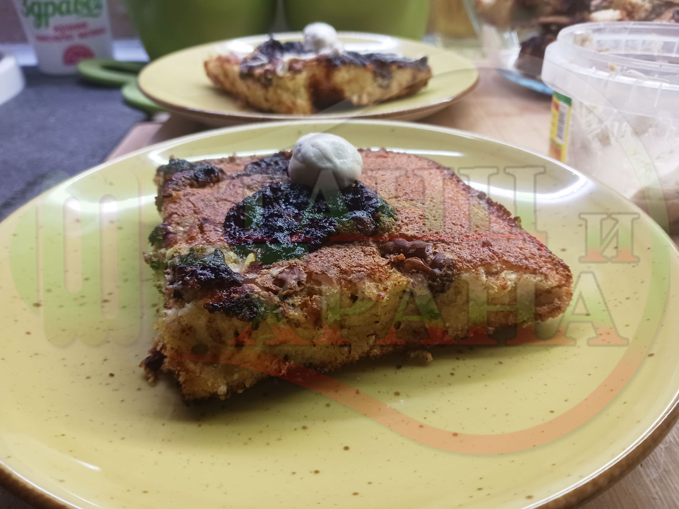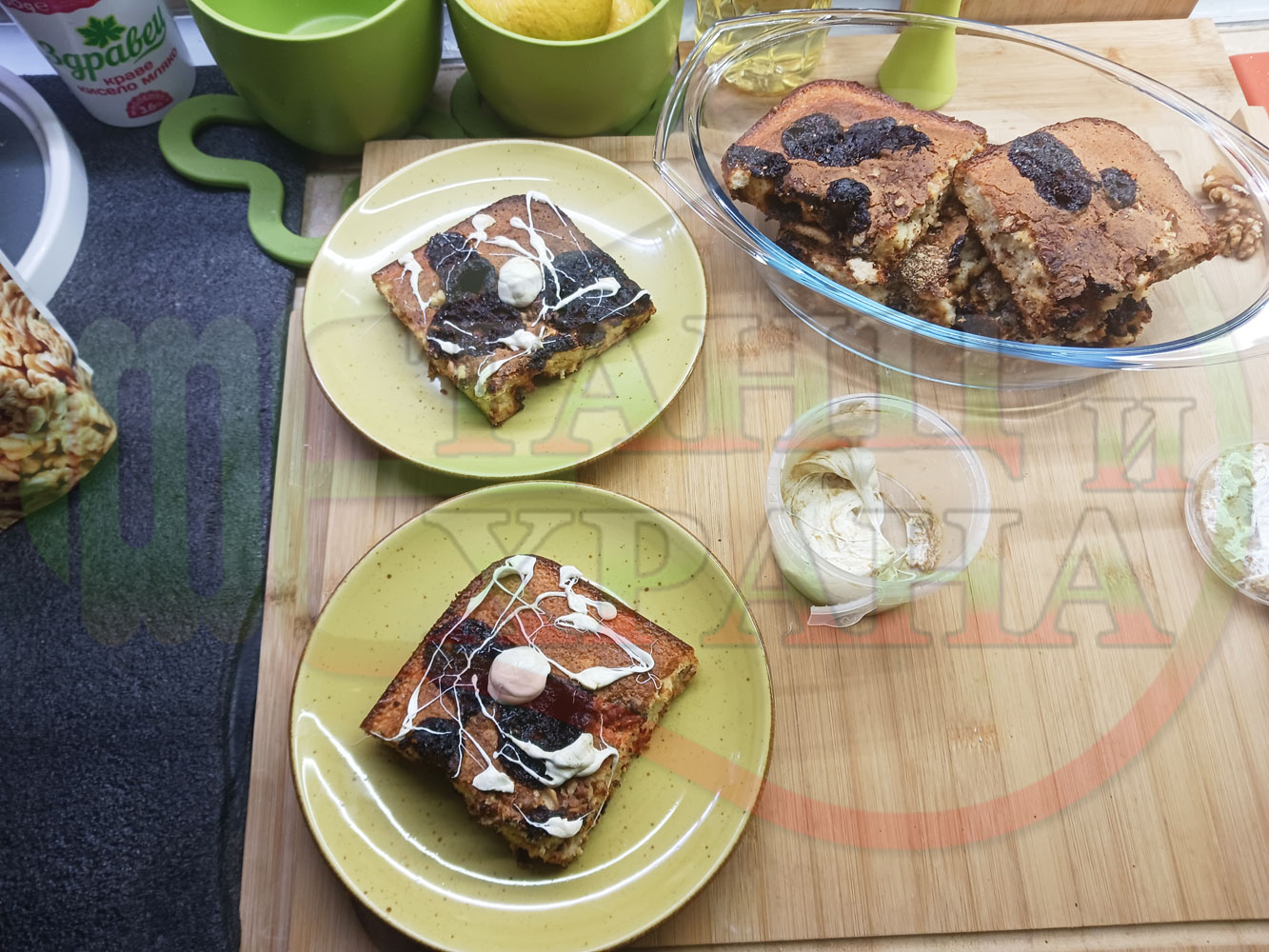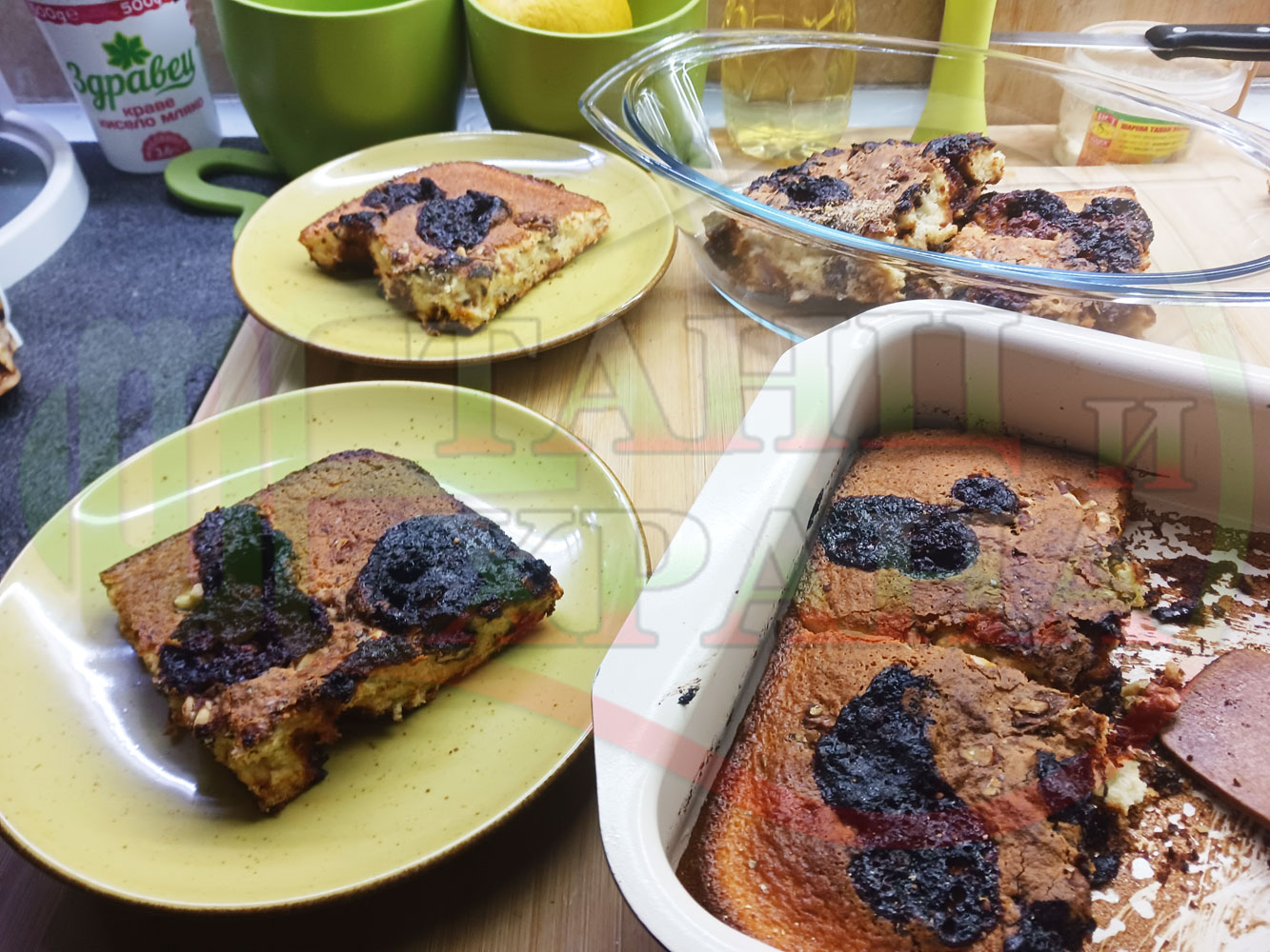 Български сладък кекс "Халвян орехов" приготвен с яйца, брашно, прясно мляко и кристална захар с плънка от топчета оформени от тахан халва от Ябланица и сурови орехи