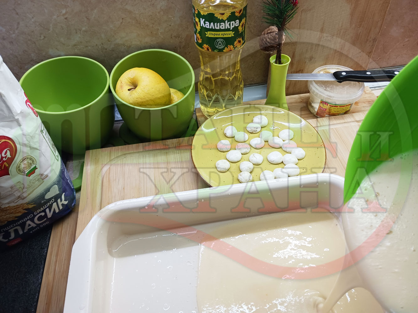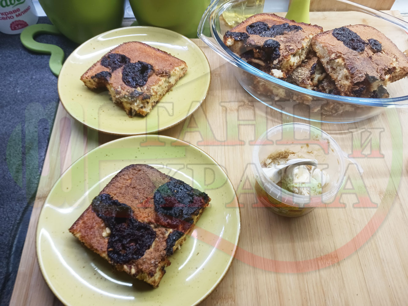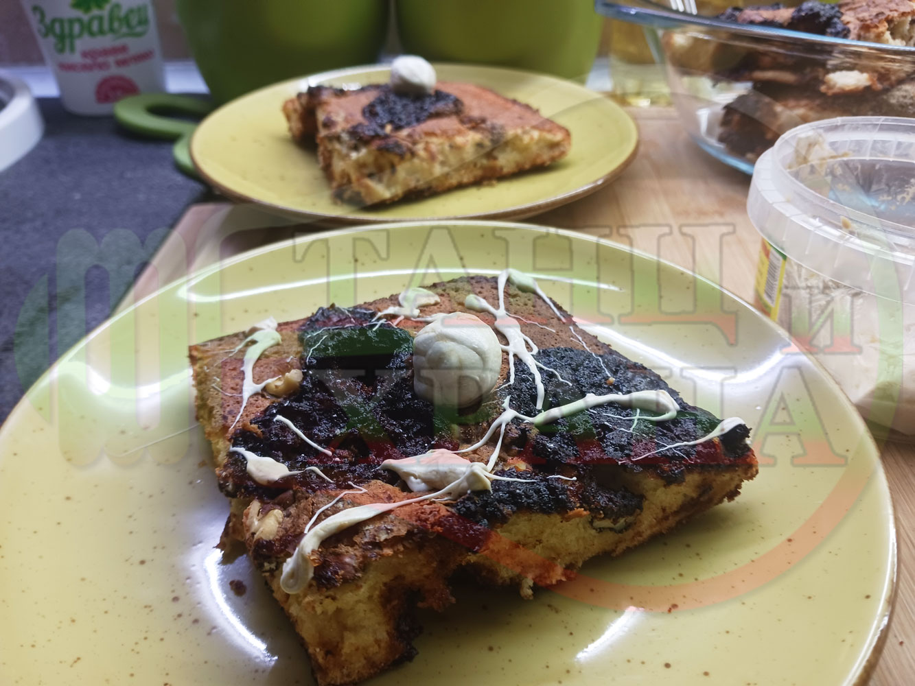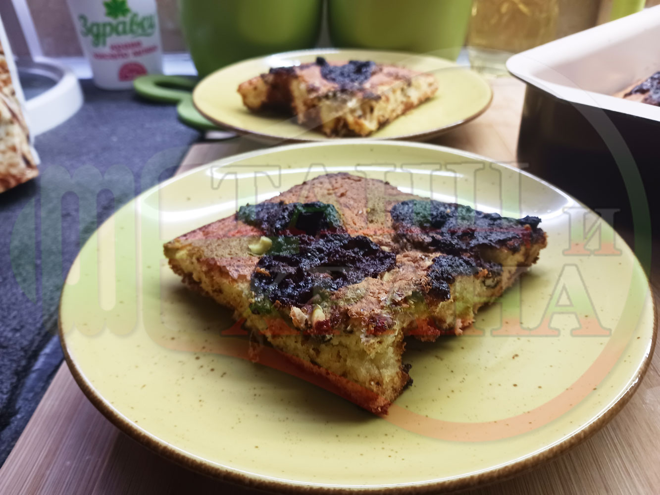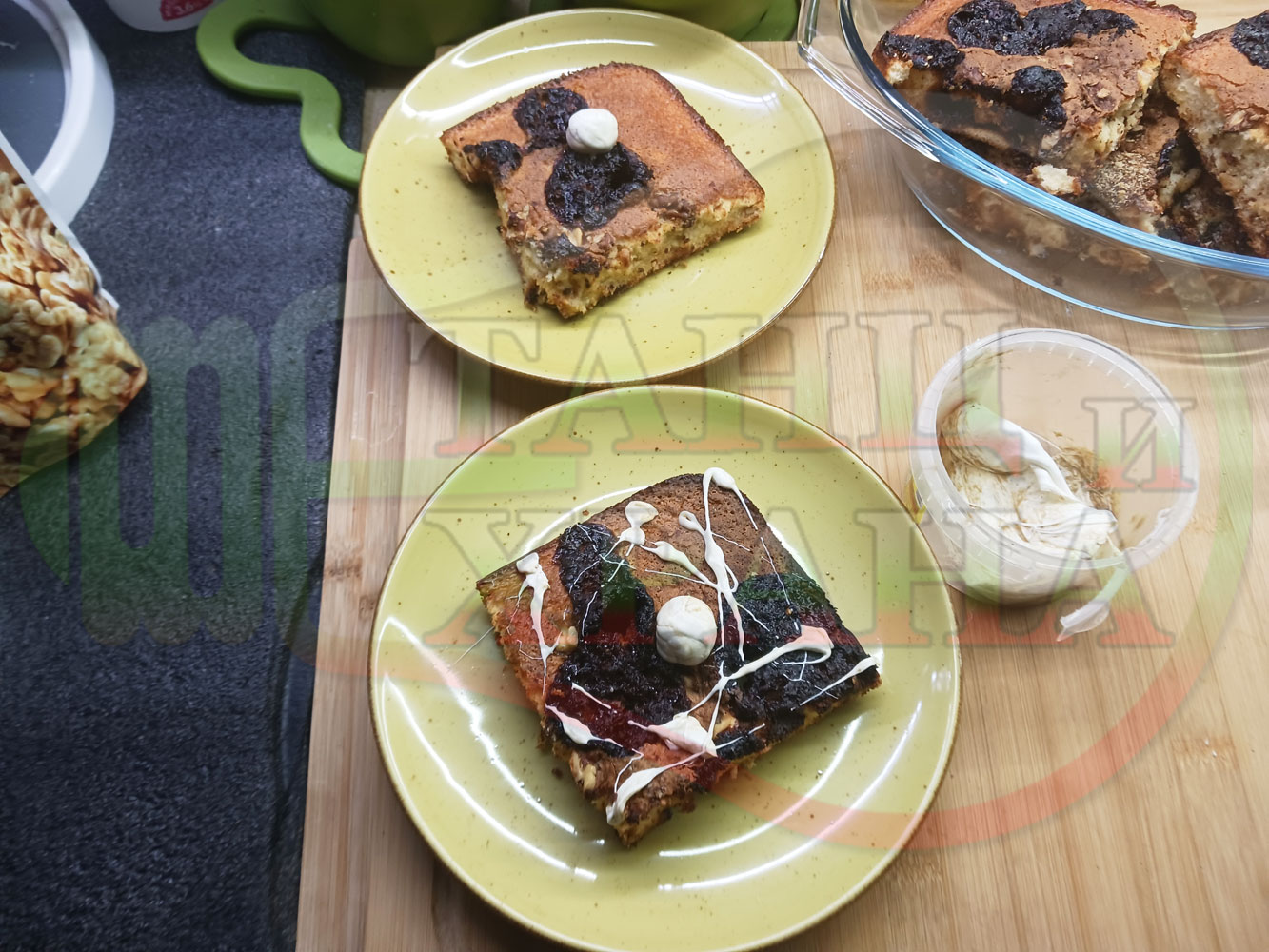 Български сладък кекс "Халвян орехов" приготвен с яйца, брашно, прясно мляко и кристална захар с плънка от топчета оформени от тахан халва от Ябланица и сурови орехи