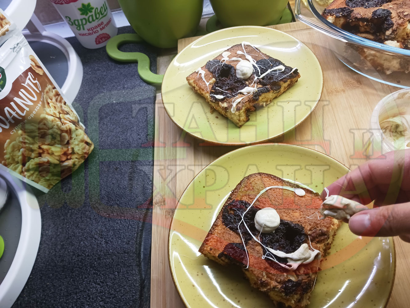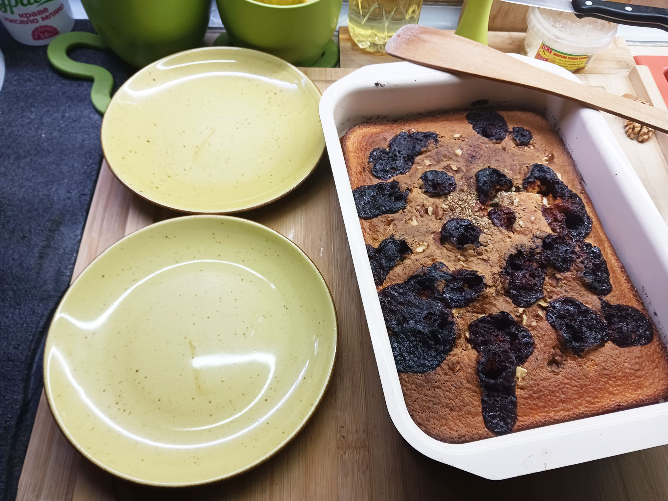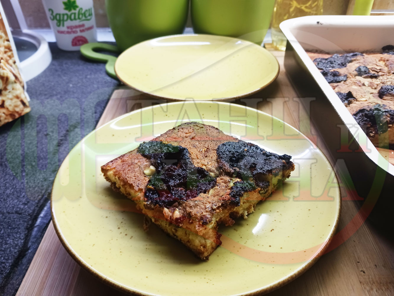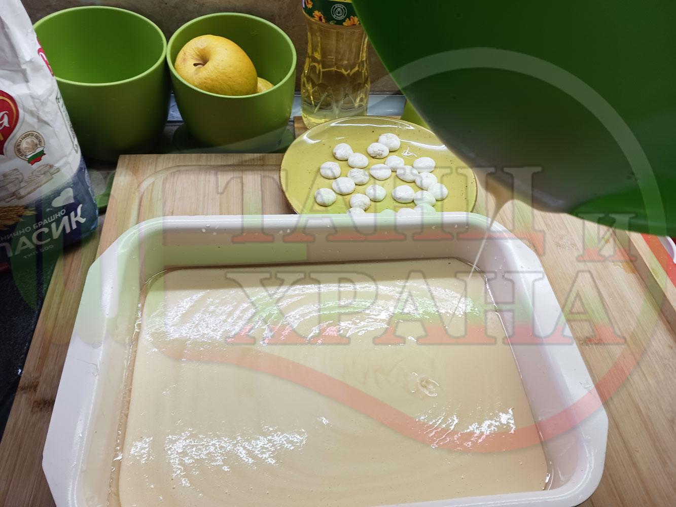 Български сладък кекс "Халвян орехов" приготвен с яйца, брашно, прясно мляко и кристална захар с плънка от топчета оформени от тахан халва от Ябланица и сурови орехи
