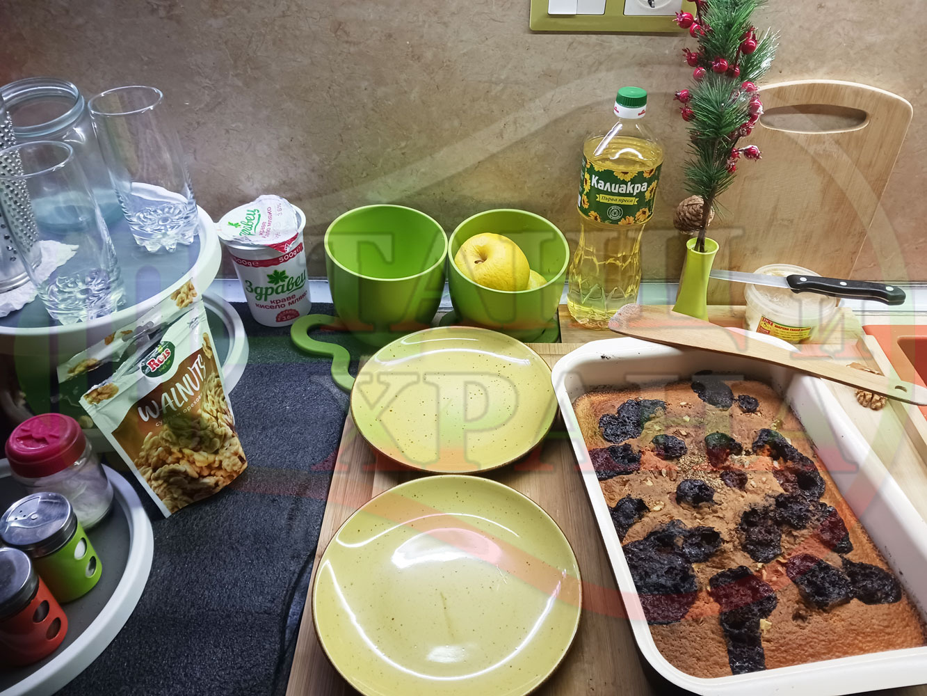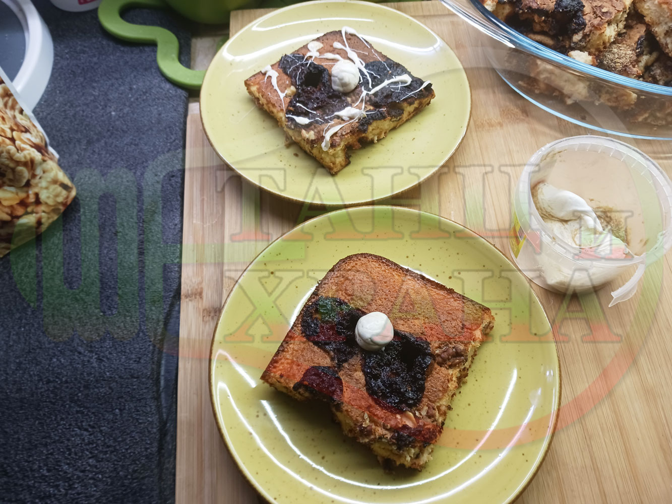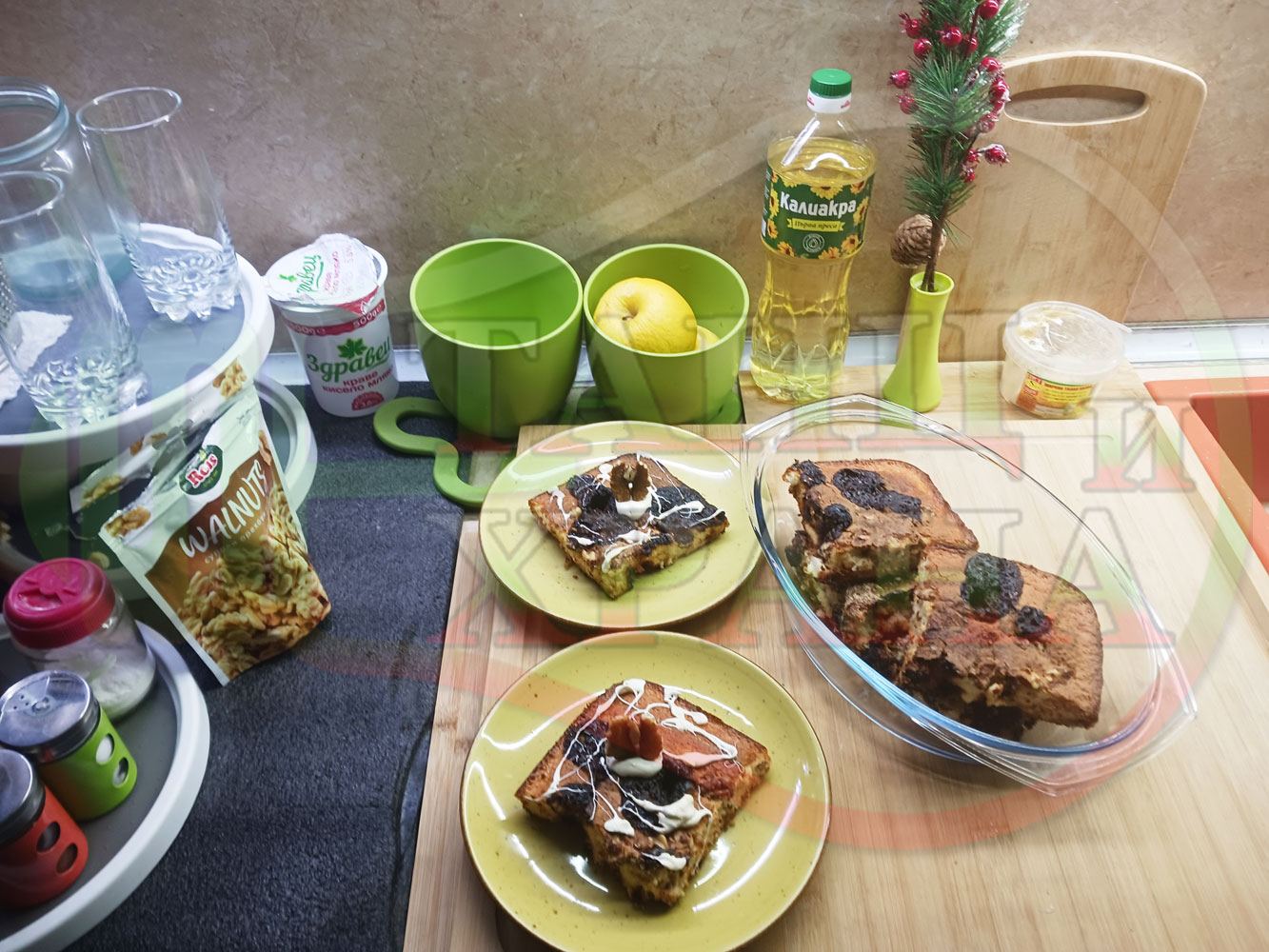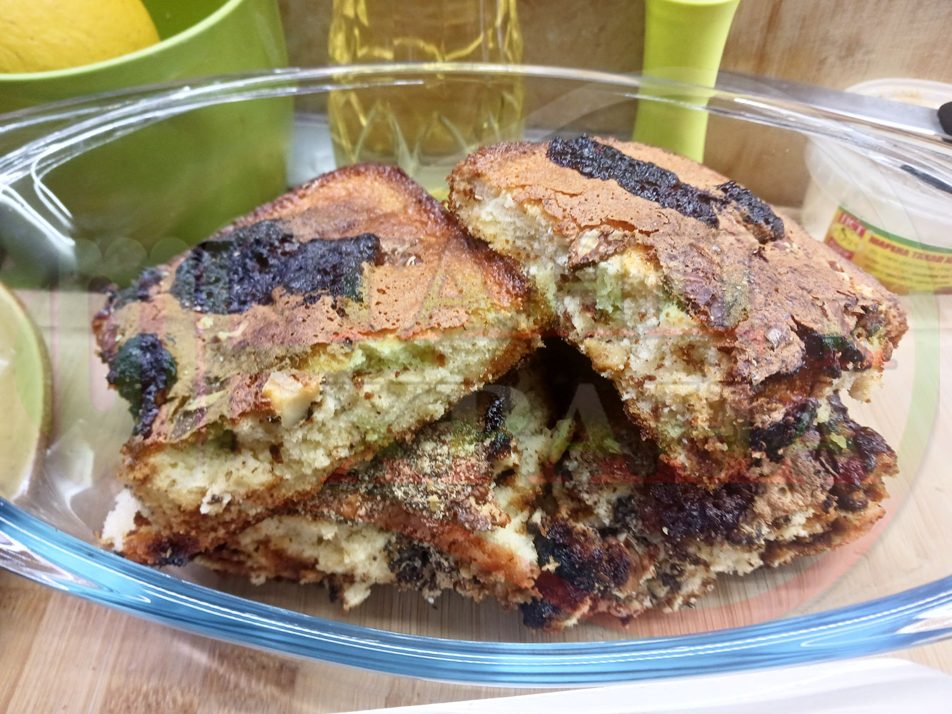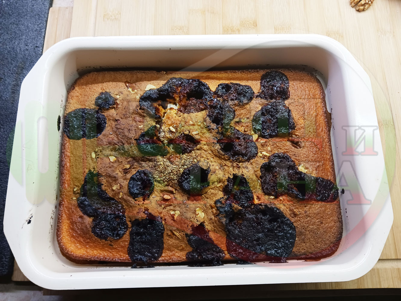 Български сладък кекс "Халвян орехов" приготвен с яйца, брашно, прясно мляко и кристална захар с плънка от топчета оформени от тахан халва от Ябланица и сурови орехи