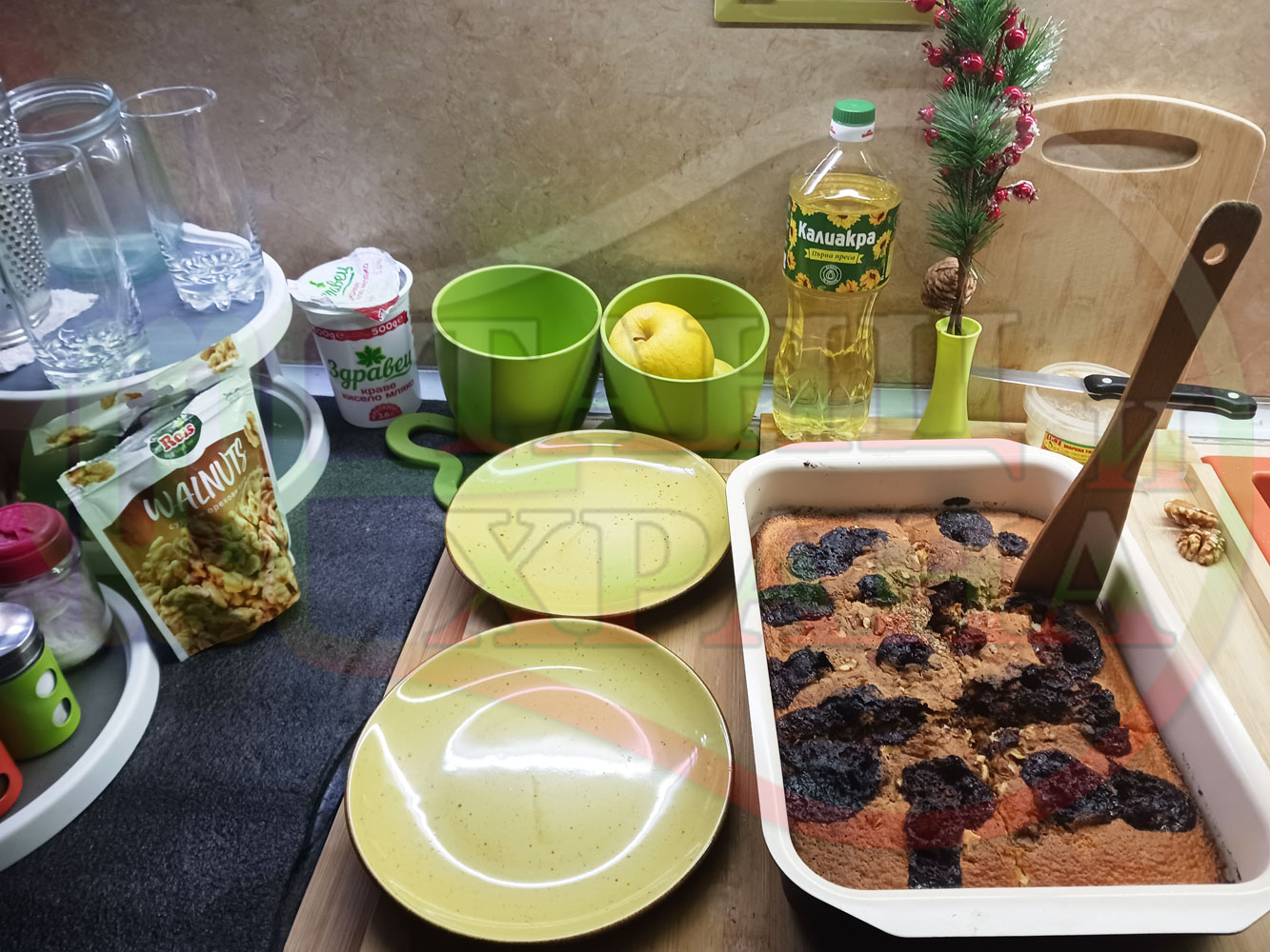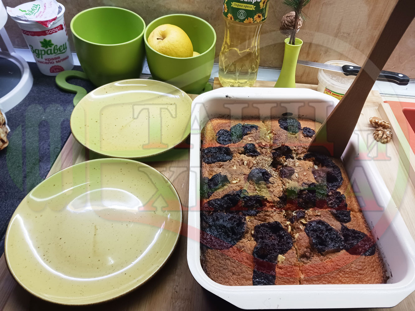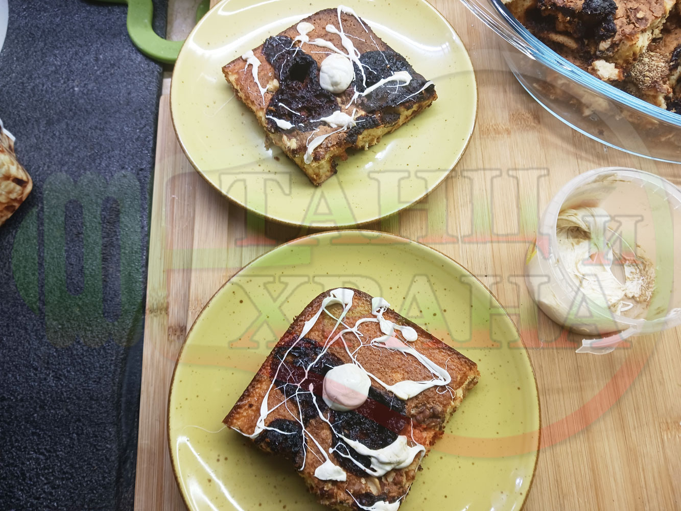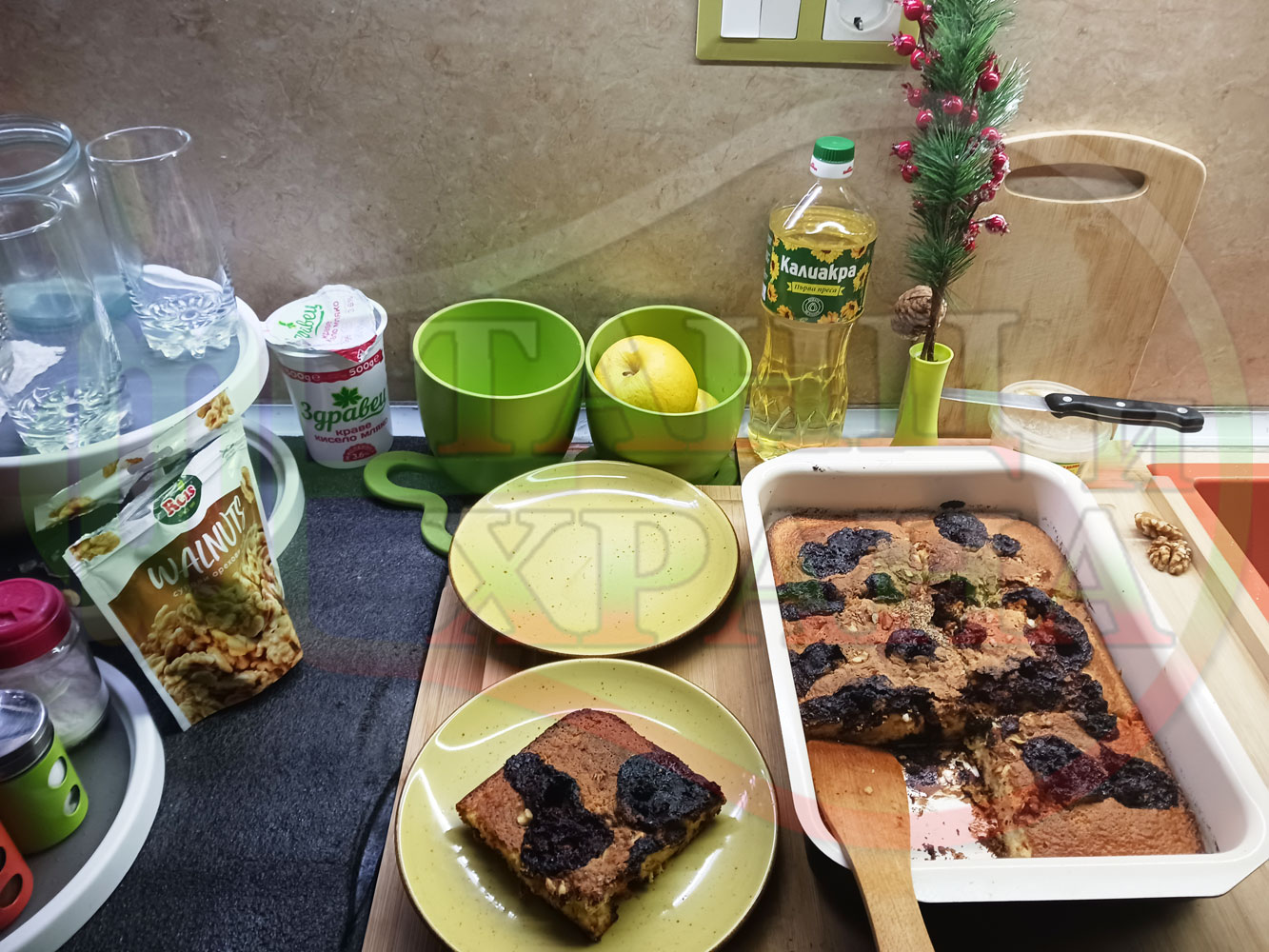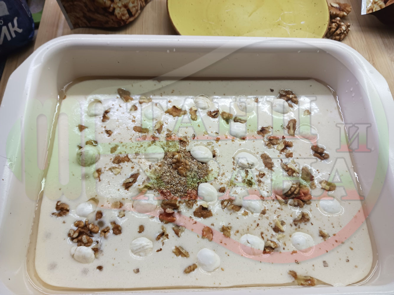 Български сладък кекс "Халвян орехов" приготвен с яйца, брашно, прясно мляко и кристална захар с плънка от топчета оформени от тахан халва от Ябланица и сурови орехи
