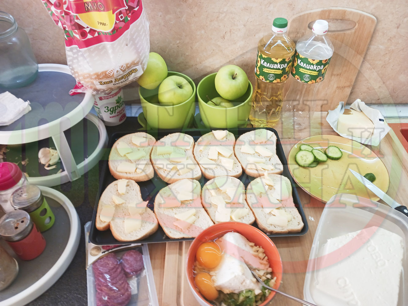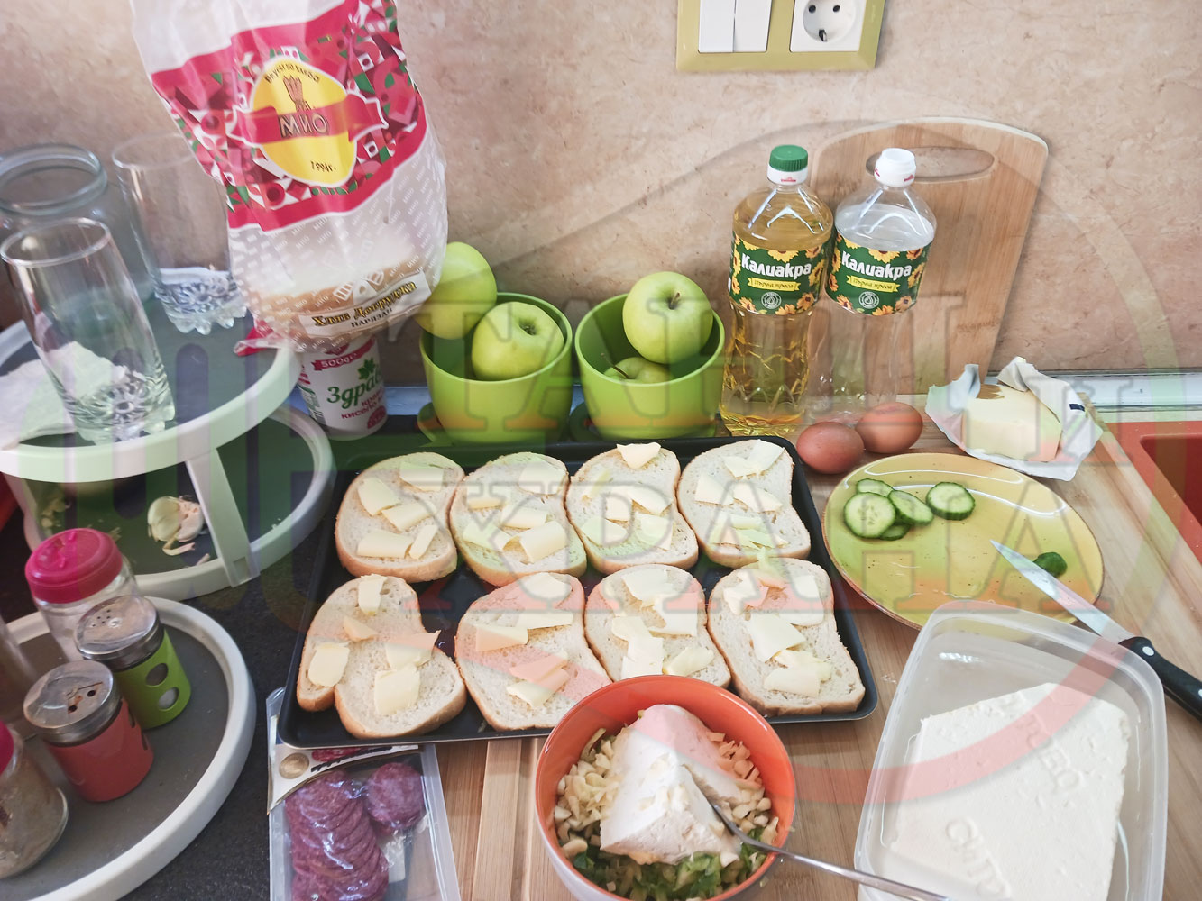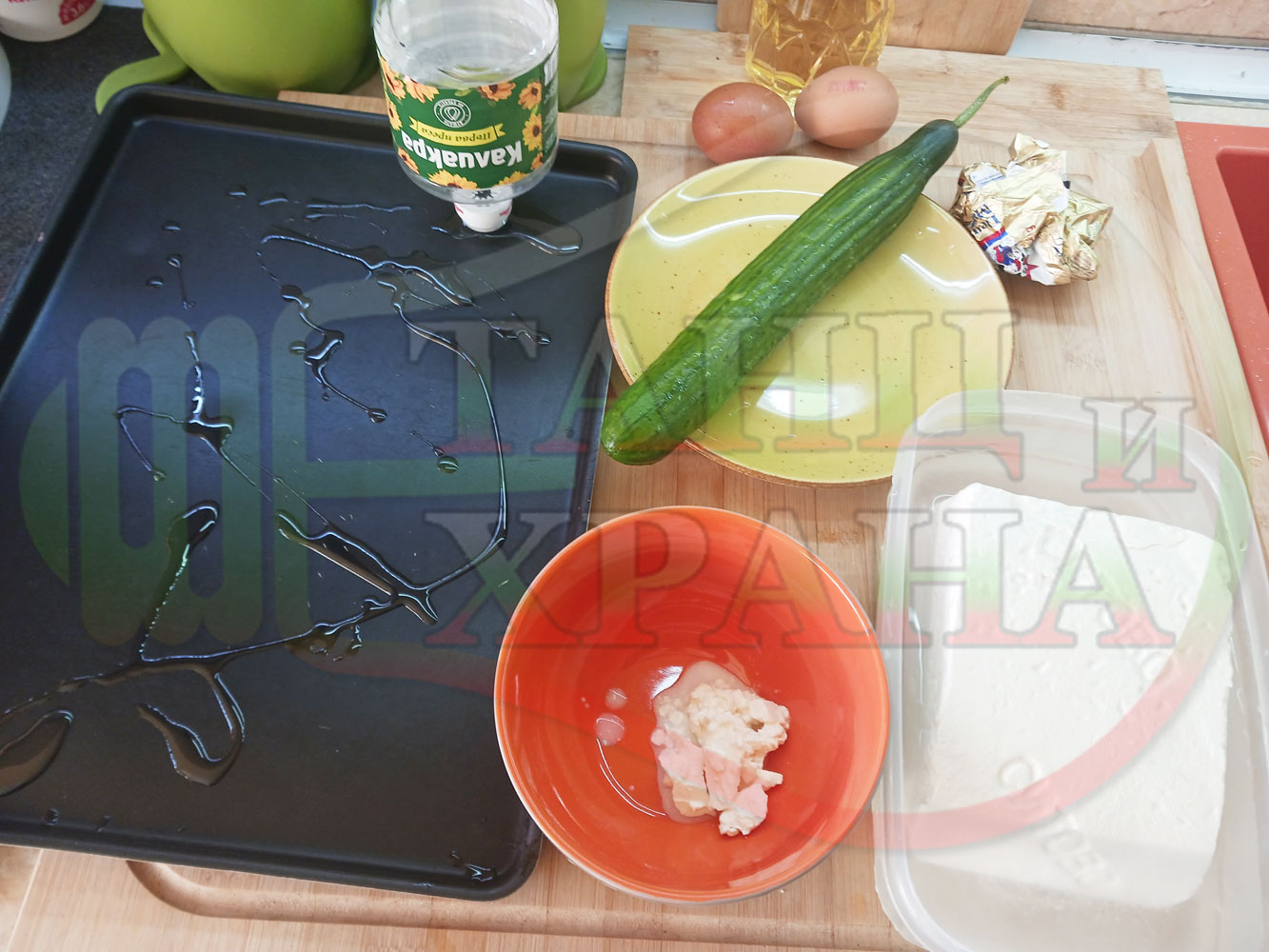 ПРОДУКТИ: Приблизителни количества за български филийки "Краставичнояйчени чеснови с БГсирене" запечени на фурна с краве масло, луканков колбас и яйчено сиренова плънка с пресни краставици, яйца, стар чесън и краве бяло сирене (българско, саламурено)