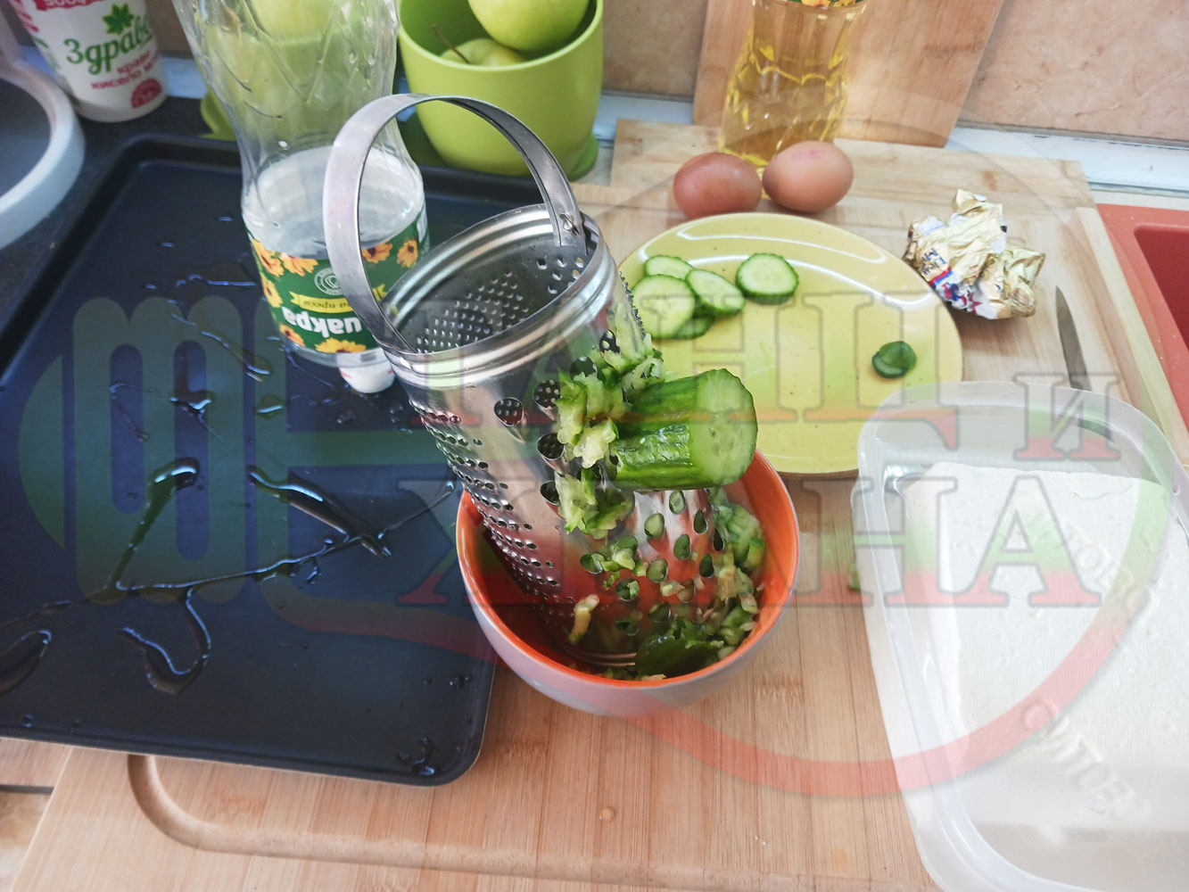 Измийте краставицата, настържете я на едро и добавете яйцата, обеления и нарязан на едро чесън и българското краве бяло саламурено сирене (нарежете част от краставицата на кръгчета за украса). Разбъркайте и намачкайте с вилица продуктите до образуване на средно гъста яйчено сиренова краставична, хомогенизирана плънка (яйчена плънка).