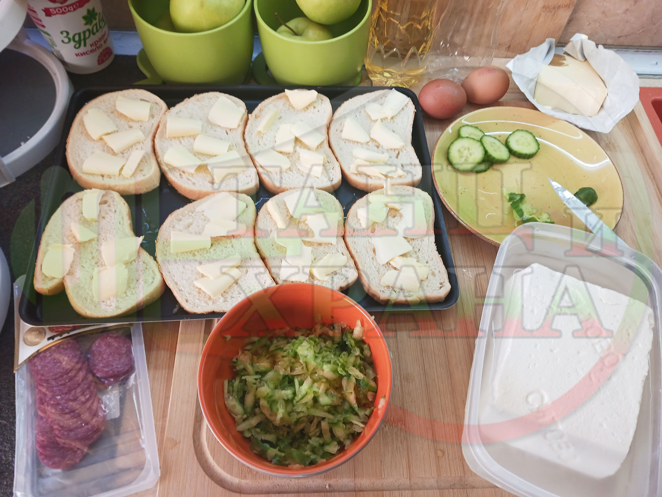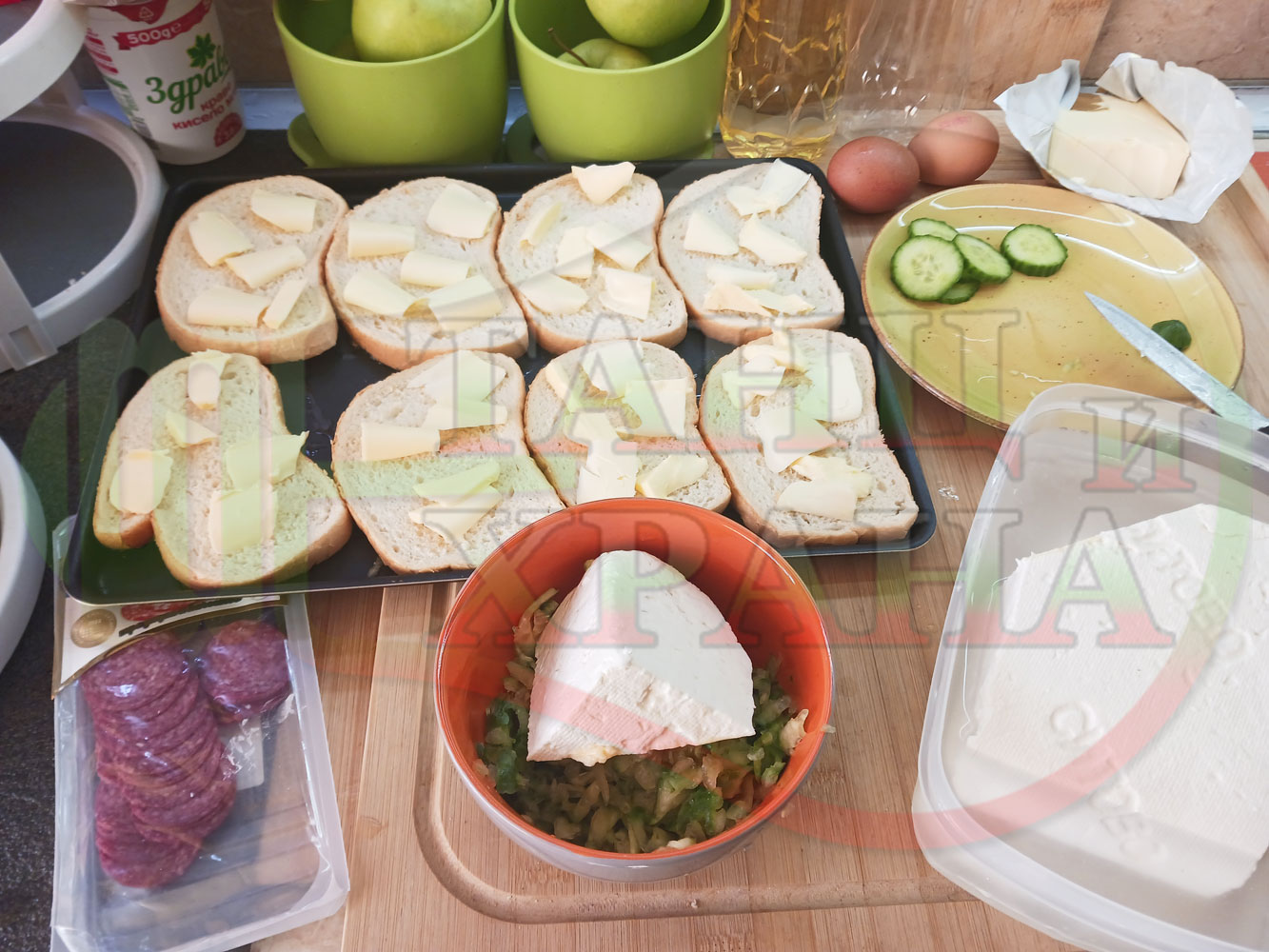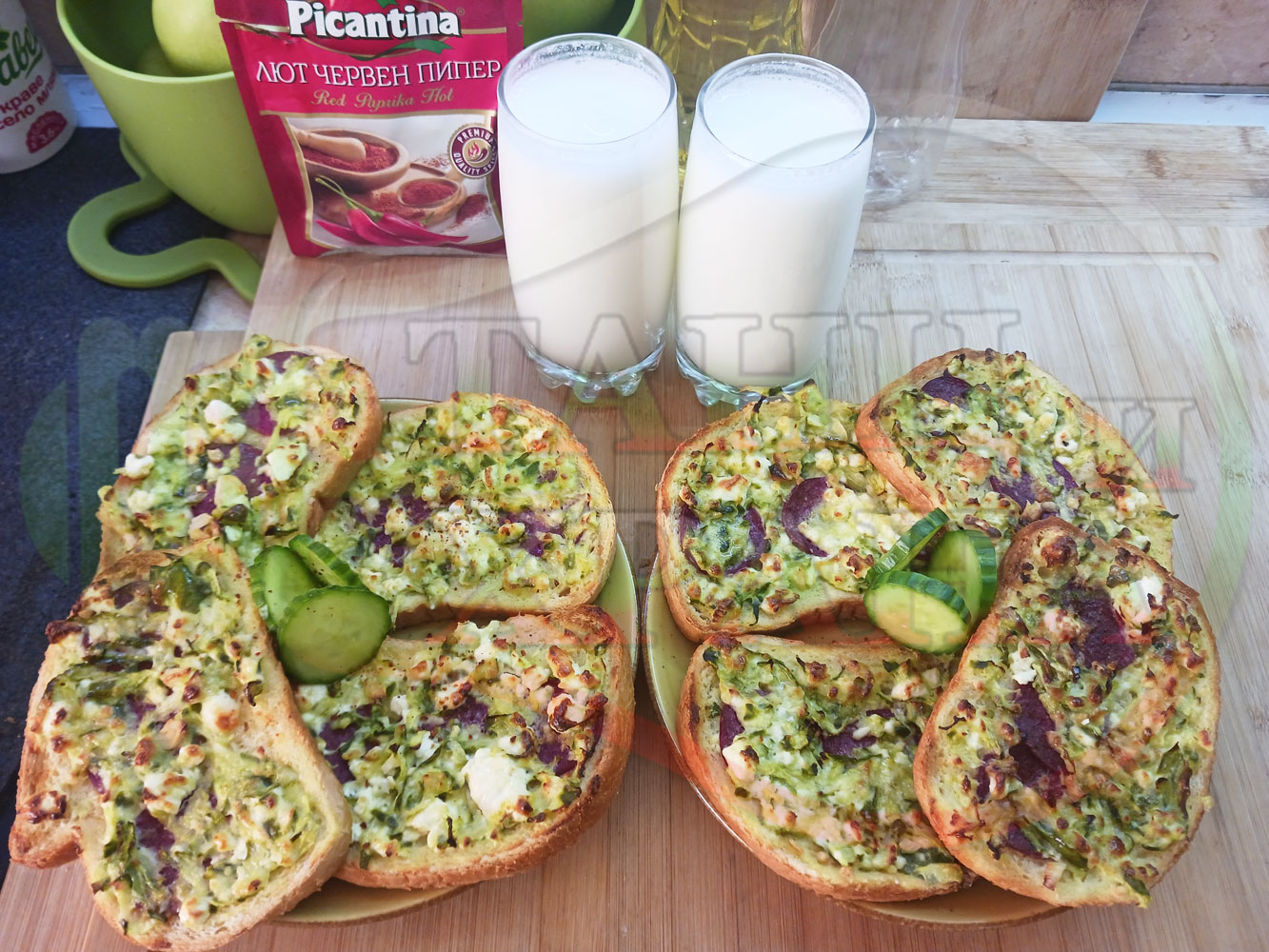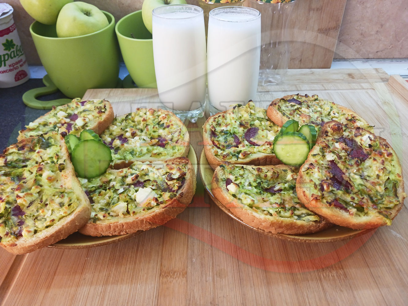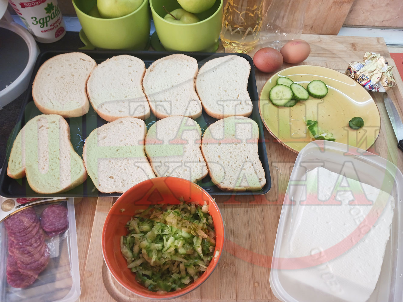Български филийки "Краставичнояйчени чеснови с БГсирене" запечени на фурна с краве масло, луканков колбас и яйчено сиренова плънка с пресни краставици, яйца, стар чесън и краве бяло сирене (българско, саламурено)