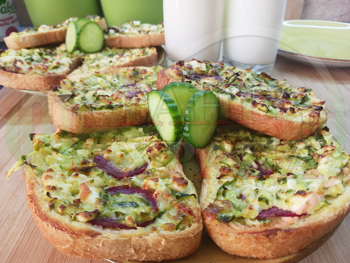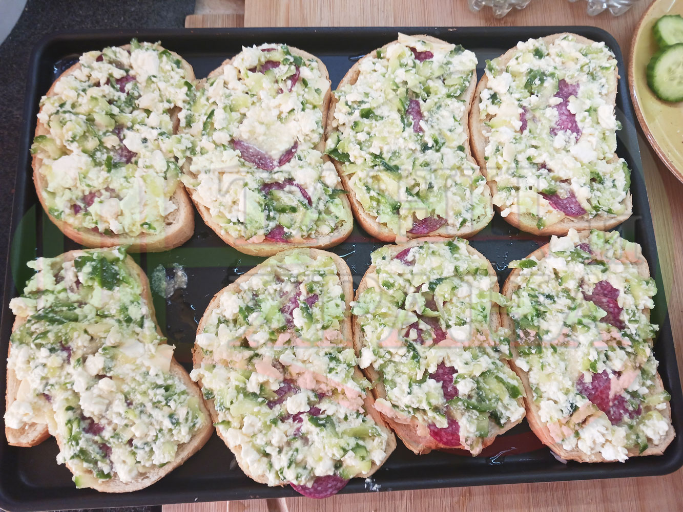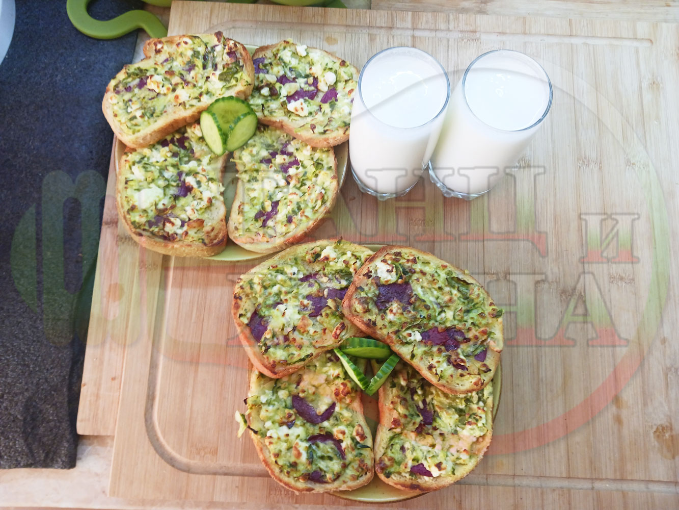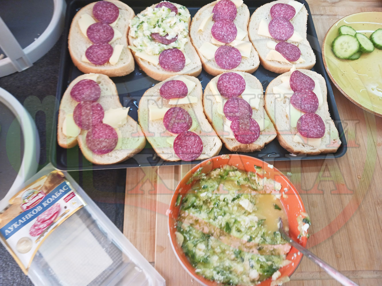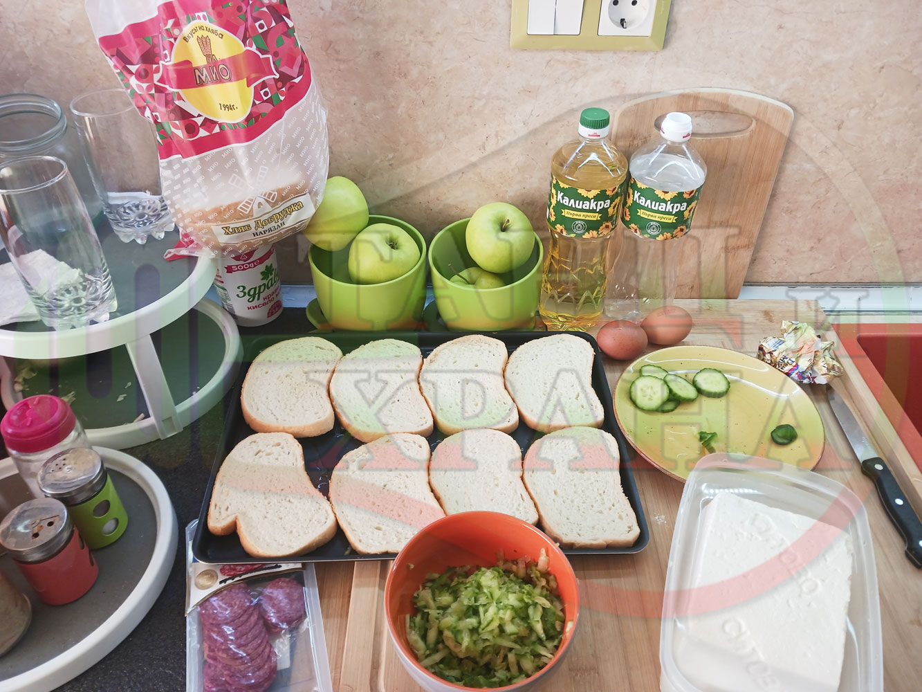 Български филийки "Краставичнояйчени чеснови с БГсирене" запечени на фурна с краве масло, луканков колбас и яйчено сиренова плънка с пресни краставици, яйца, стар чесън и краве бяло сирене (българско, саламурено)