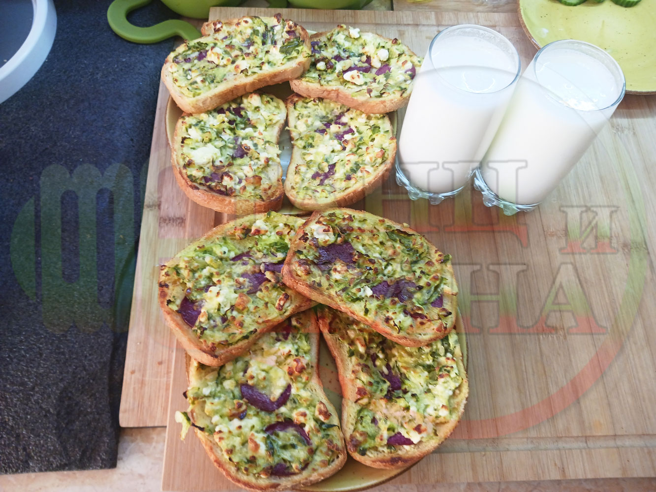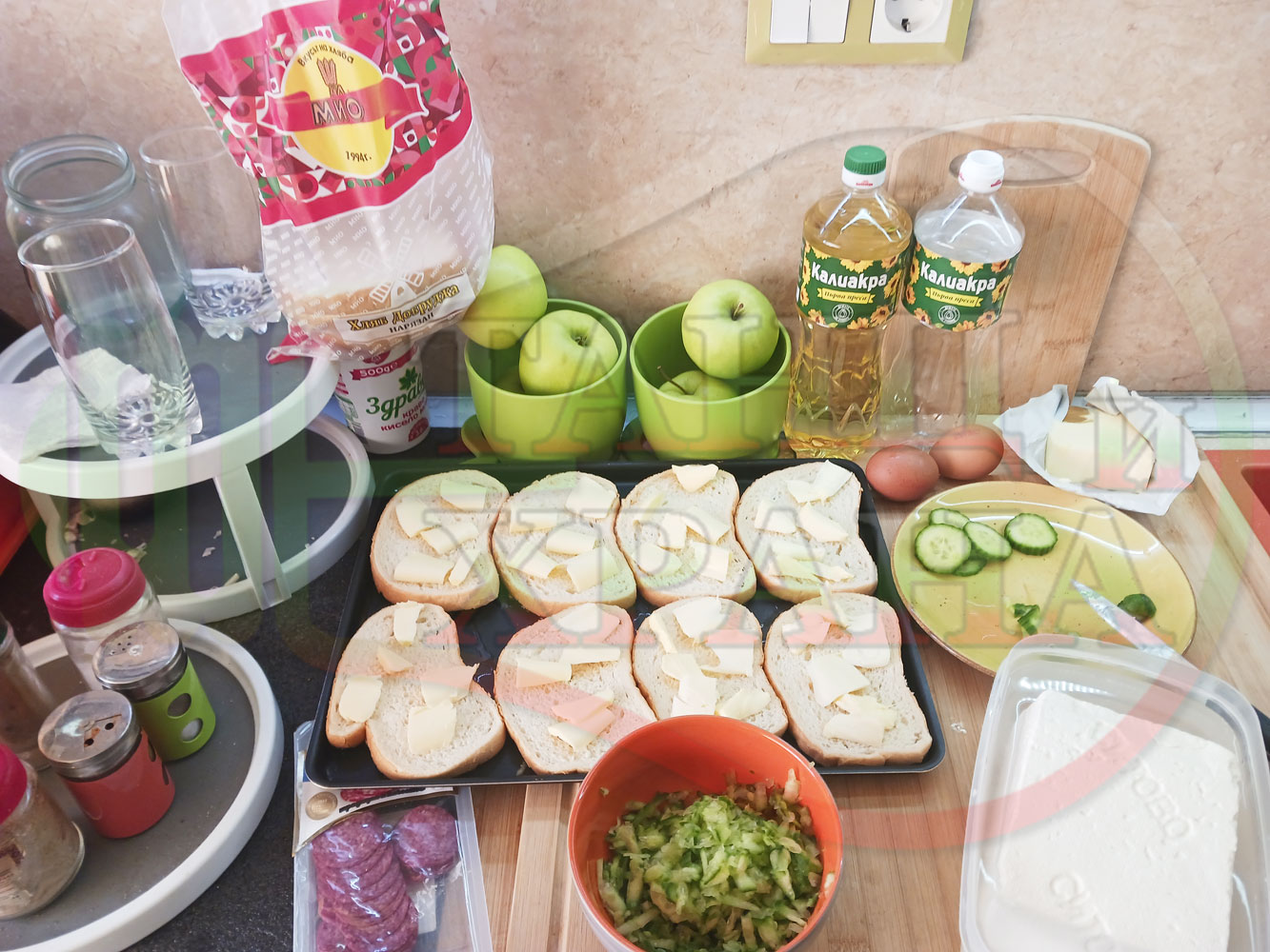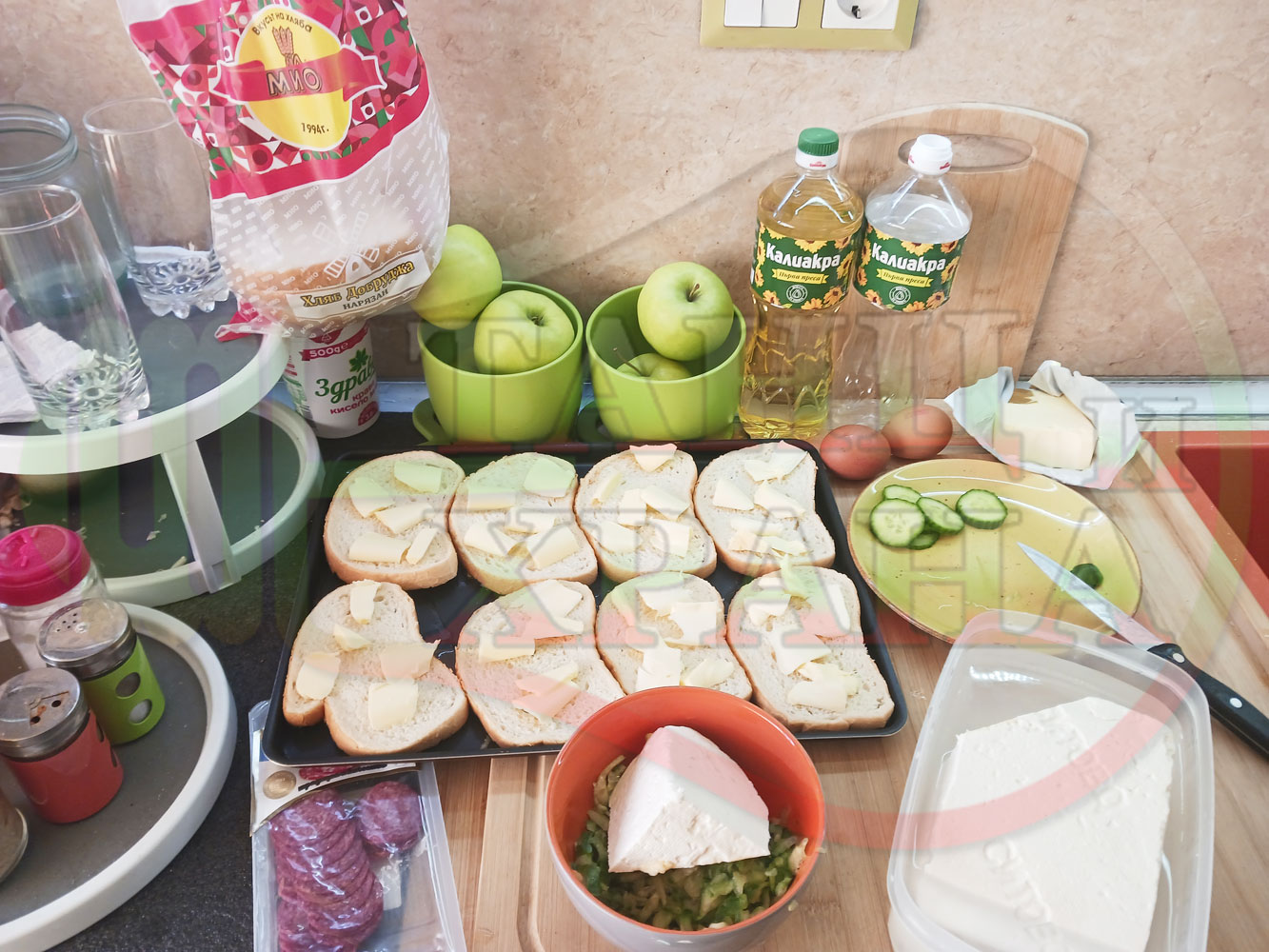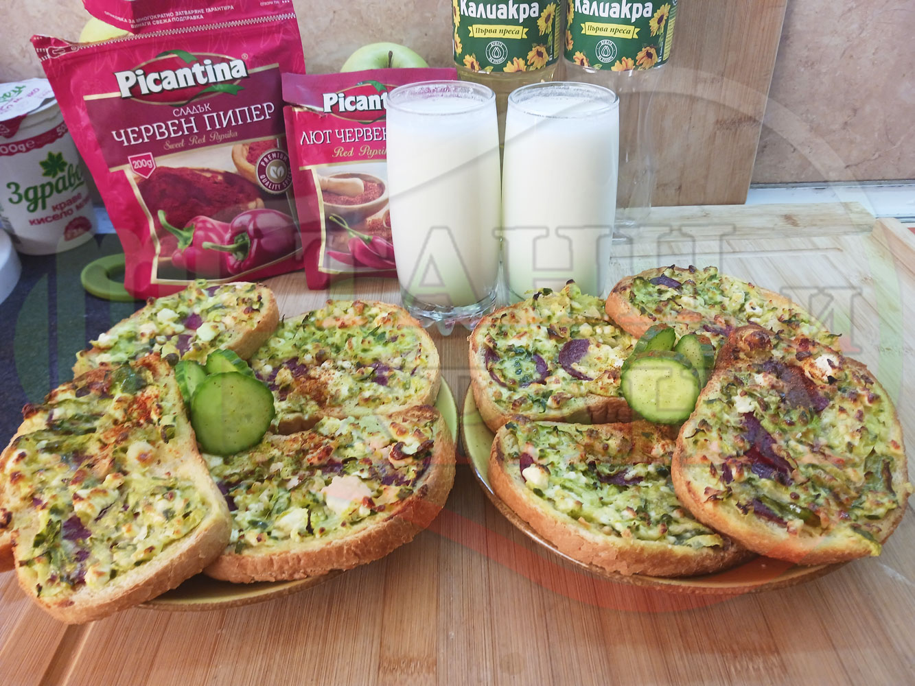 Български филийки "Краставичнояйчени чеснови с БГсирене" запечени на фурна с краве масло, луканков колбас и яйчено сиренова плънка с пресни краставици, яйца, стар чесън и краве бяло сирене (българско, саламурено)